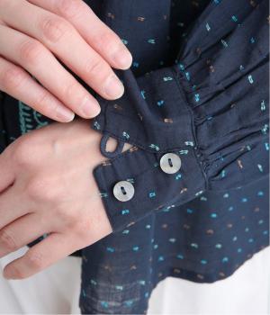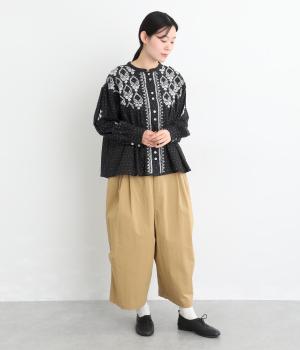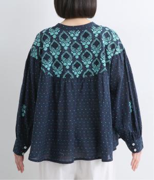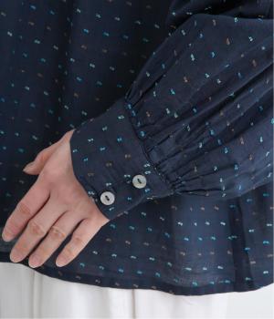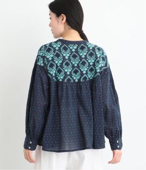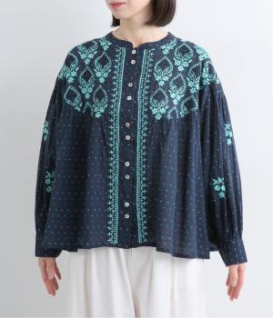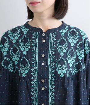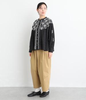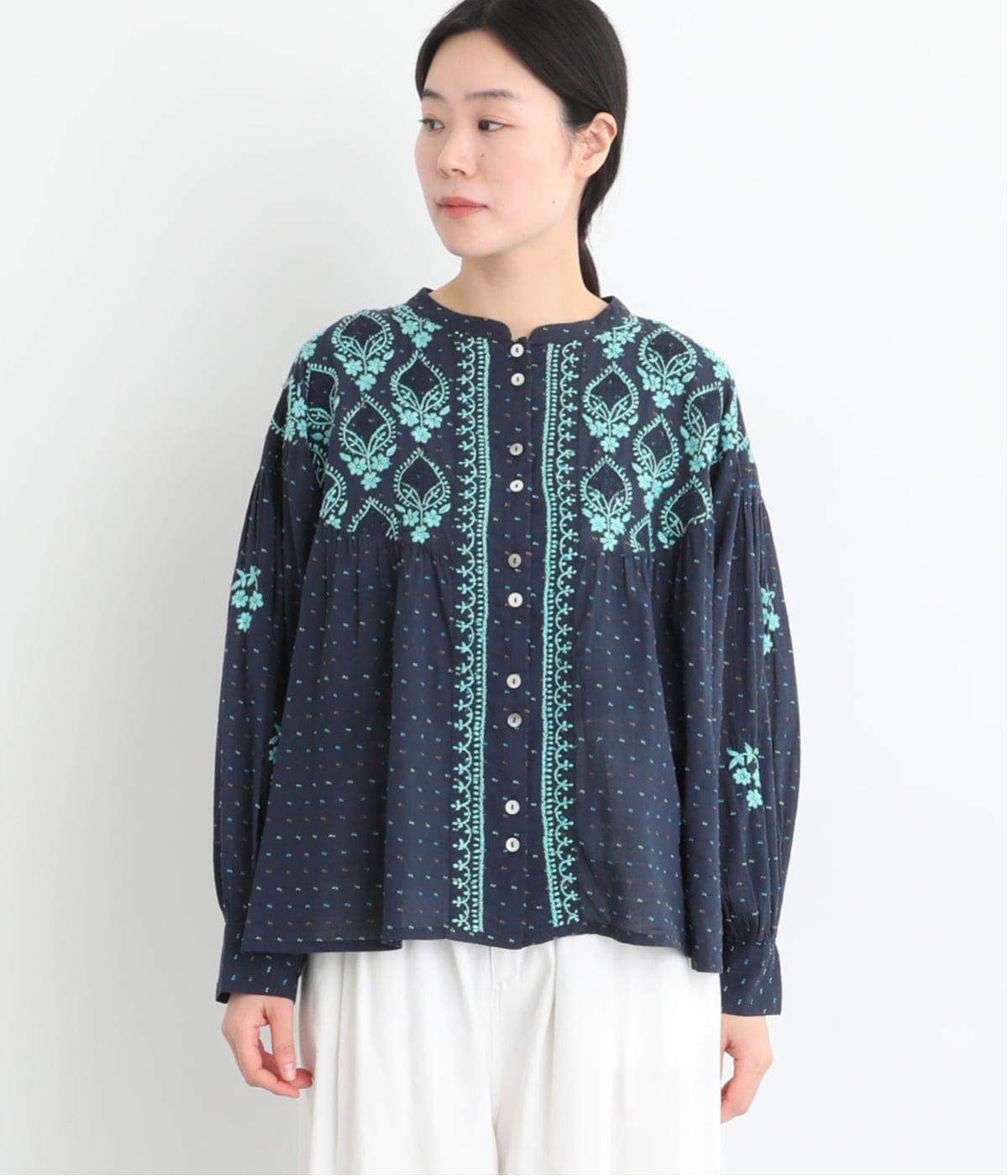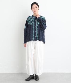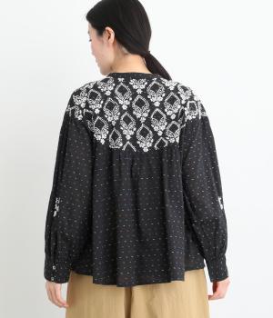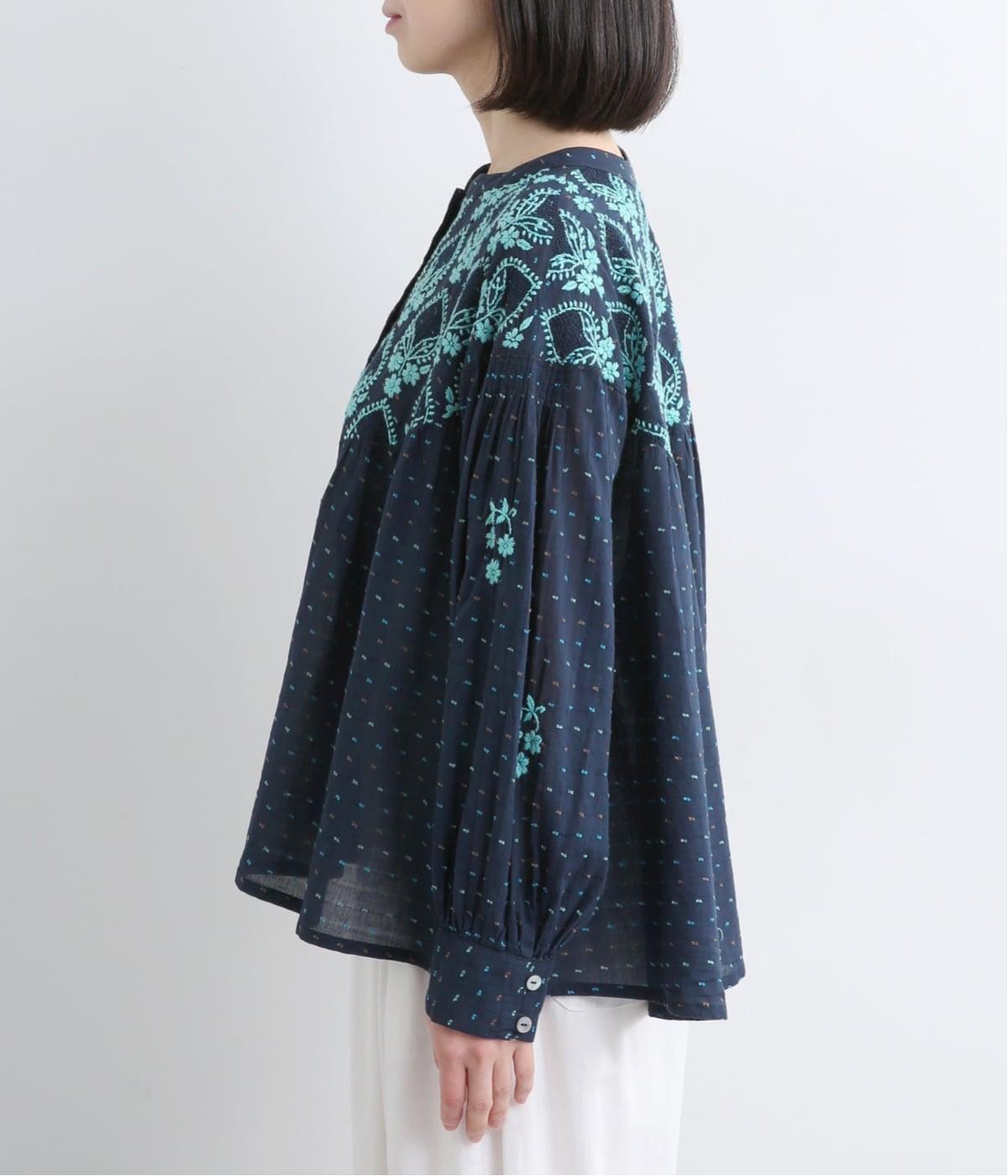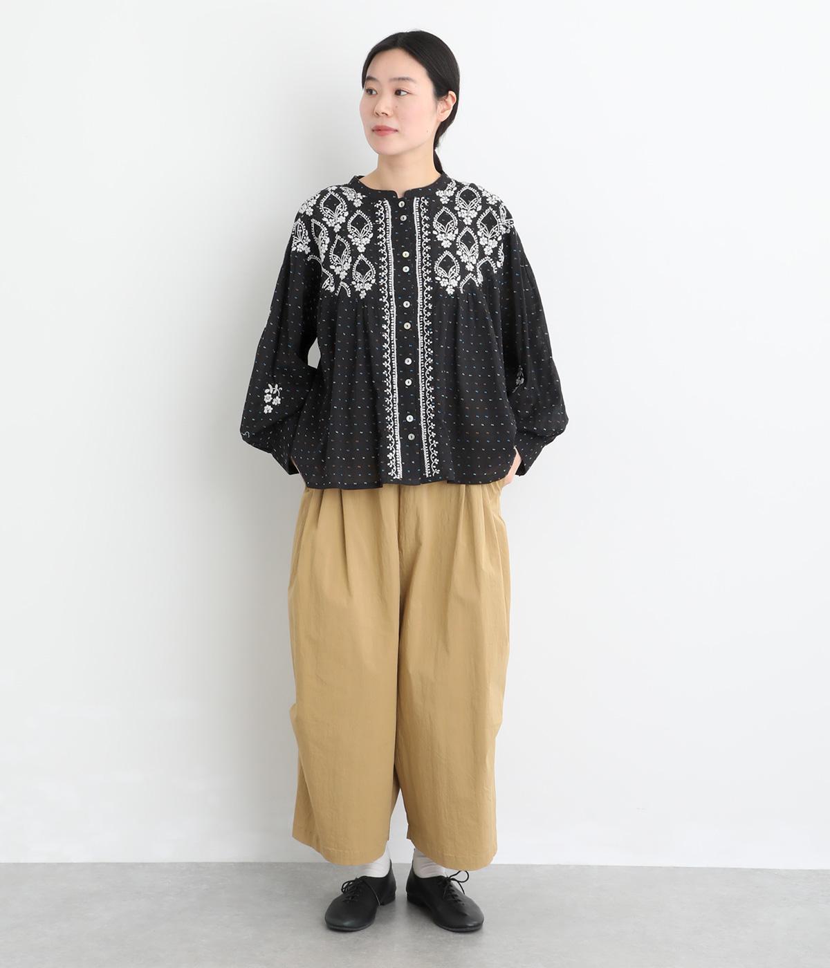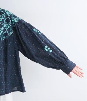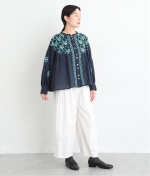 表情豊かなドビー生地に手刺しゅうを贅沢にほどこしたブラウス。華やかさの中に、手しごとならではの温もりを感じます。前立ての縦ラインが全体のバランスを引き締め、ふたつ並んだボタンがさりげないアクセントに。