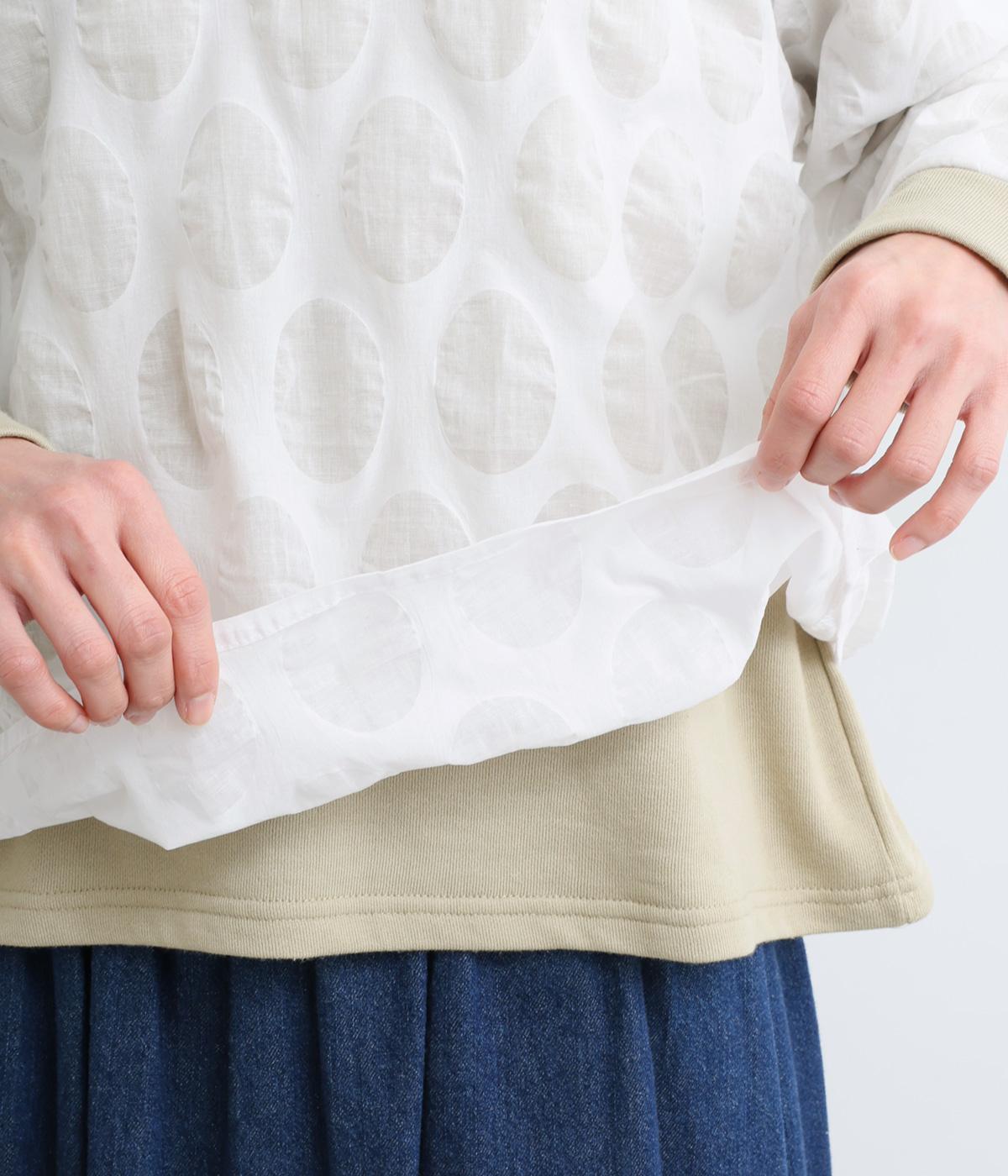 塩縮ドットの透け感ある布帛生地と伸縮性があり肌触りのいい裏毛生地をドッキング。裏毛はコットンにポリエステルをまぜているので速乾性良く適度に軽やかです。