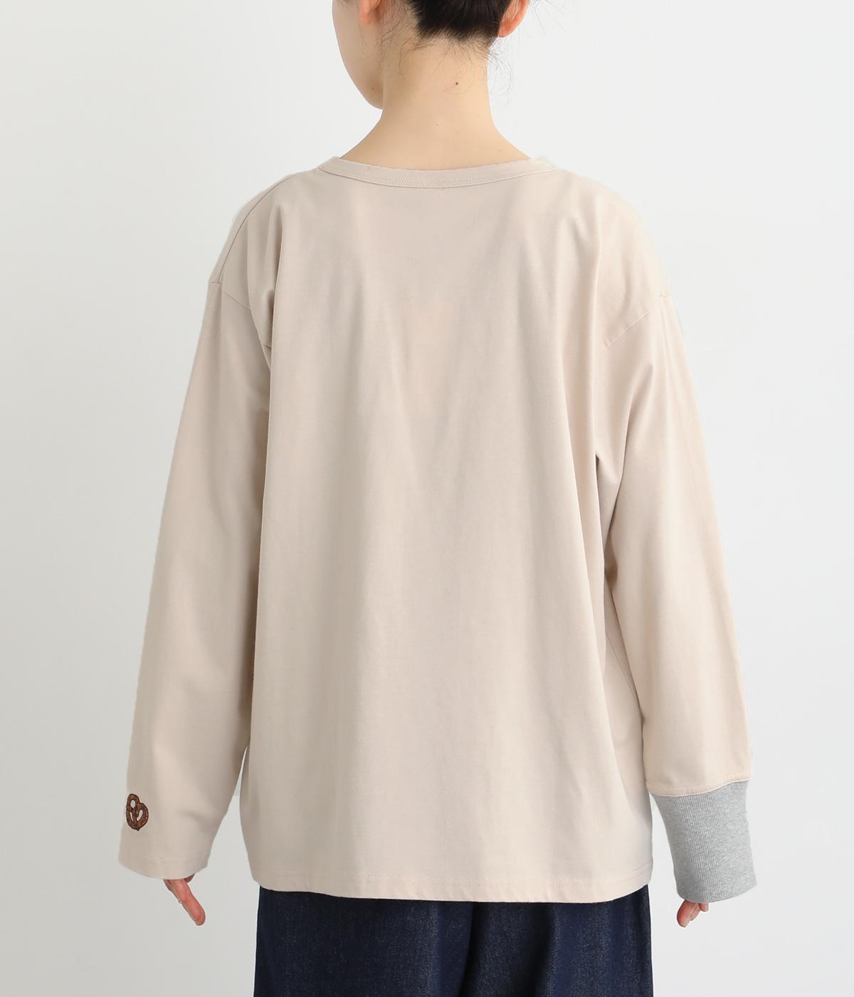 片方だけ太いリブ仕様の袖口が目をひくデザイン。もう片方には、ほんわかした雰囲気のおやつ模様の刺しゅうをほどこしました。胸にもロゴ刺しゅうを入れ、シンプルなシルエットに個性が散りばめられた一枚です。