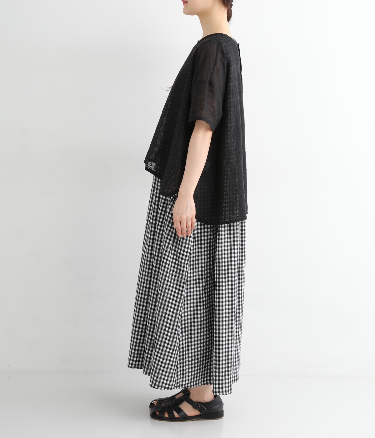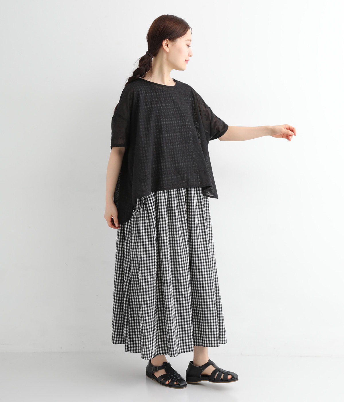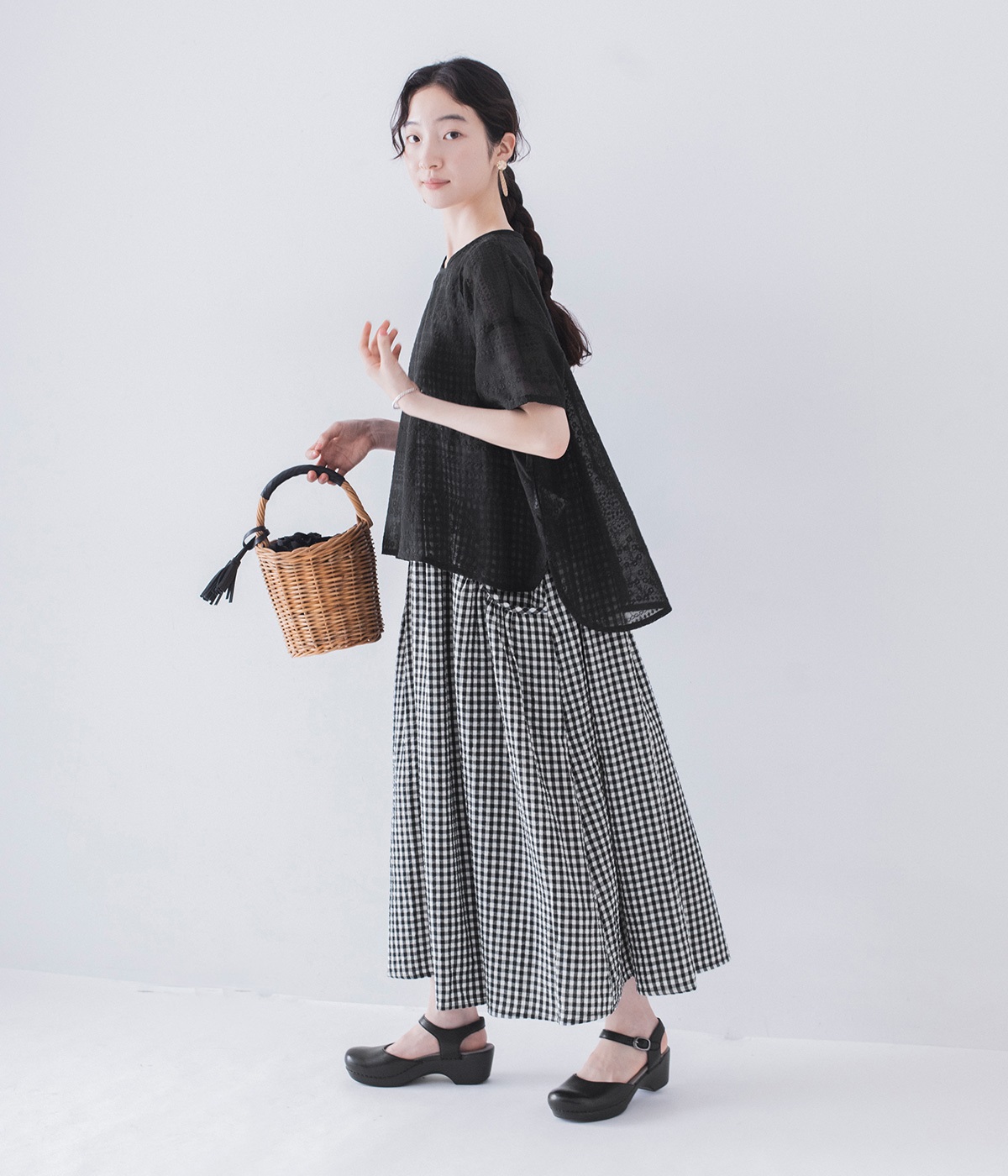 ほんのりとした透け感とハリ感が、夏のブラックを軽やかに。シンプルながらも印象に残る、大人かわいいブラックスタイルです。