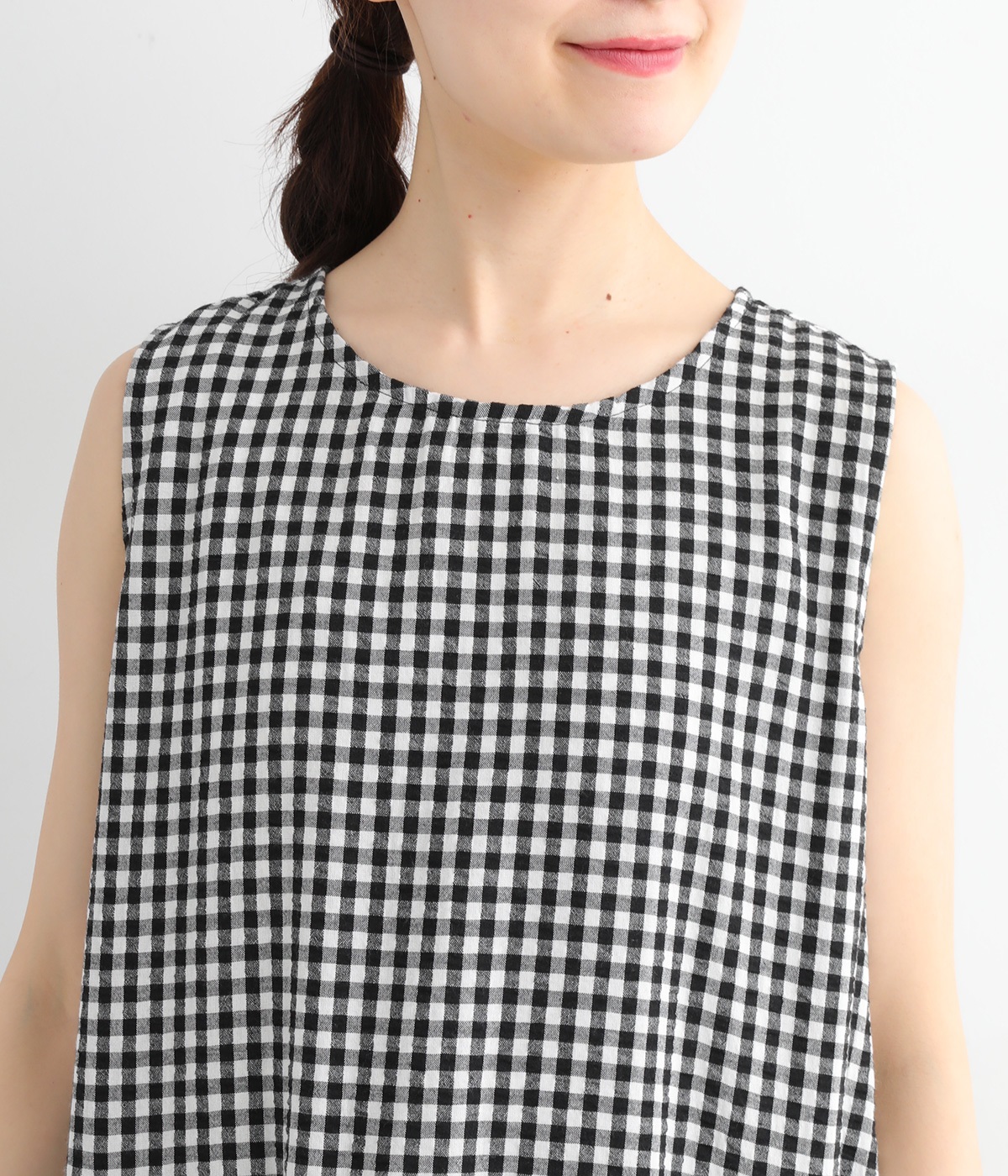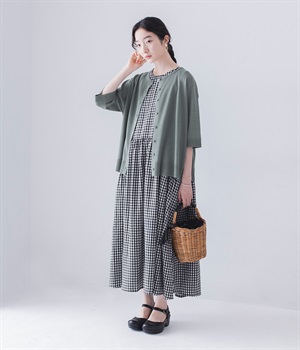 ほどよい柄行きがカジュアル感を抑え、上品な愛らしさを引き立てます。甘すぎないモノトーンで、心地よく着られる夏の装いにぴったり。