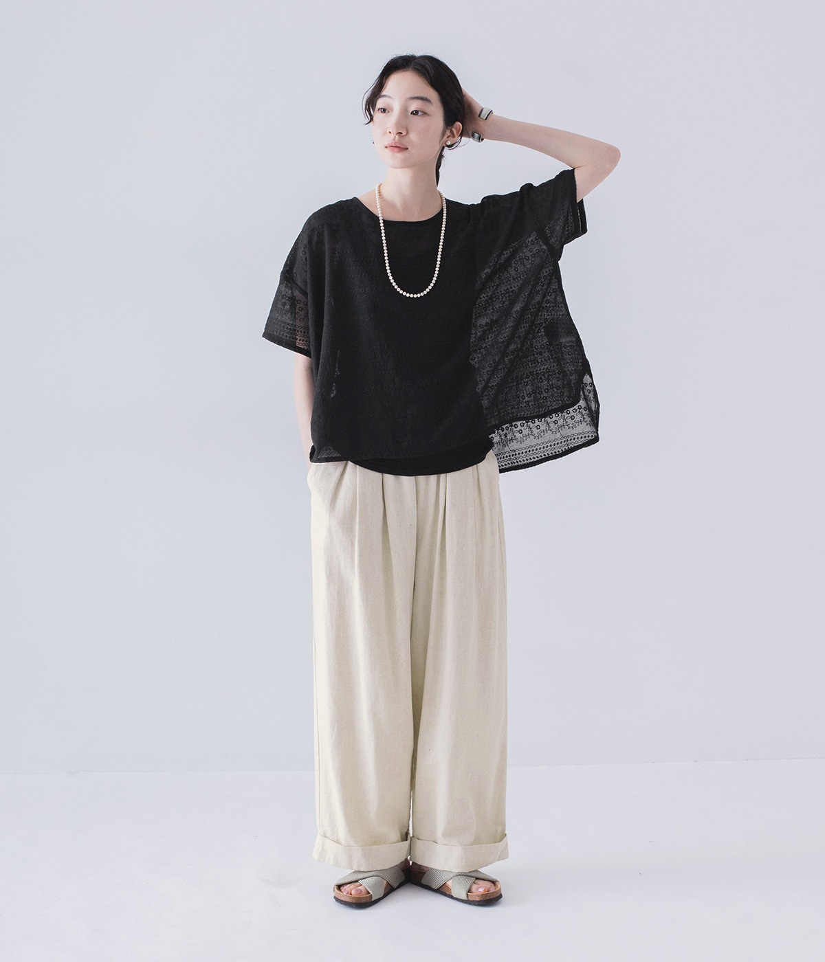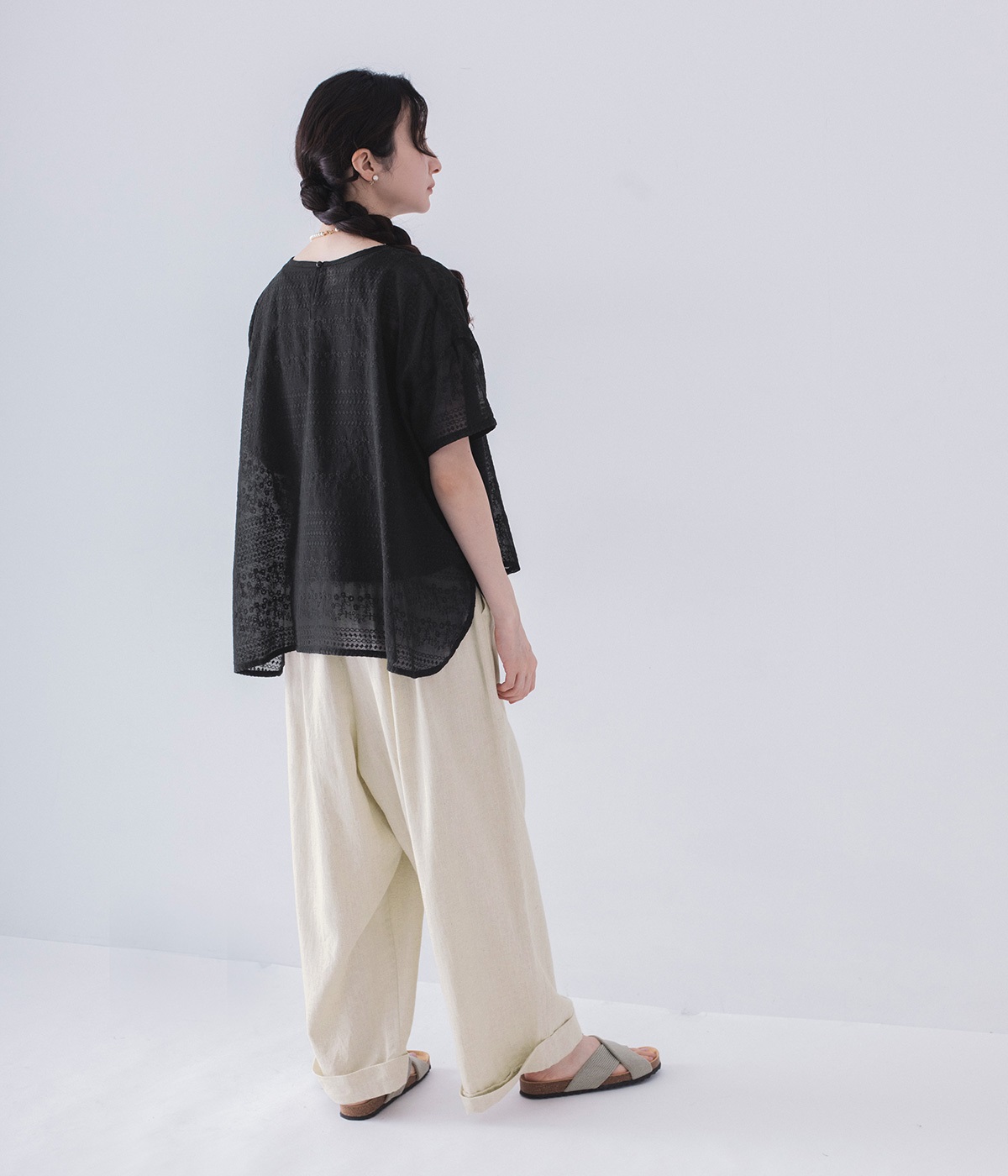 繊細な刺しゅうのブラウスに、ナチュラルなワイドパンツを合わせて。