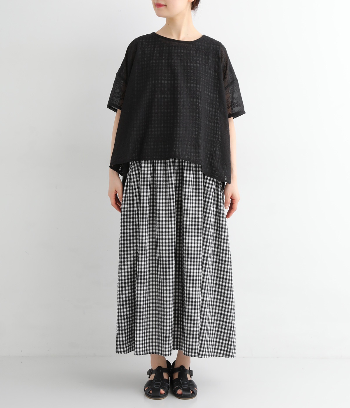 プルオーバーは透け感と刺繍が華やかで、シンプルなアイテムにレイヤードするのがおすすめ。ワンピースには、ポコポコとしたナチュラルな表情が爽やかなサッカー地を使用しています。