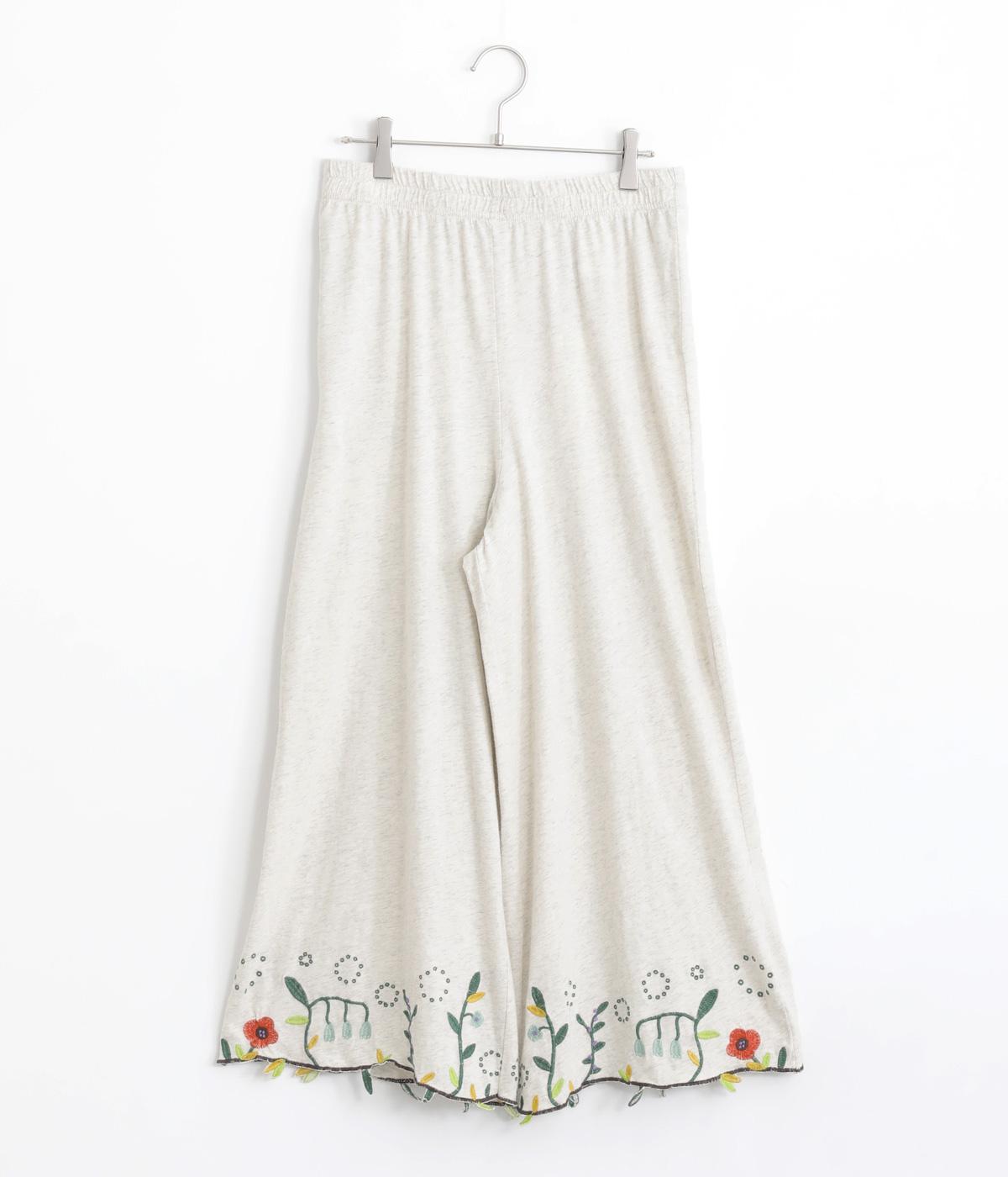 レイヤードスタイルに活躍するペチコートパンツの裾に、植物柄の刺しゅうをそえた可愛らしい一枚。足元を一気に華やかに魅せてくれるので、いつものスタイリングもぐっと新鮮になります。ウエストは総ゴムのフィット感ある仕立て。