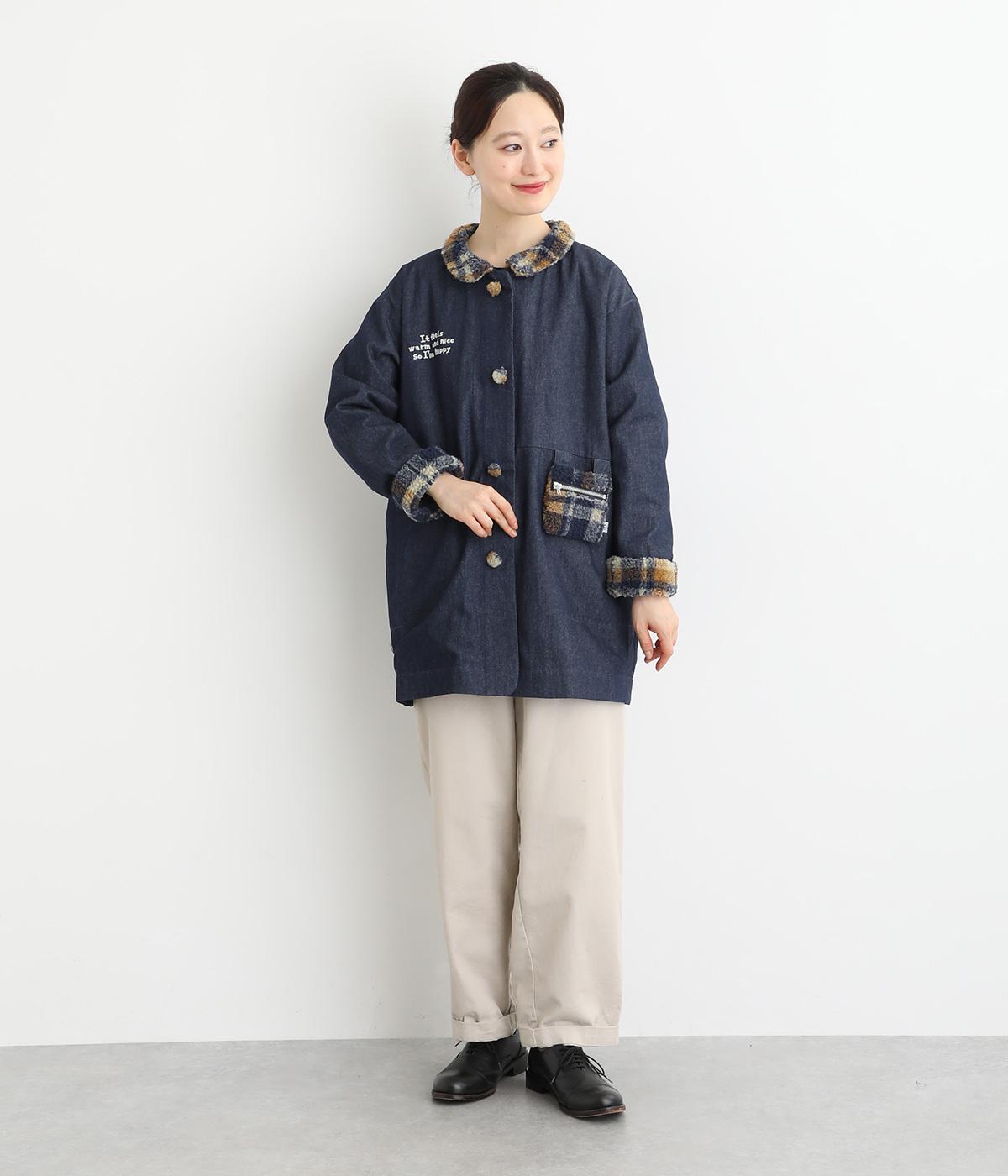 襟、ボタン、袖口、ポケットにチェック柄のボアをあしらったミドルコートです。胸元のメッセージ刺しゅうもあたたかみを添えています。かわいらしさのあるカジュアルなアイテムに仕上がりました。