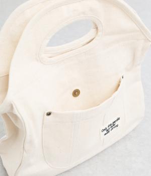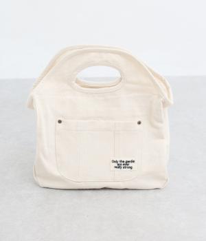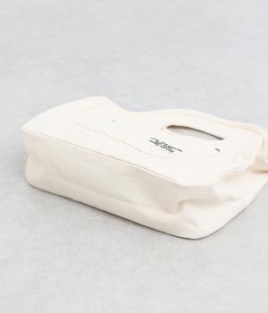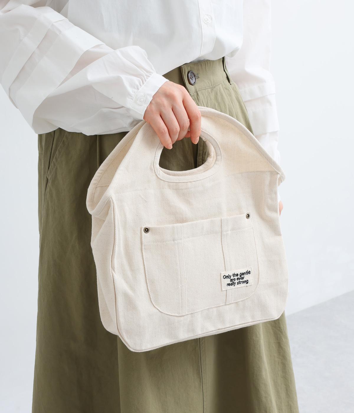 くりぬきハンドルにロゴ刺しゅうが特徴的なミニバッグ。ファスナー仕様に外ポケットつきで実用性のある作りも好評価。ラフに持ち歩きやすく使い勝手も抜群で、近所のお使いからお出掛けまで幅広く活躍します。