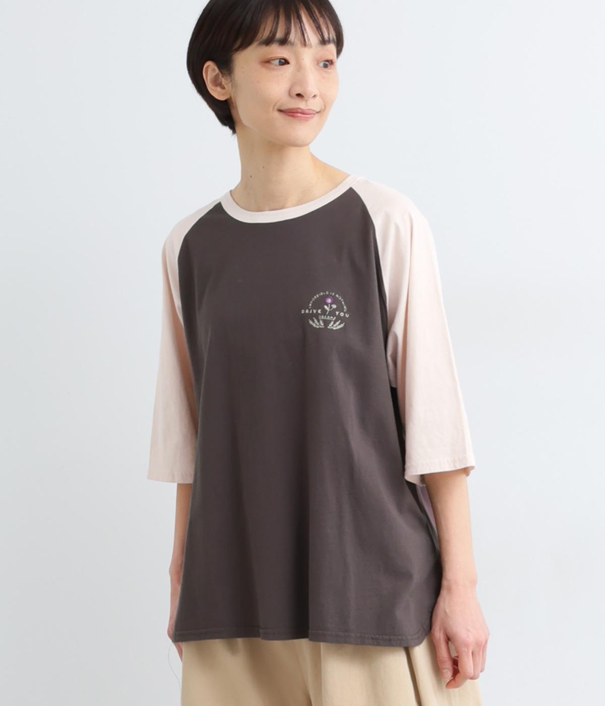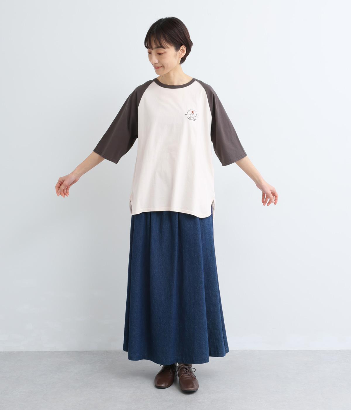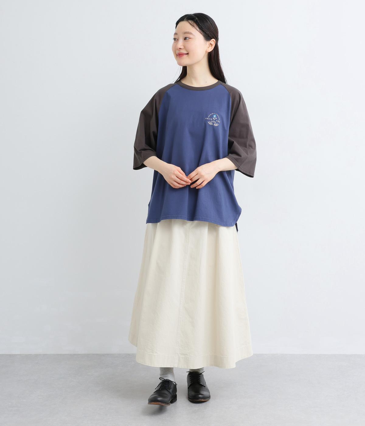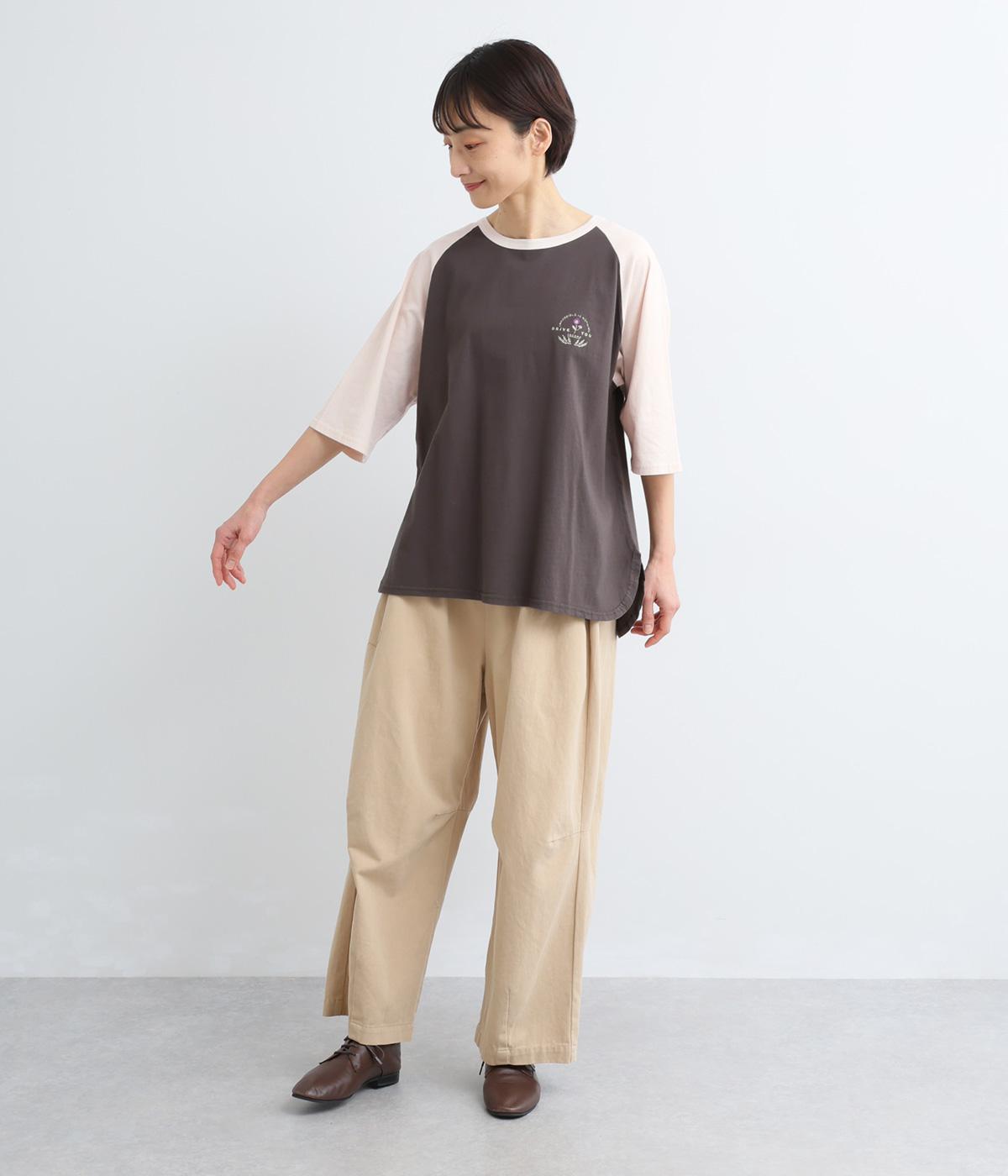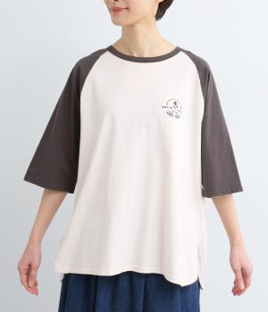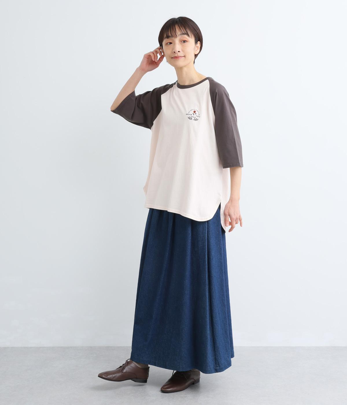 左胸のロゴ刺しゅうとラグラン配色が特徴的な一枚。カジュアル要素を取り入れながらも刺しゅうの花モチーフやゆとりのあるシルエットでナチュラルテイストにまとめています。ラウンド裾は前後差をつけて横姿に動きをプラス。