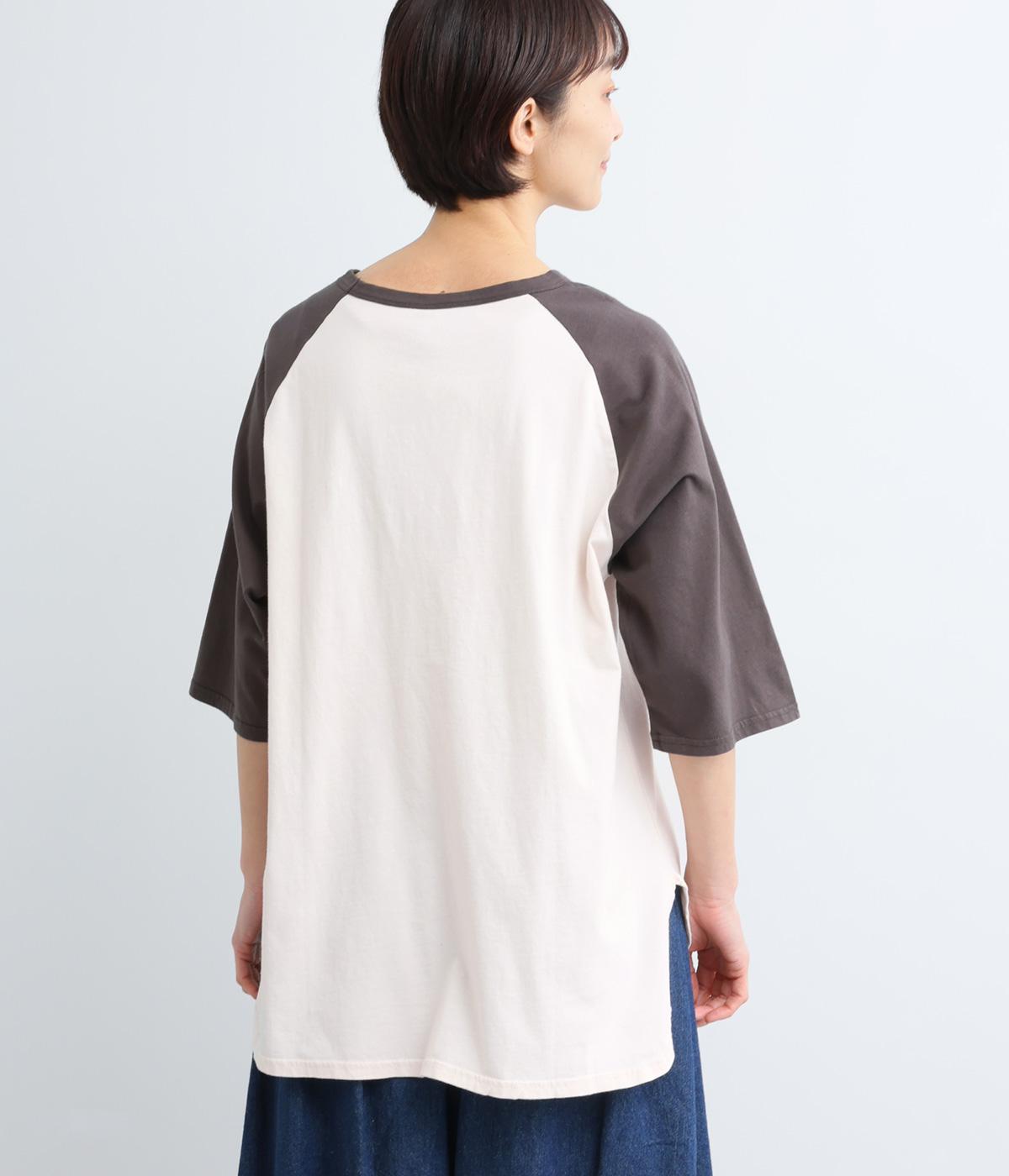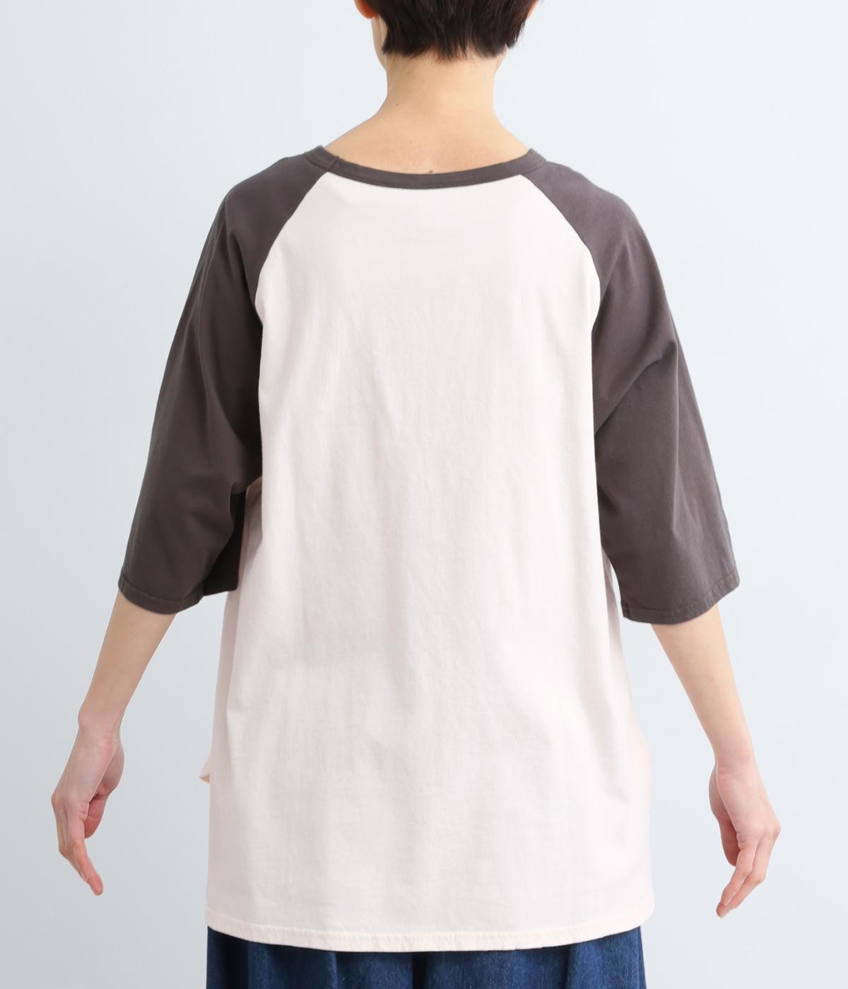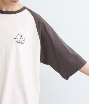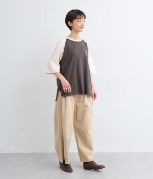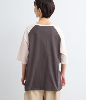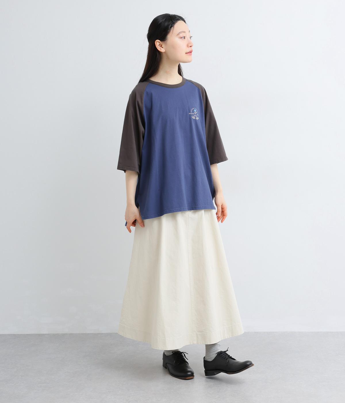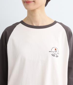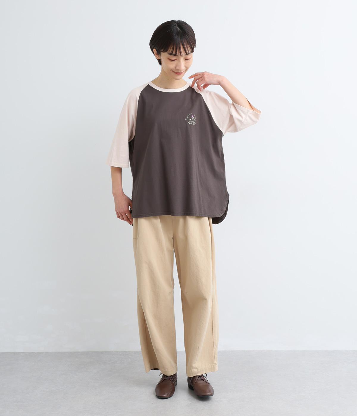 左胸のロゴ刺しゅうとラグラン配色が特徴的な一枚。カジュアル要素を取り入れながらも刺しゅうの花モチーフやゆとりのあるシルエットでナチュラルテイストにまとめています。ラウンド裾は前後差をつけて横姿に動きをプラス。