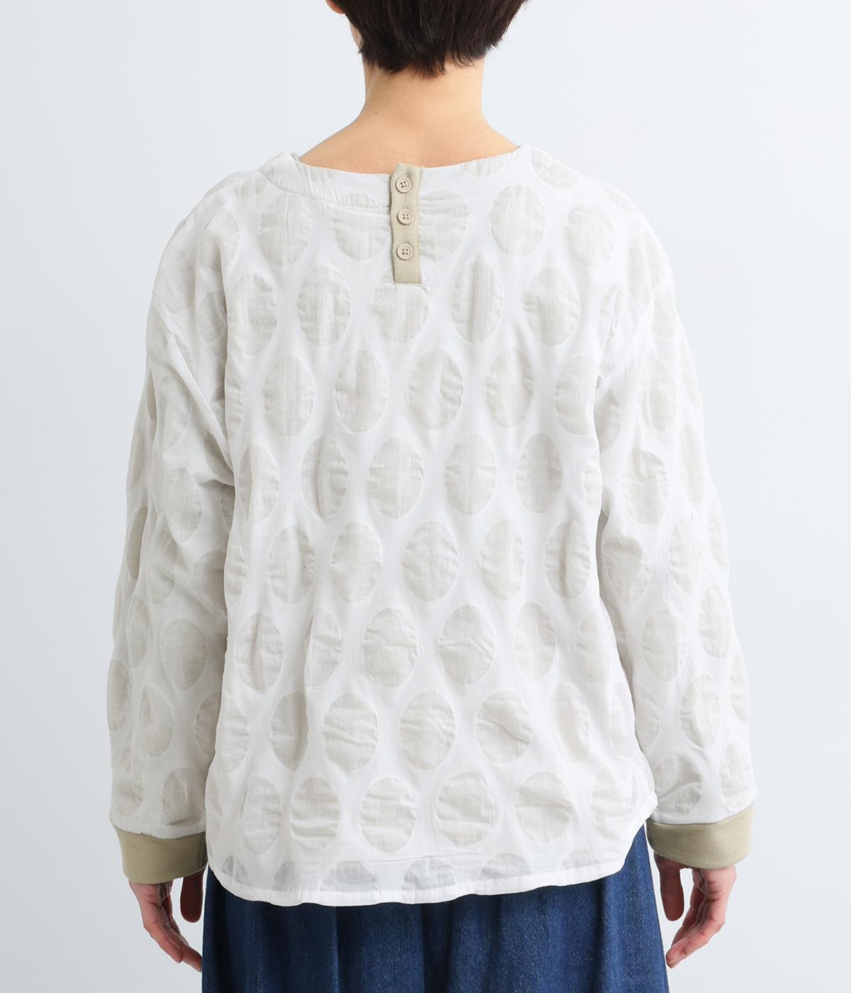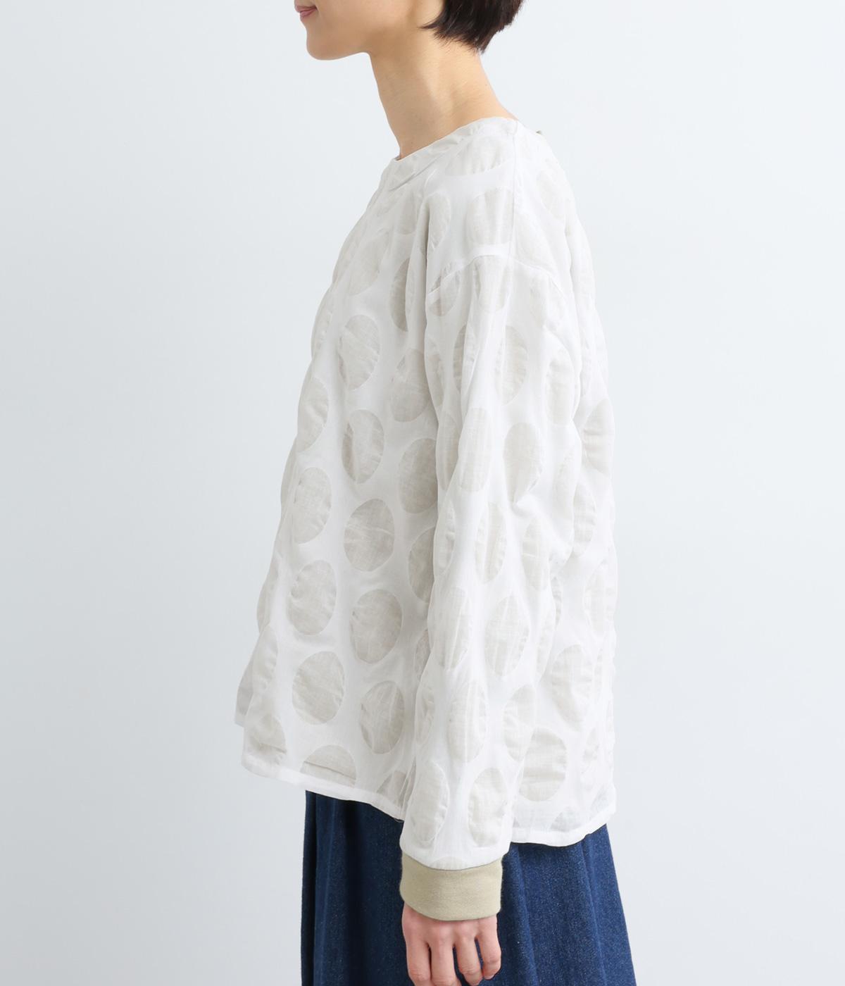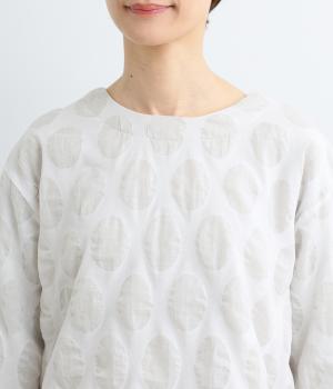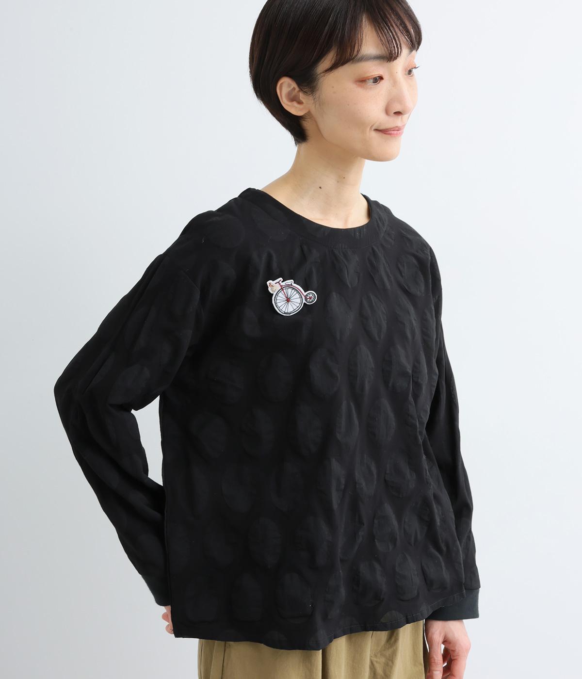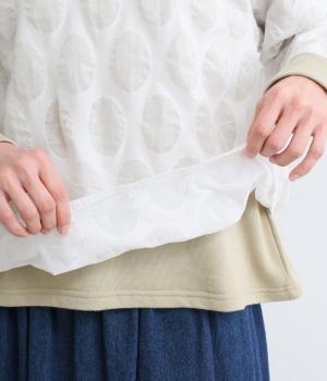 異素材を組みわせたレイヤード仕立てのプルオーバー。塩縮ドットの透け感で2枚重ねも重たく見えず、奥行きのある仕上がりに。後ろボタンあきで頭の通りもスムーズです。付属の自転車ブローチをアクセントに添えて。