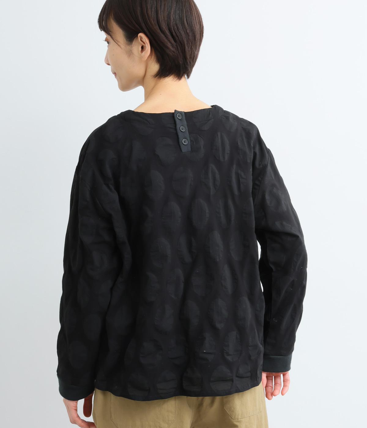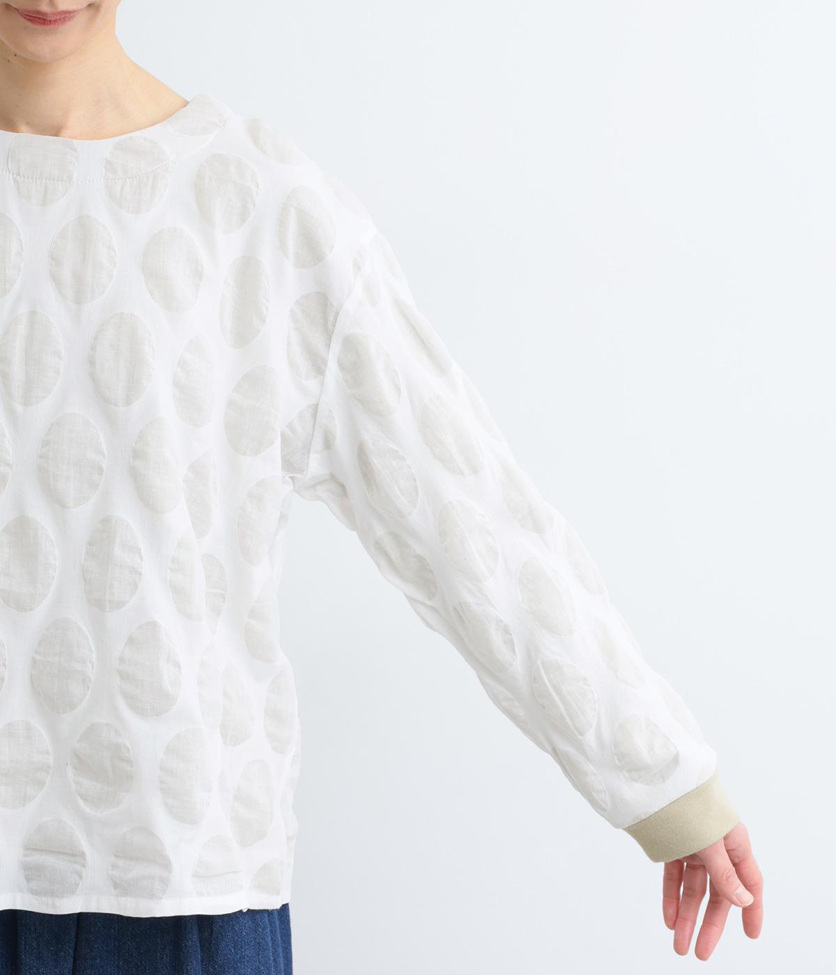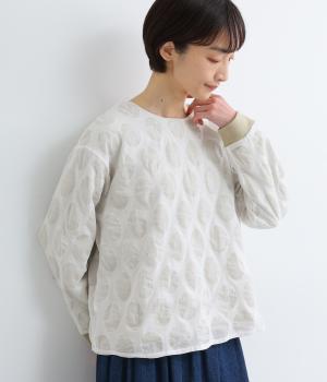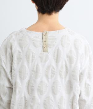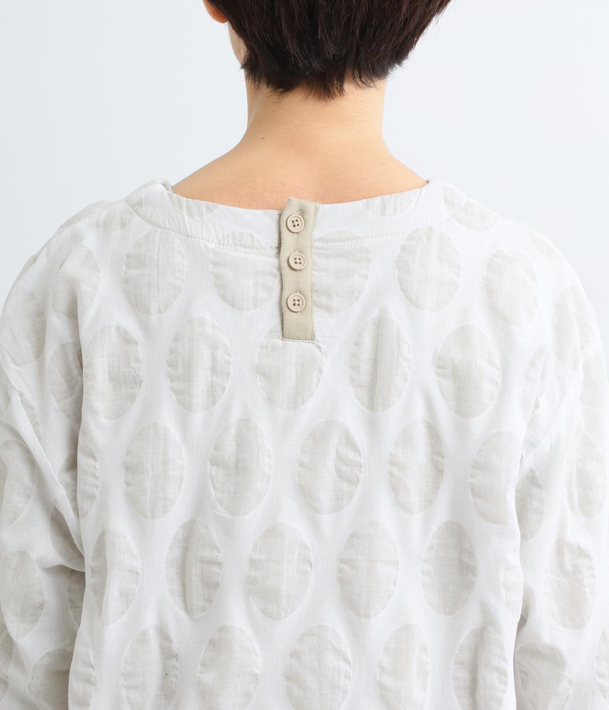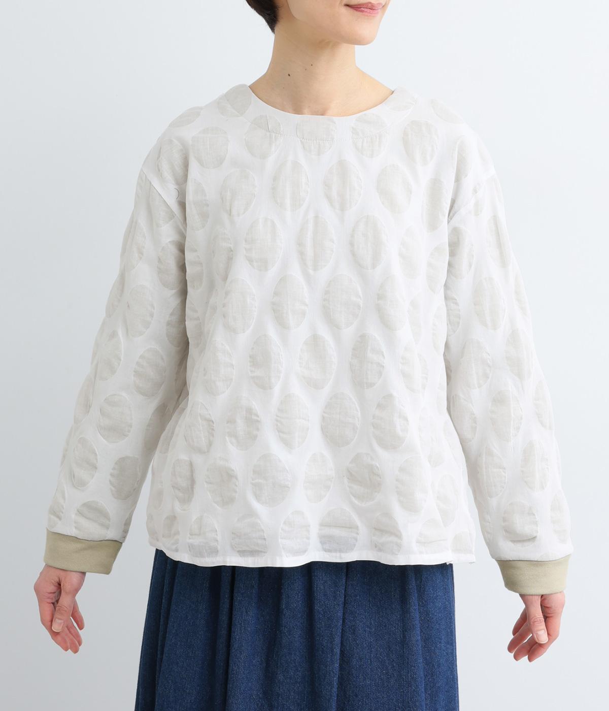 異素材を組みわせたレイヤード仕立てのプルオーバー。塩縮ドットの透け感で2枚重ねも重たく見えず、奥行きのある仕上がりに。後ろボタンあきで頭の通りもスムーズです。付属の自転車ブローチをアクセントに添えて。
