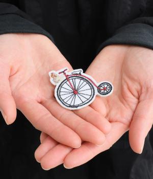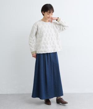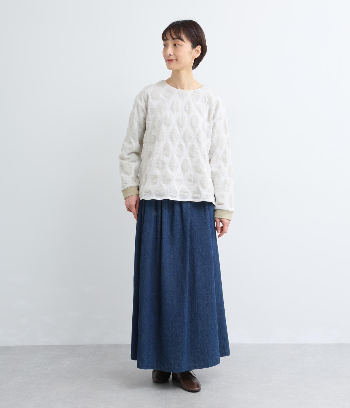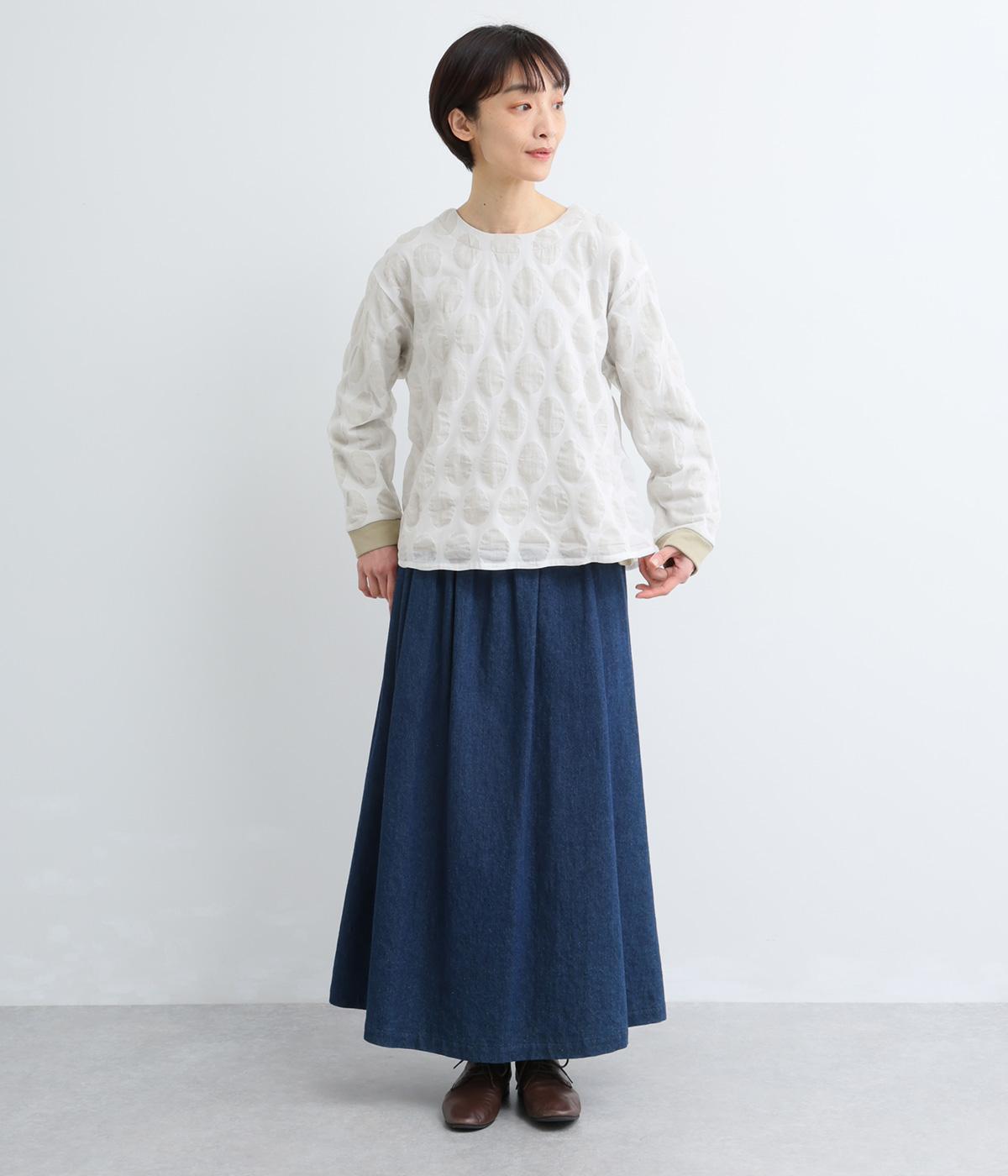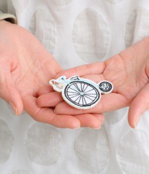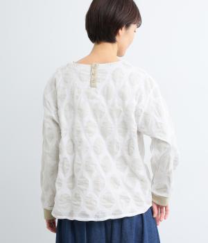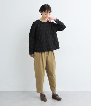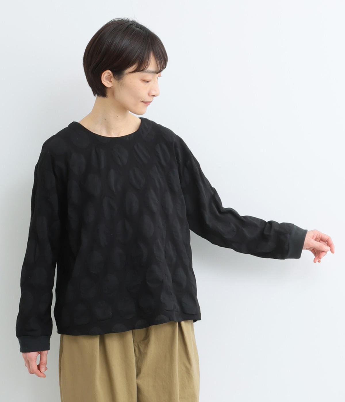 異素材を組みわせたレイヤード仕立てのプルオーバー。塩縮ドットの透け感で2枚重ねも重たく見えず、奥行きのある仕上がりに。後ろボタンあきで頭の通りもスムーズです。付属の自転車ブローチをアクセントに添えて。