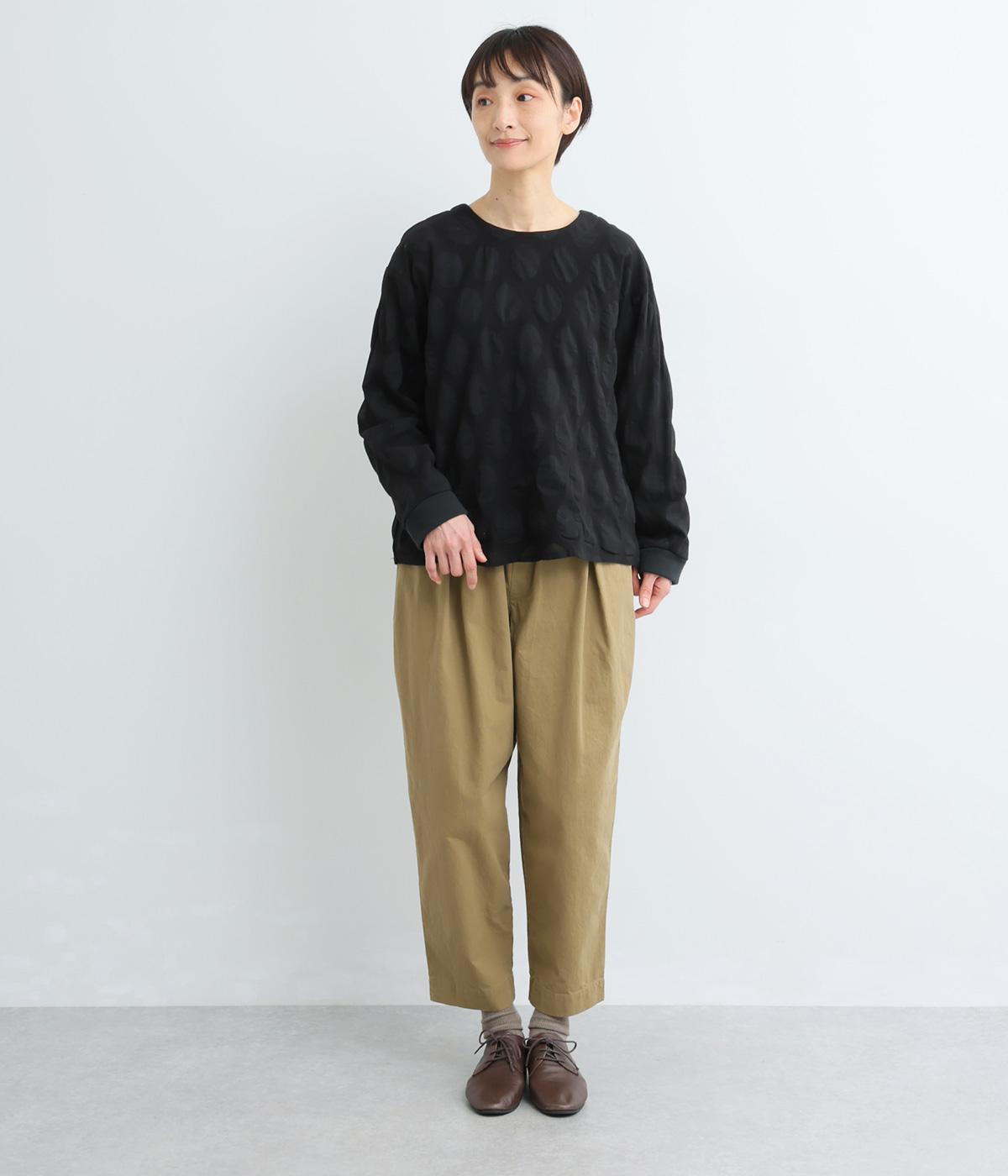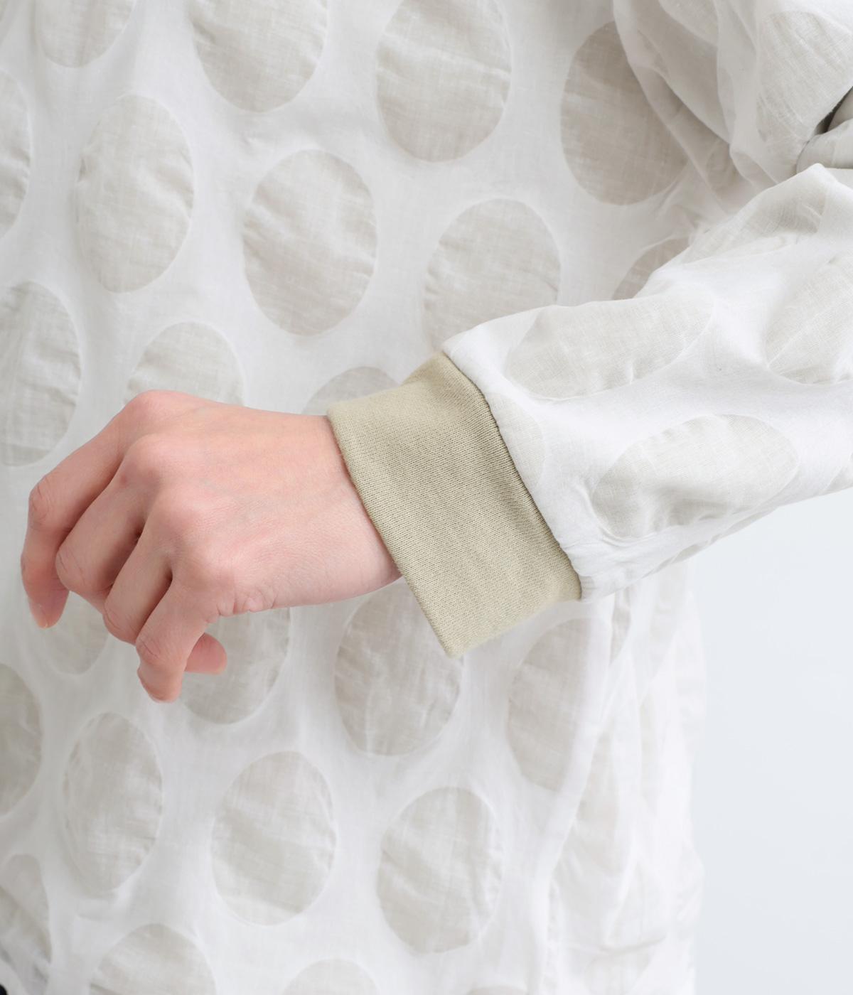 塩縮ドットの透け感ある布帛生地と伸縮性があり肌触りのいい裏毛生地をドッキング。裏毛はコットンにポリエステルをまぜているので速乾性良く適度に軽やかです。