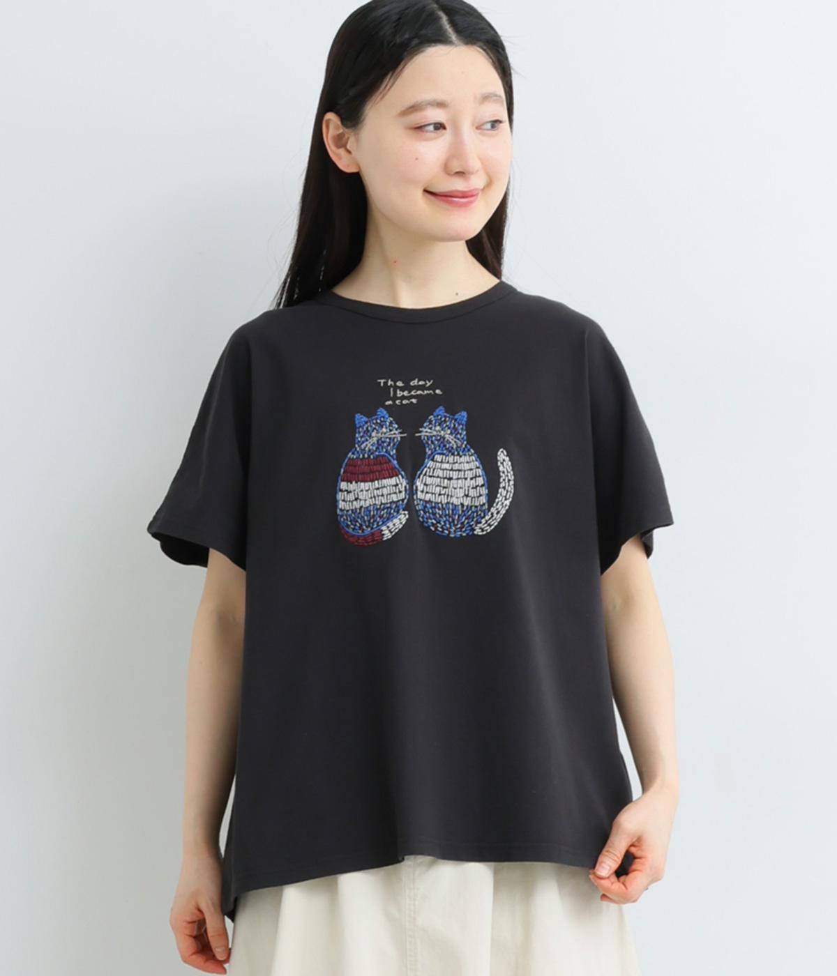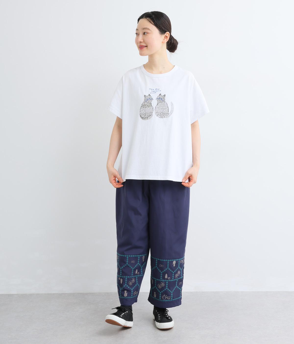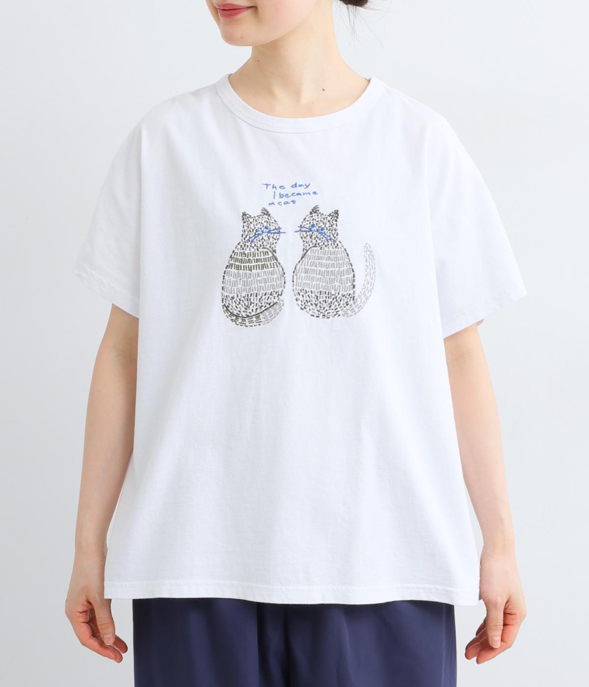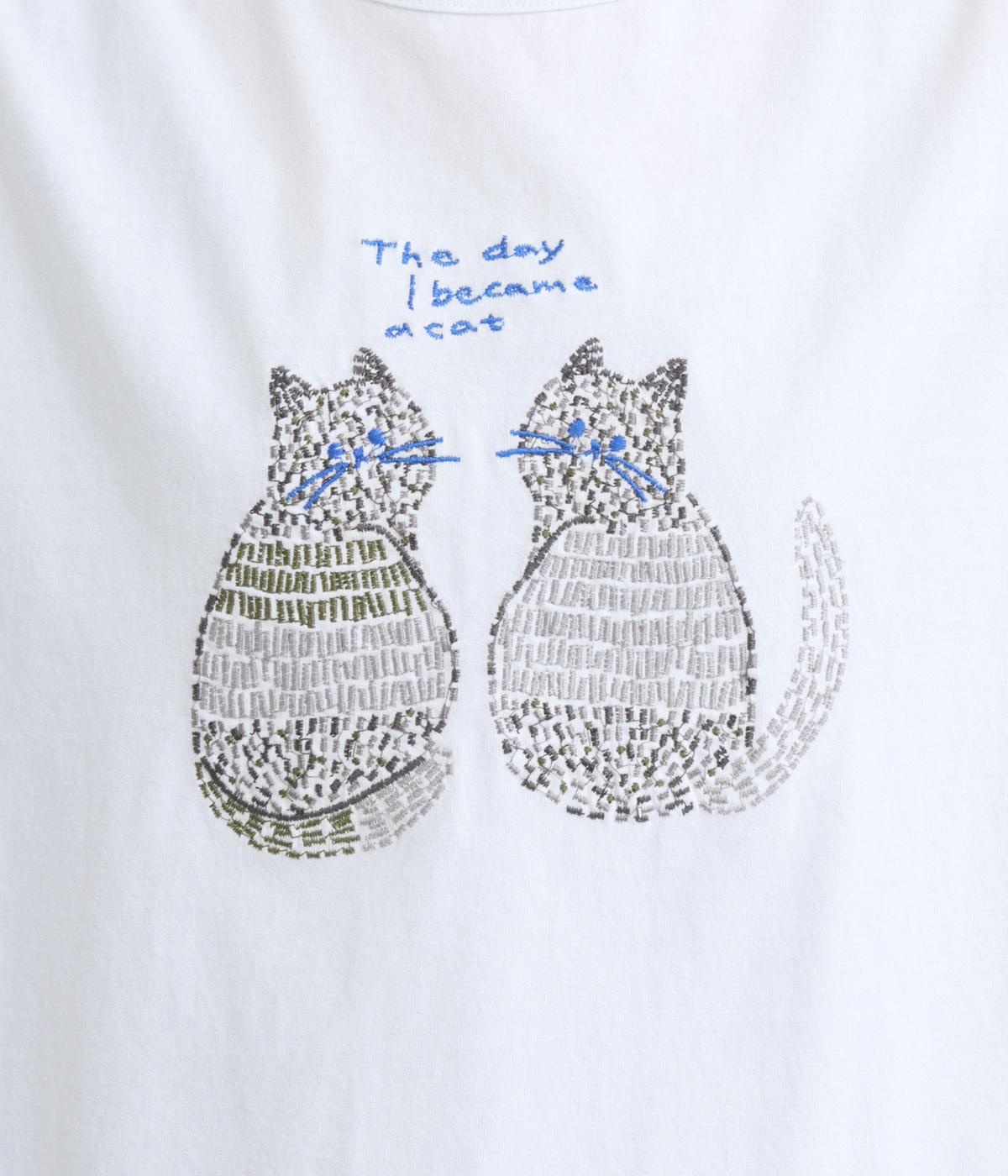 くるりと振り返った猫の後ろ姿が愛らしい、刺しゅうデザインのTシャツ。定番色のベース生地に刺しゅう糸の配色をきかせています。体にフィットしすぎない適度にゆとりを持たせた作りでカジュアルに着まわせます。