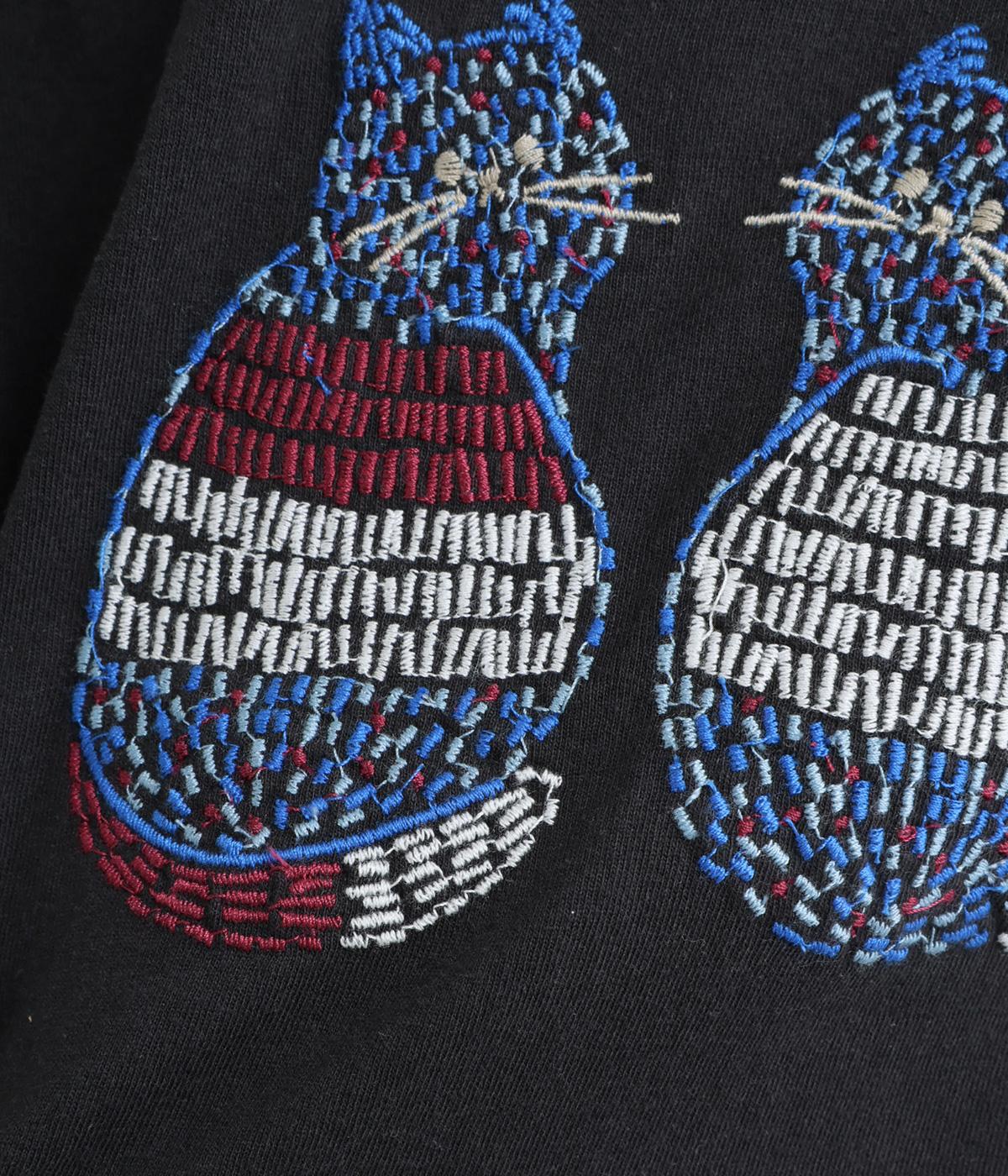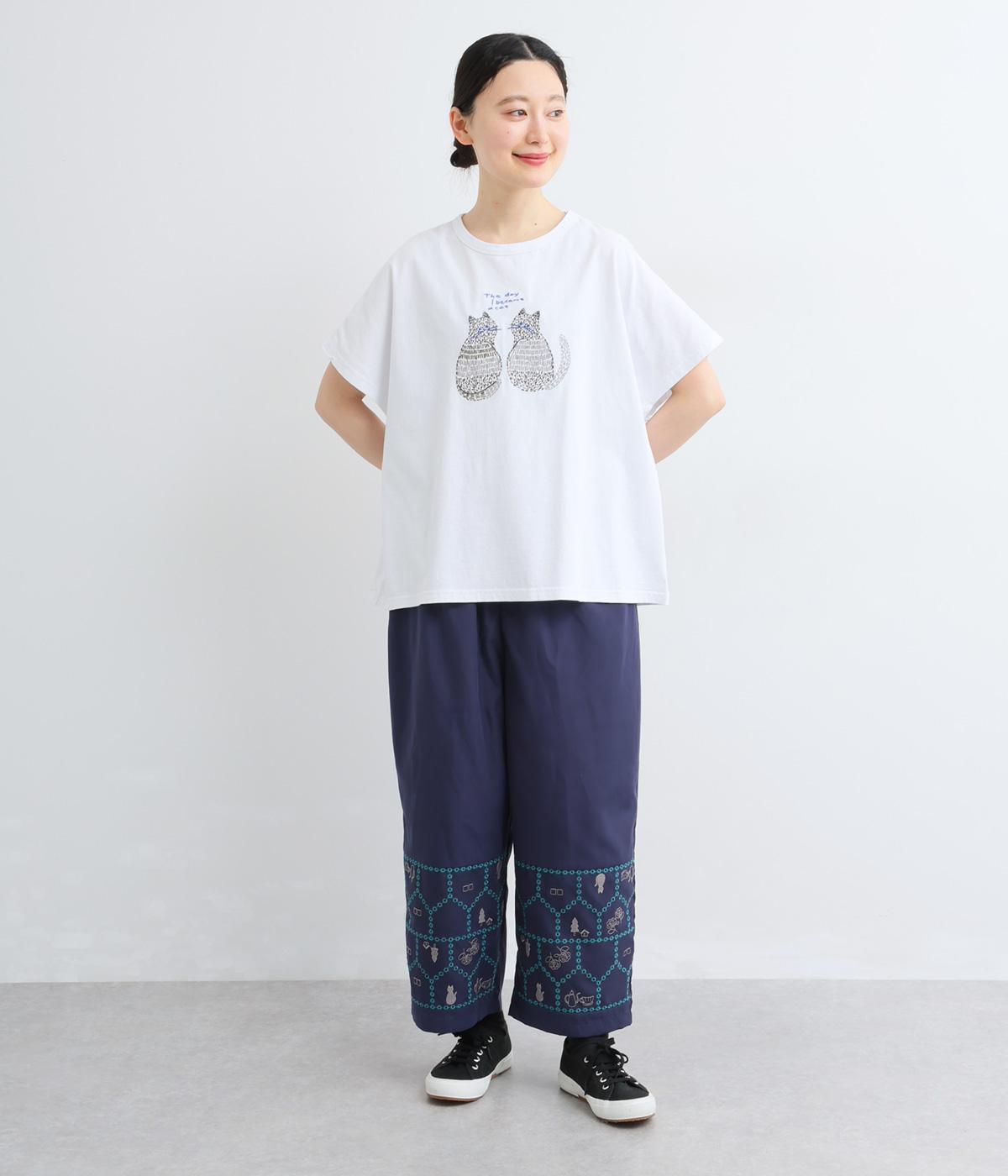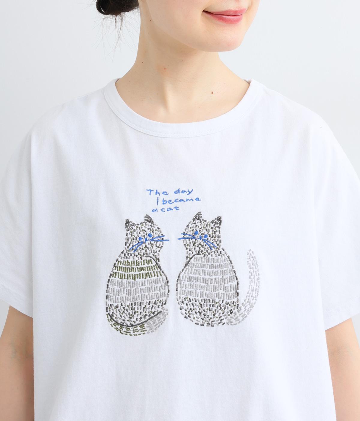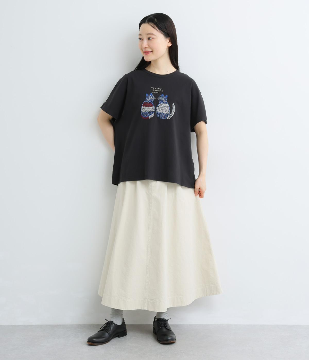 くるりと振り返った猫の後ろ姿が愛らしい、刺しゅうデザインのTシャツ。定番色のベース生地に刺しゅう糸の配色をきかせています。体にフィットしすぎない適度にゆとりを持たせた作りでカジュアルに着まわせます。