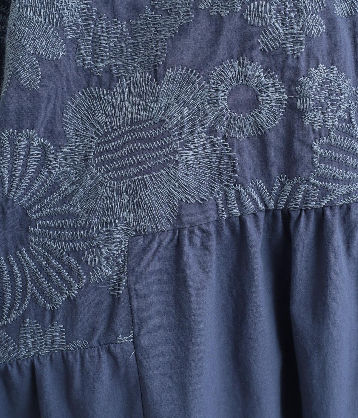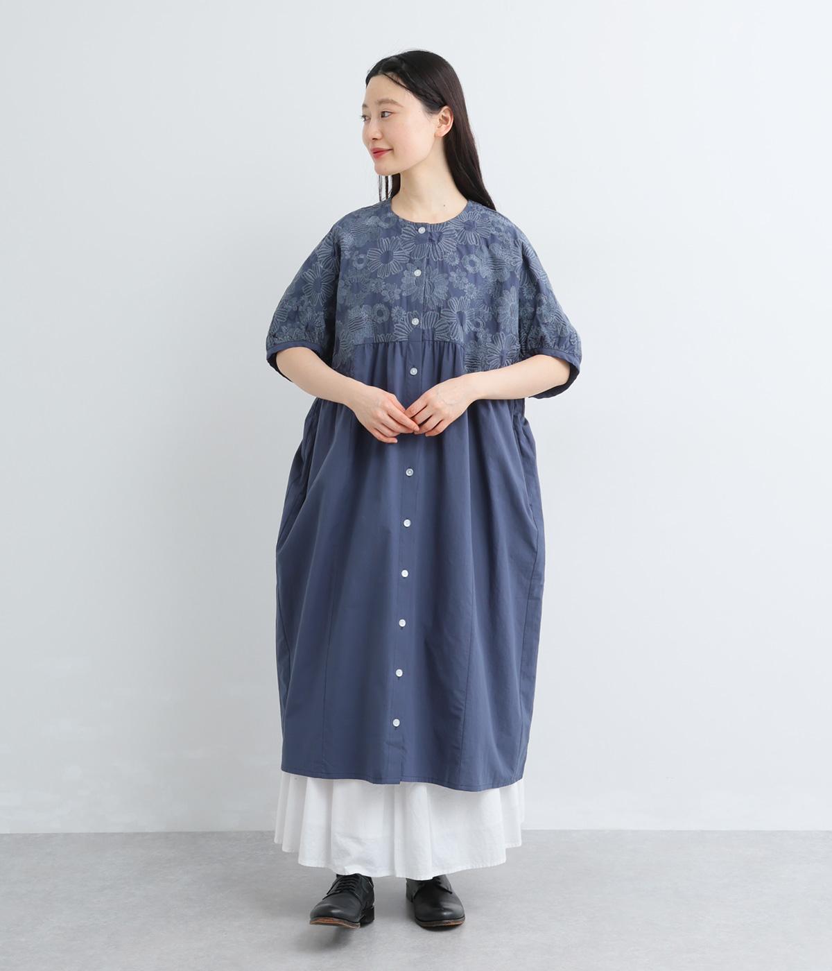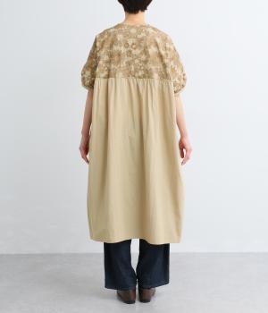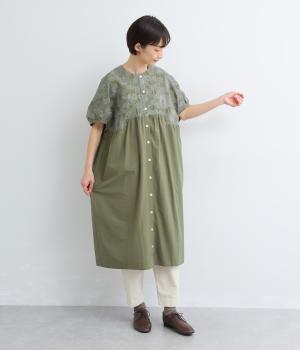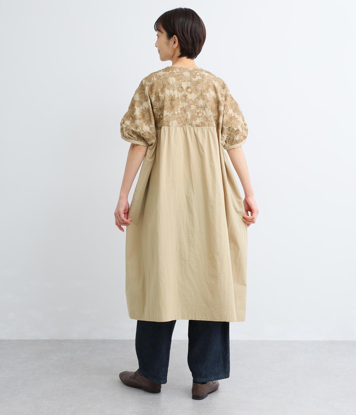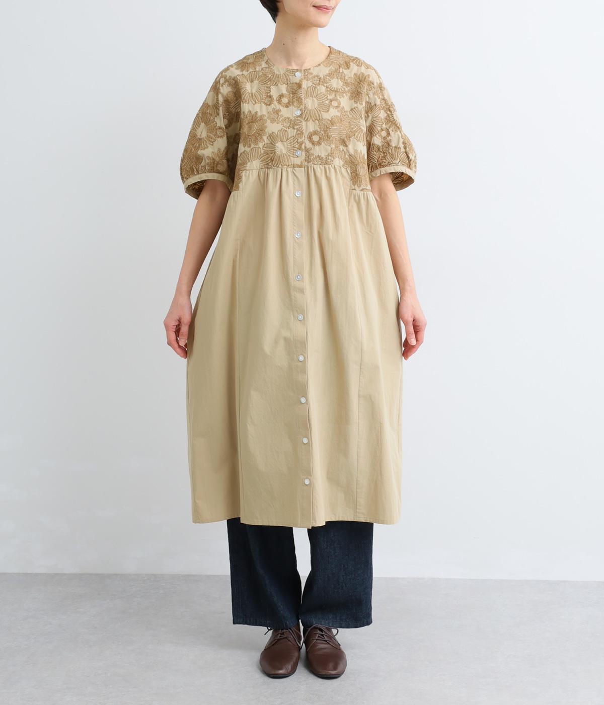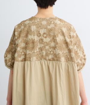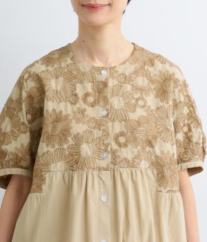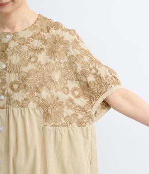 顔まわりにあしらった大胆な大花刺しゅうにふっくらとした袖が目を惹くワンピース。陰影を感じさせる配色が大人顔にまとまるポイント。一枚着はもちろん、ボトムを合わせたり前あきの羽織りにしたりと着まわしもききます。