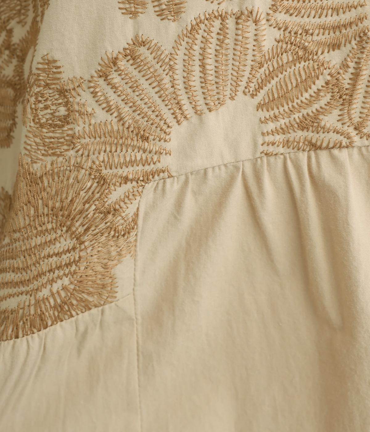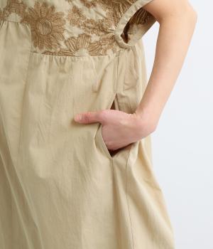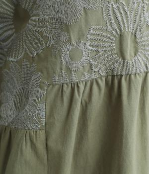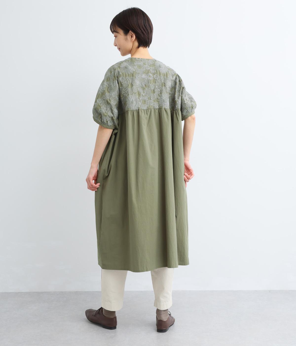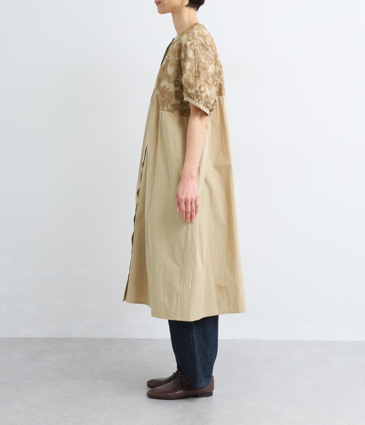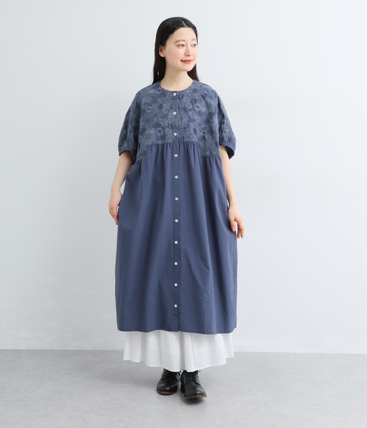 顔まわりにあしらった大胆な大花刺しゅうにふっくらとした袖が目を惹くワンピース。陰影を感じさせる配色が大人顔にまとまるポイント。一枚着はもちろん、ボトムを合わせたり前あきの羽織りにしたりと着まわしもききます。