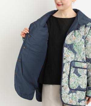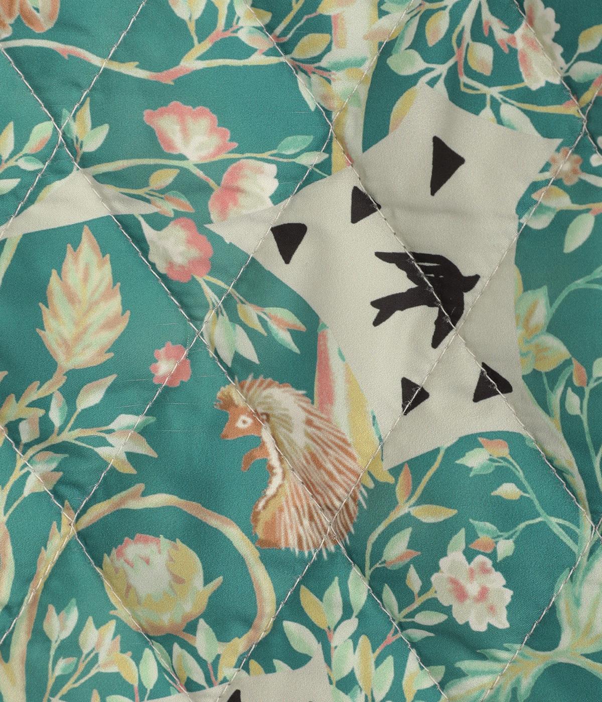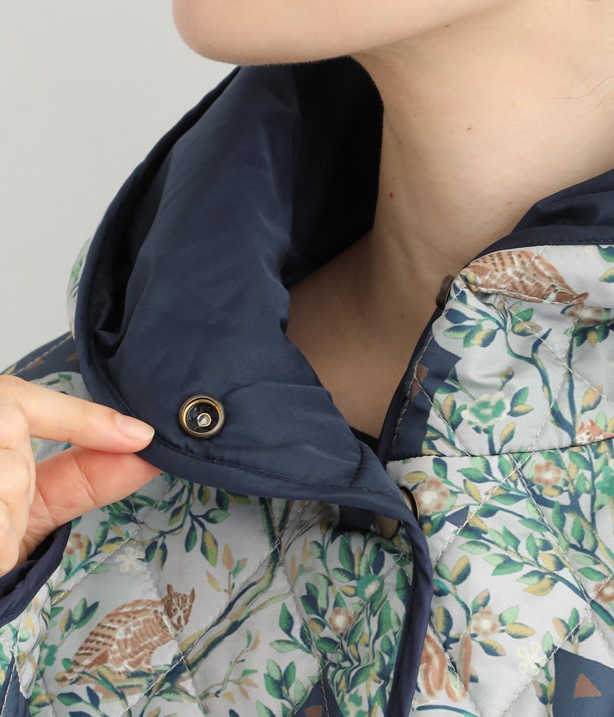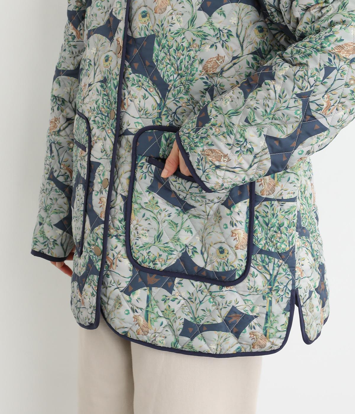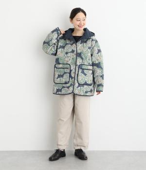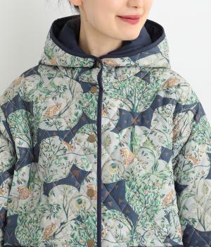 ナチュラルな風合いの植物や動物のイラストが個性的なキルティングコート。パイピングがデザインにアクセントを添えています。裾にはスリットを入れ動きやすさも確保。サッとと羽織るだけでスタイリングの主役になる一枚です。