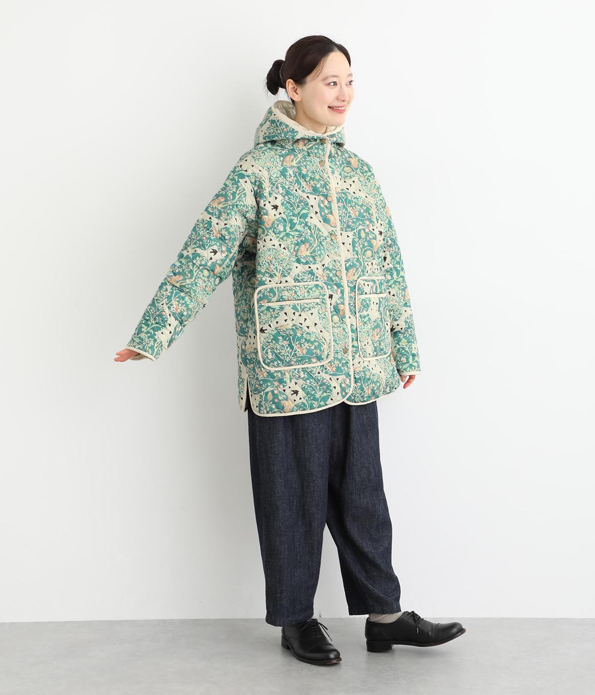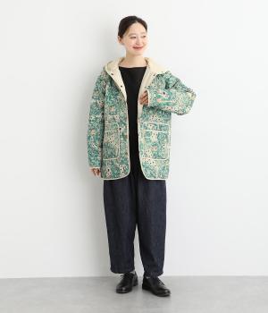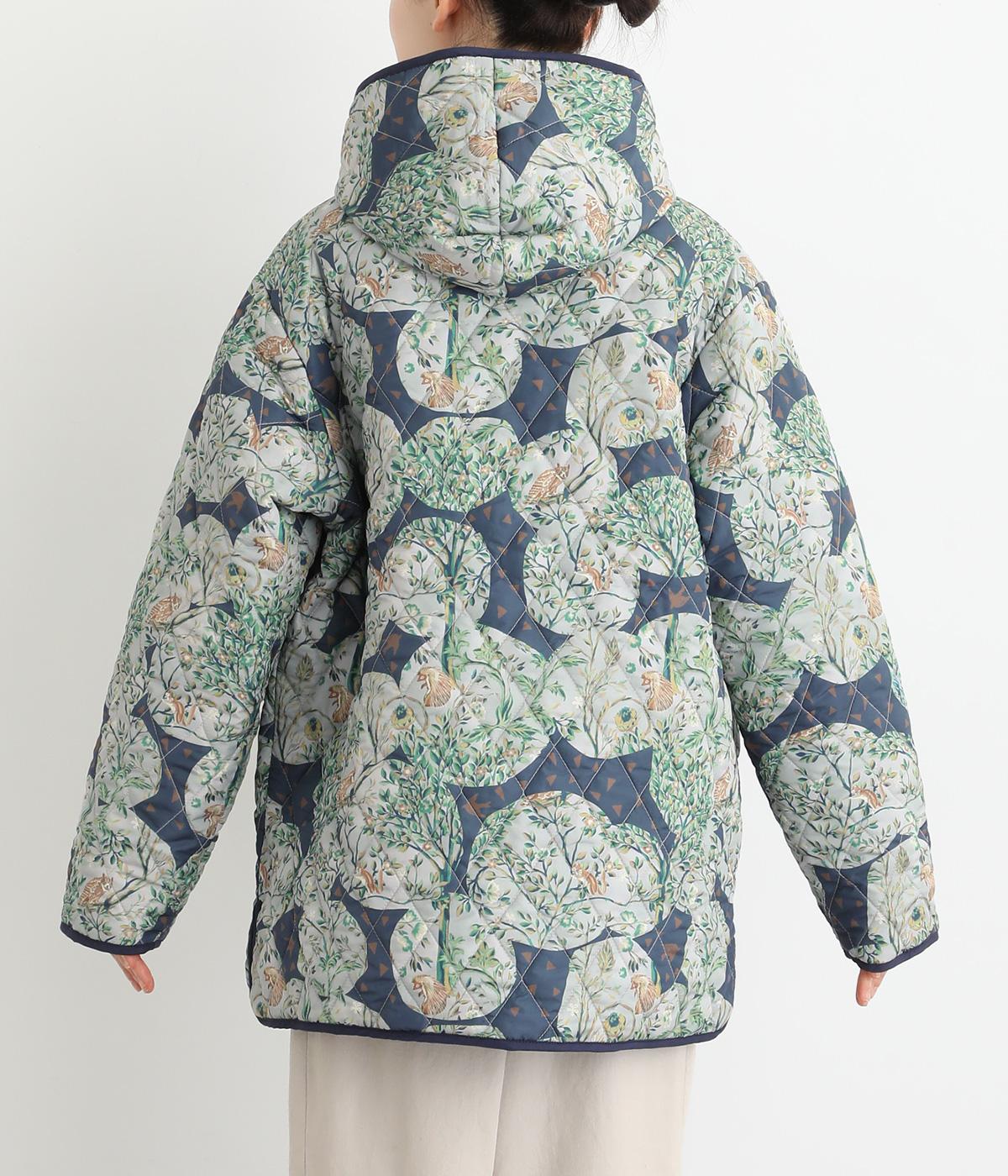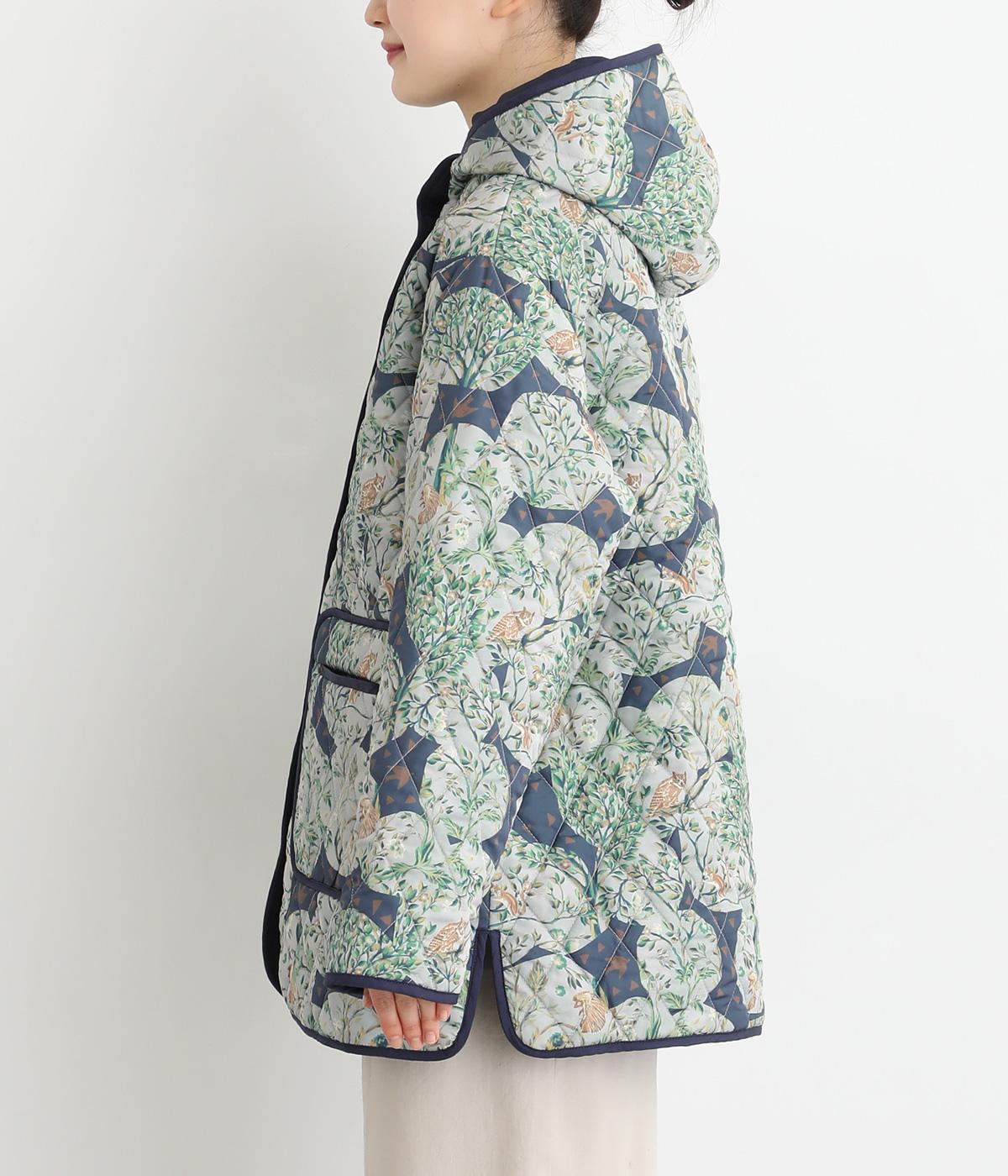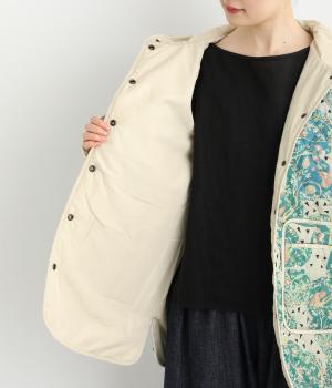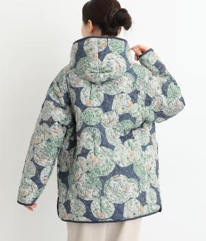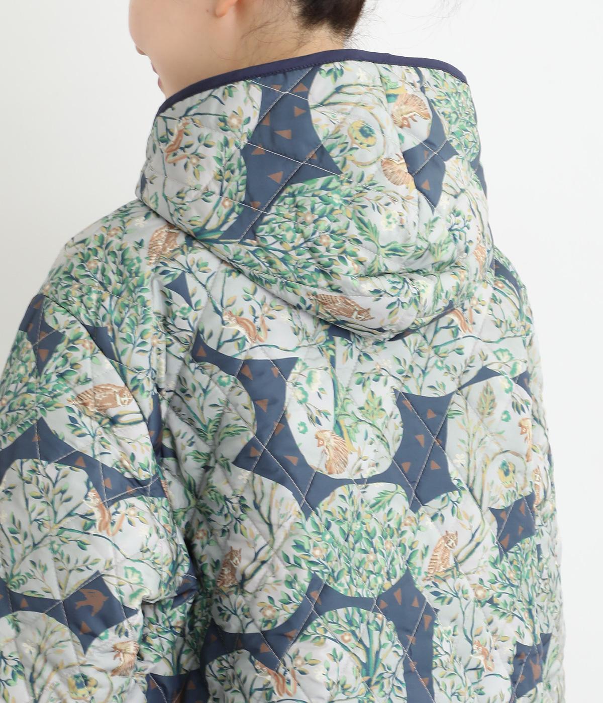 ナチュラルな風合いの植物や動物のイラストが個性的なキルティングコート。パイピングがデザインにアクセントを添えています。裾にはスリットを入れ動きやすさも確保。サッとと羽織るだけでスタイリングの主役になる一枚です。