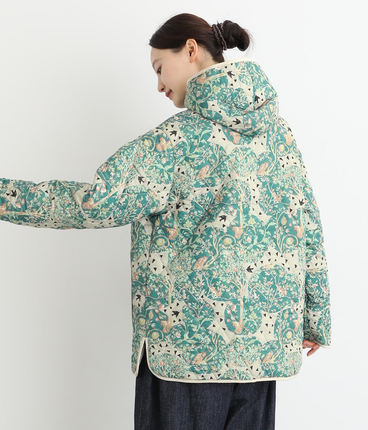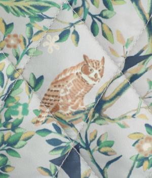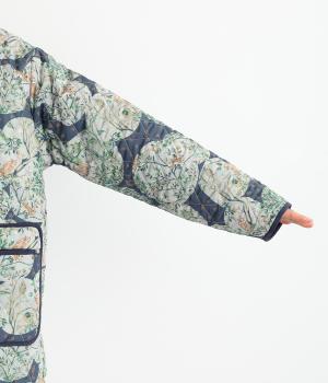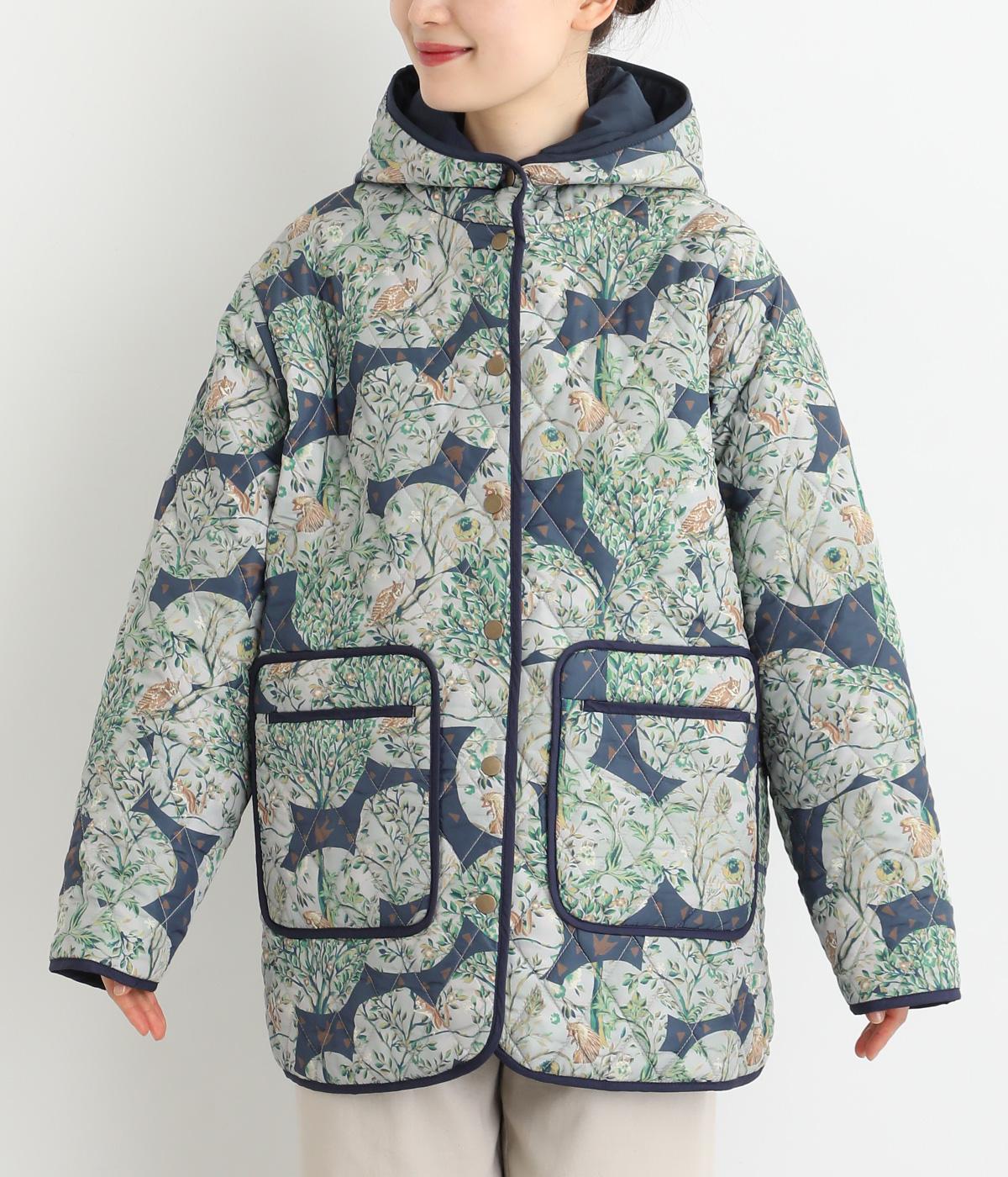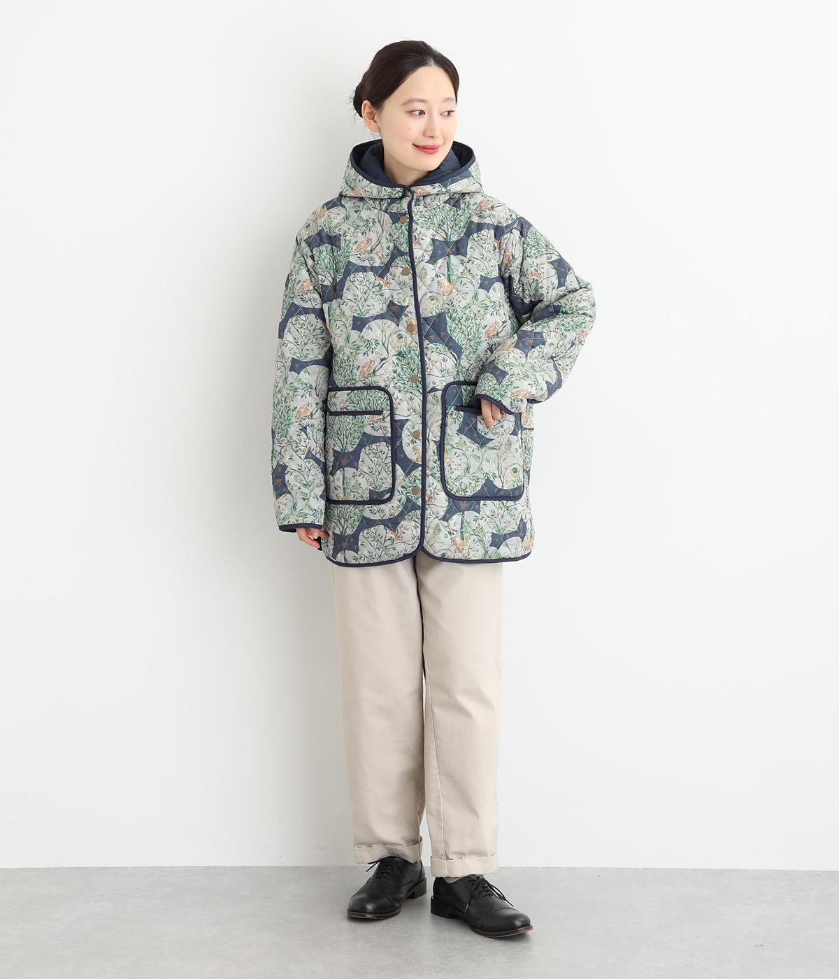 ナチュラルな風合いの植物や動物のイラストが個性的なキルティングコート。パイピングがデザインにアクセントを添えています。裾にはスリットを入れ動きやすさも確保。サッとと羽織るだけでスタイリングの主役になる一枚です。