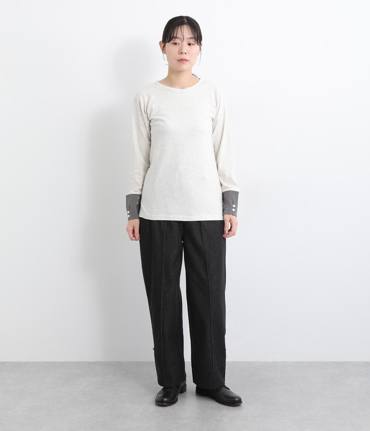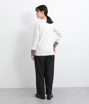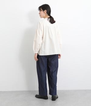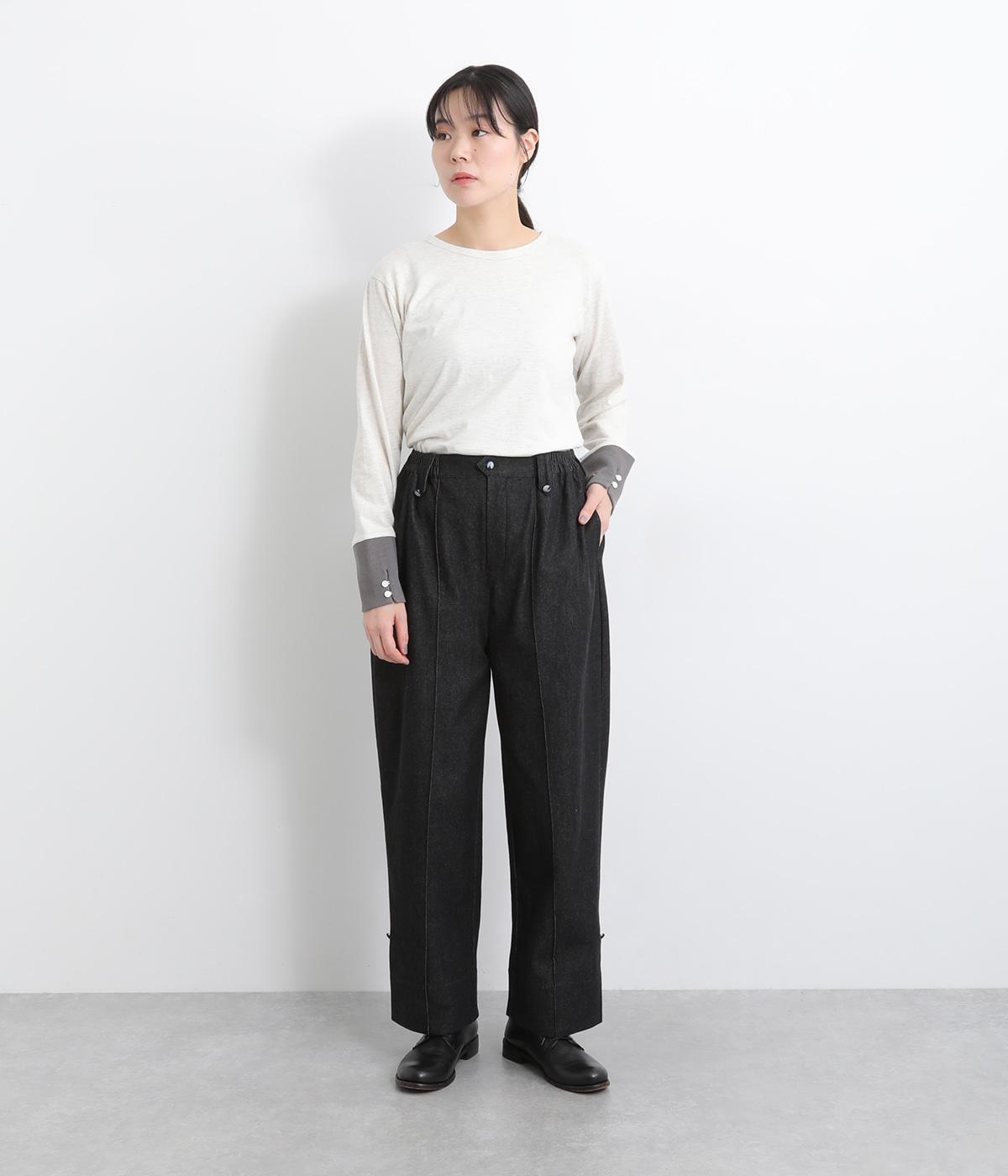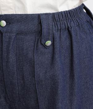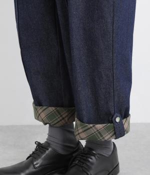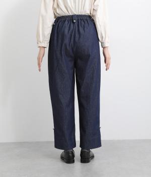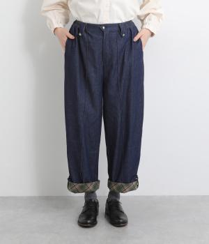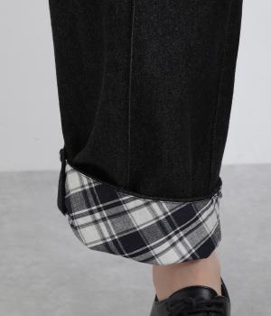 適度にゆとりを持たせたストレートシルエットで、レッグラインをきれいに見せるパンツ。刺しゅうを施した愛らしいボタンをアクセントにしています。裾をロールアップすれば、チェックの裏地が覗いておしゃれ感アップ。ウエストはサイドからバックにかけてゴムを通しているのでイージーな着用感です。