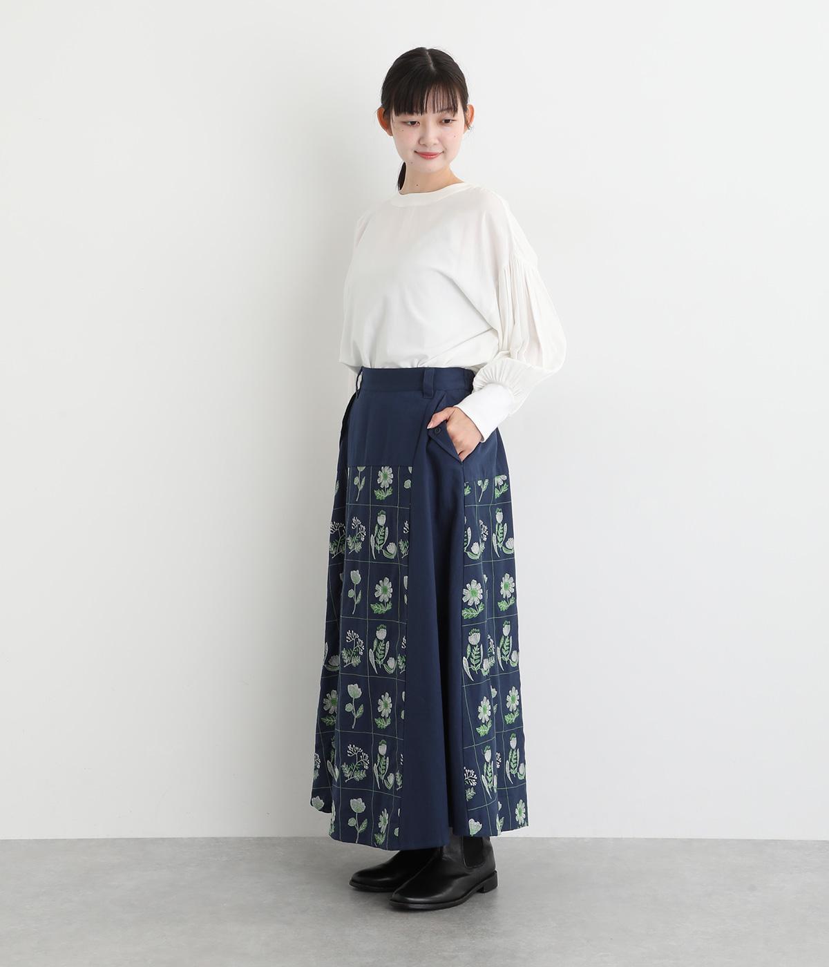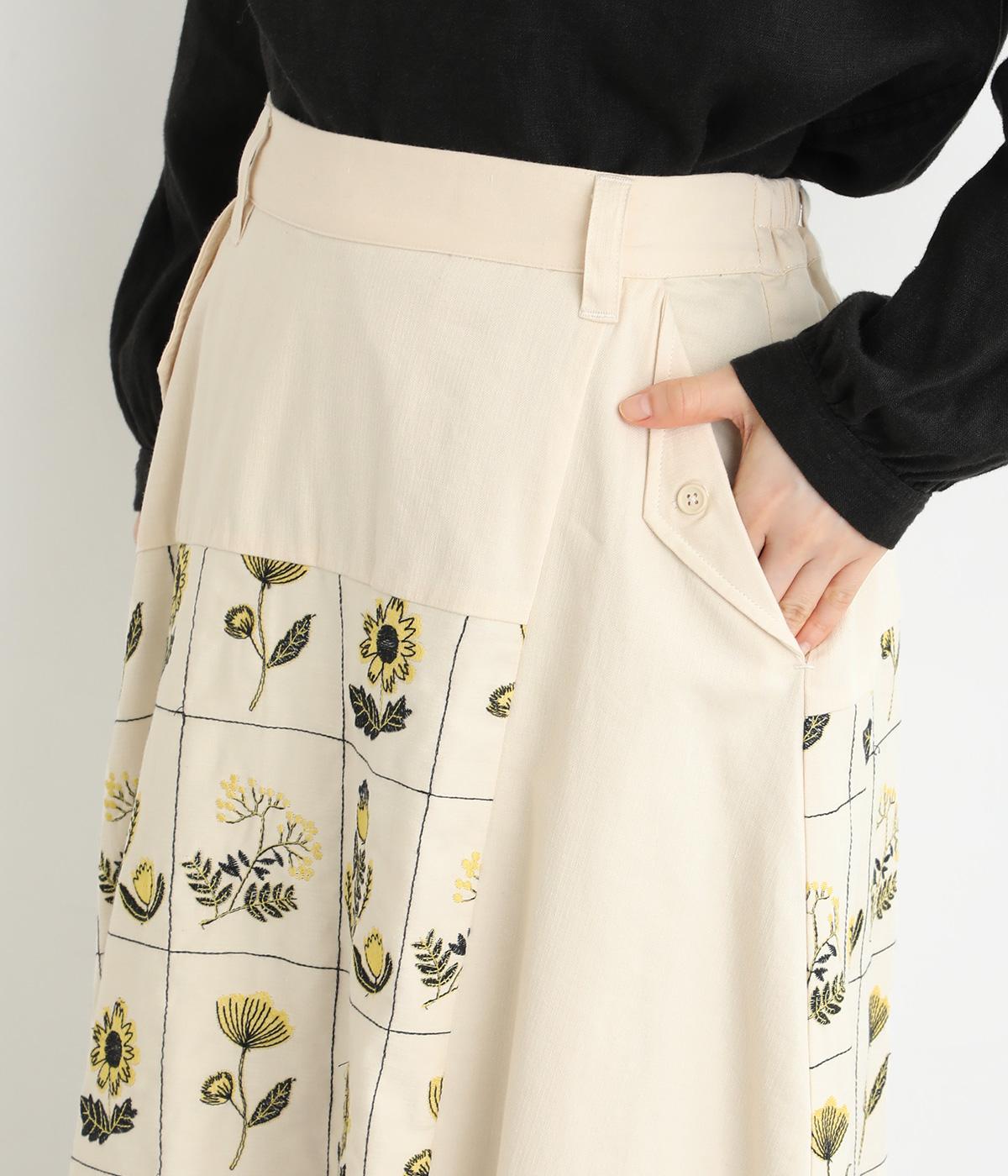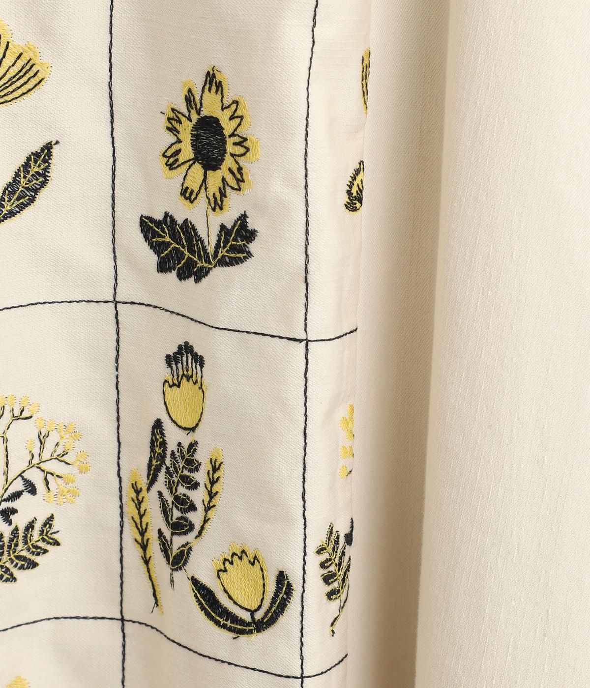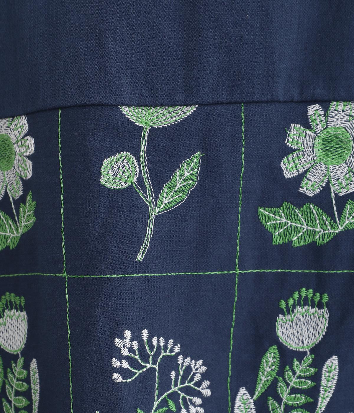 マス目のようなラインのなかにレトロな花柄刺しゅうをほどこしました。おなかまわりやサイドに残した無地部分が品を添えてすっきり見せてくれます。ポケットのフラップもさりげないアクセントに。ウエストはゴム仕様で、ベルトループ付きになっています。