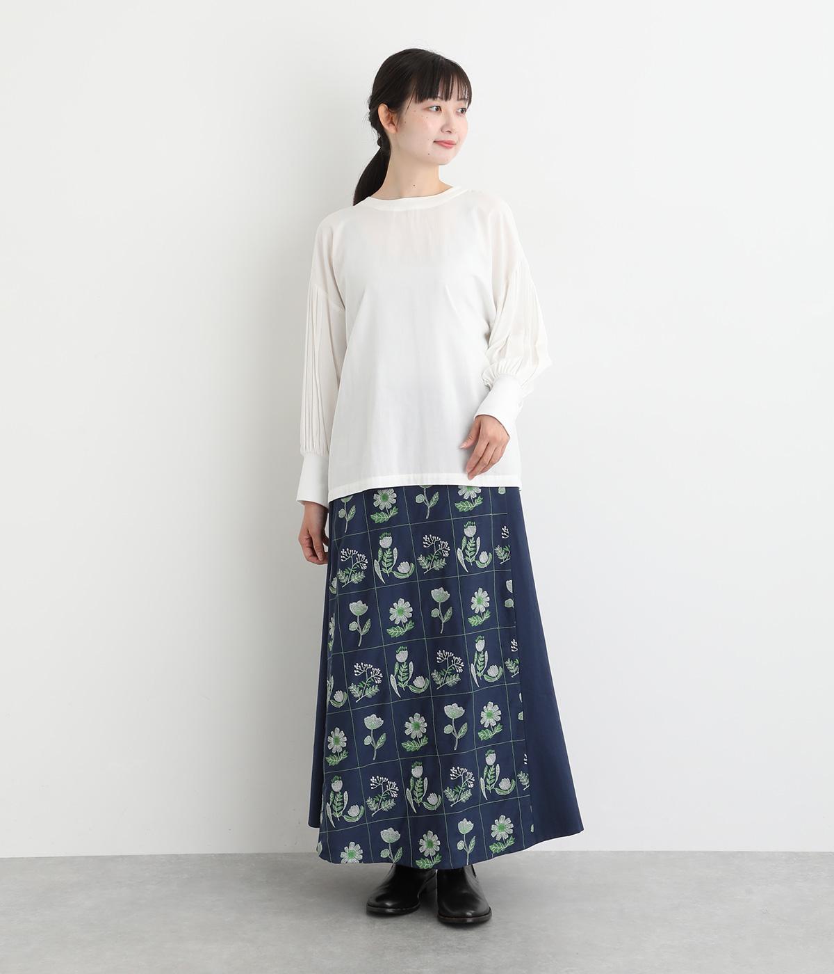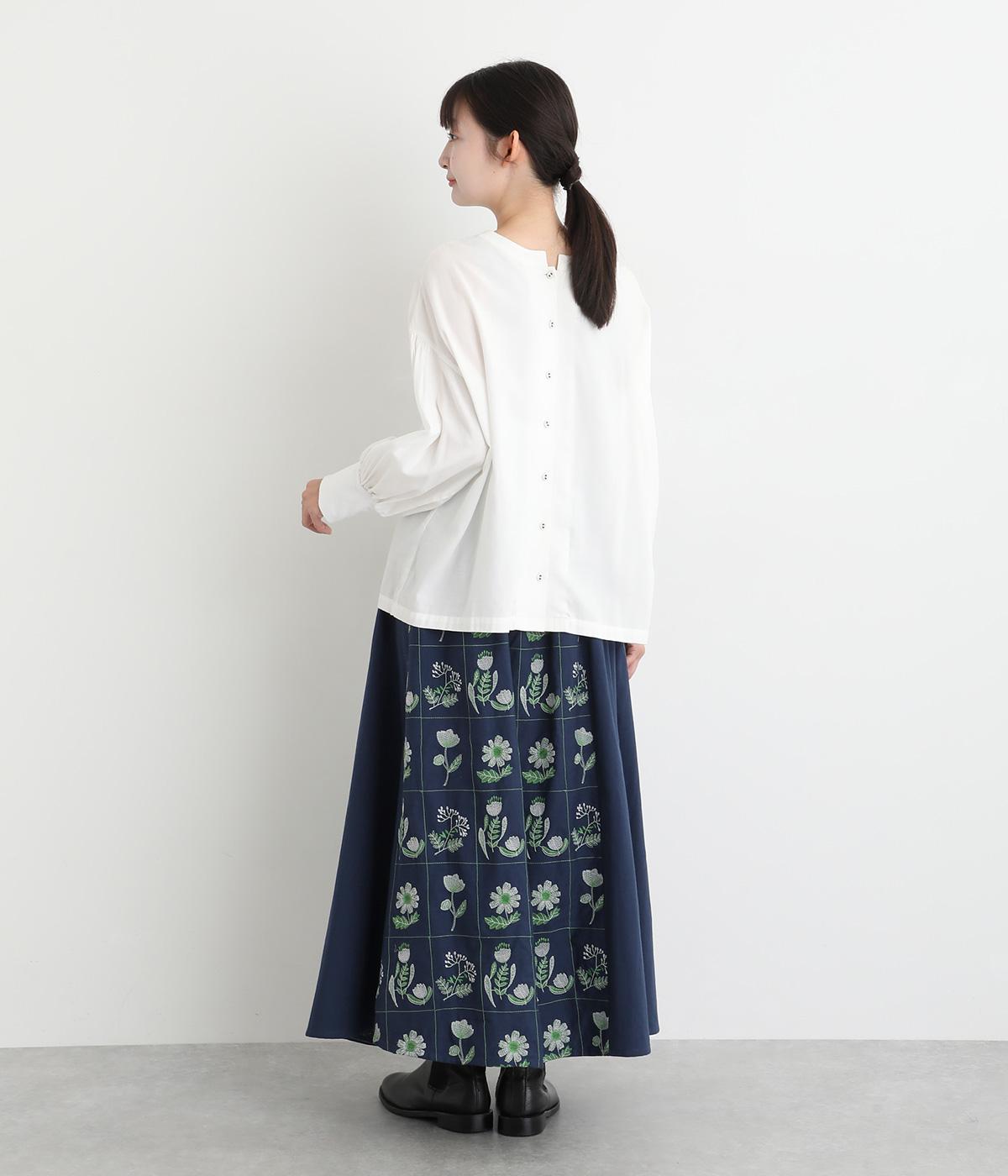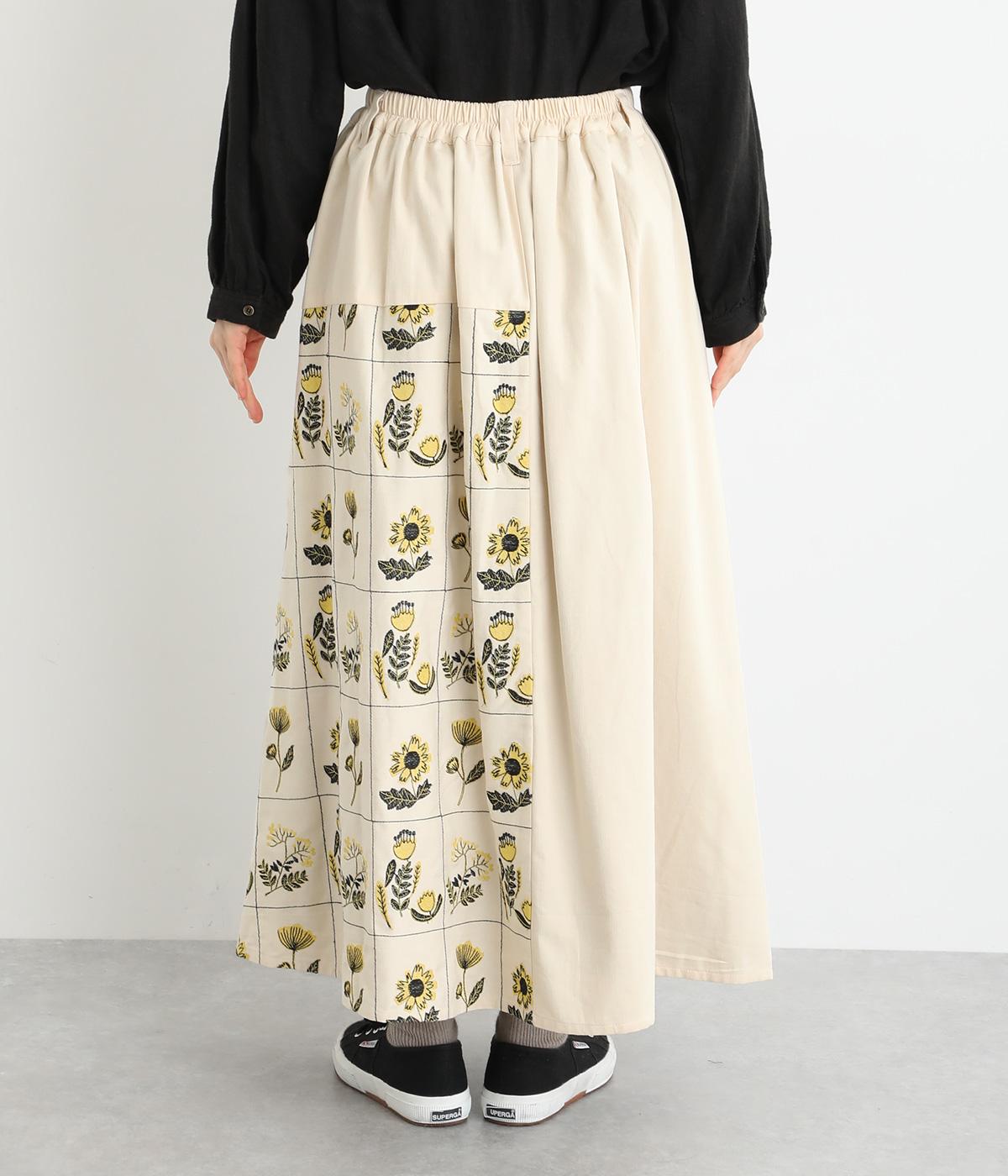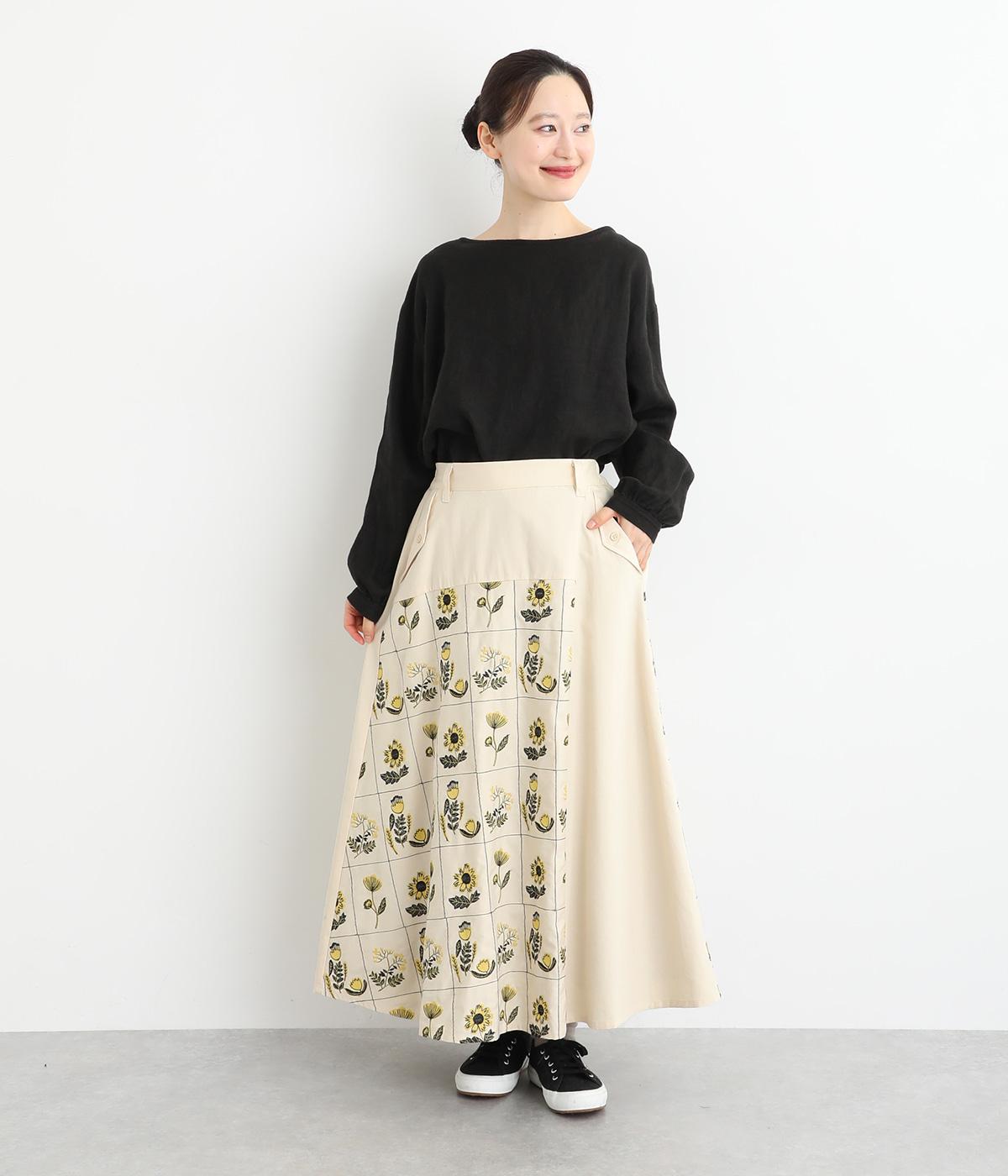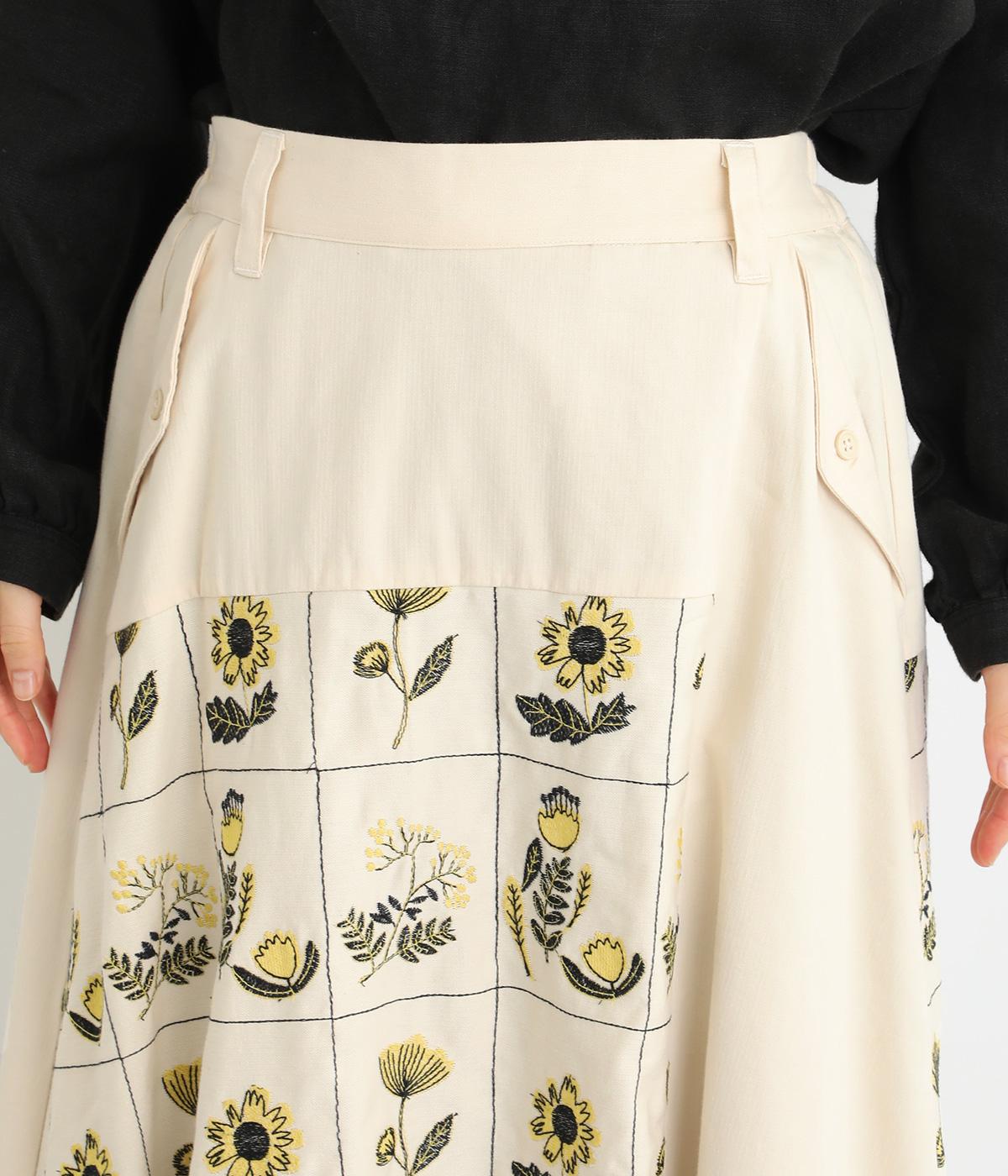 マス目のようなラインのなかにレトロな花柄刺しゅうをほどこしました。おなかまわりやサイドに残した無地部分が品を添えてすっきり見せてくれます。ポケットのフラップもさりげないアクセントに。ウエストはゴム仕様で、ベルトループ付きになっています。