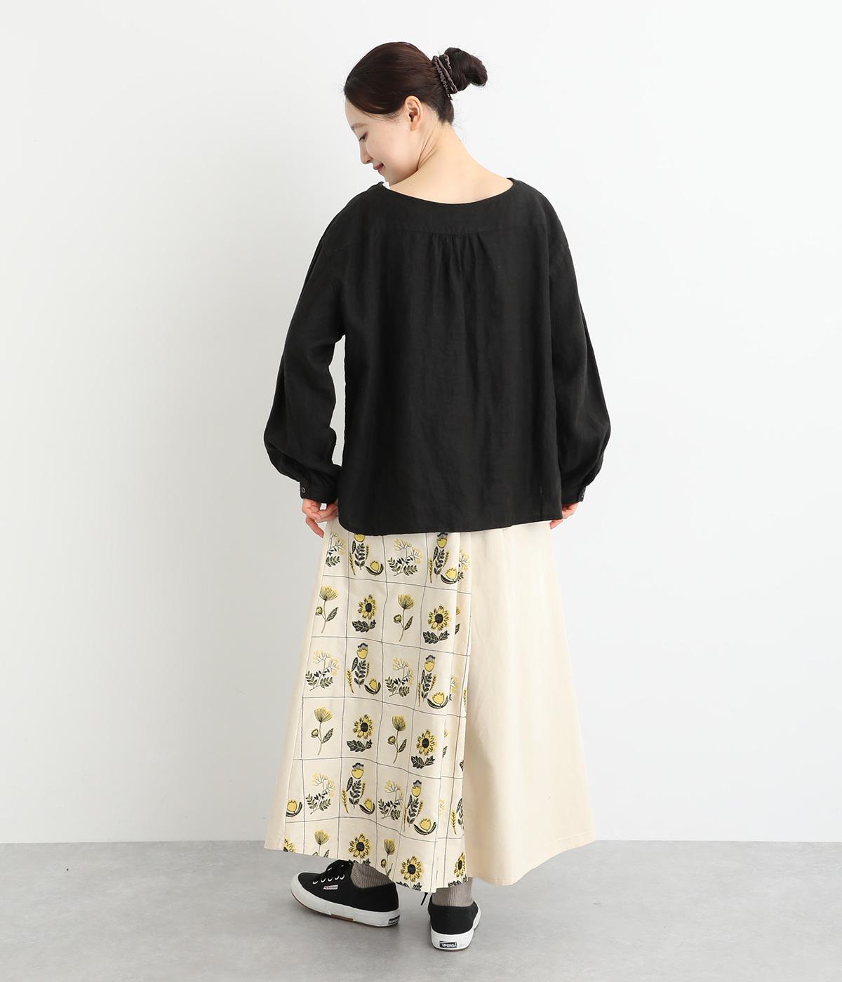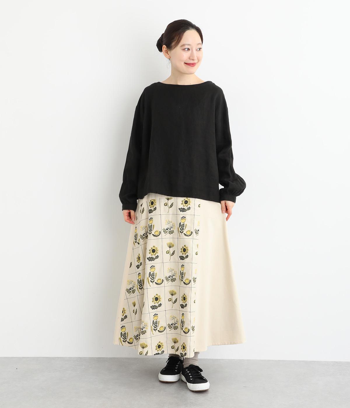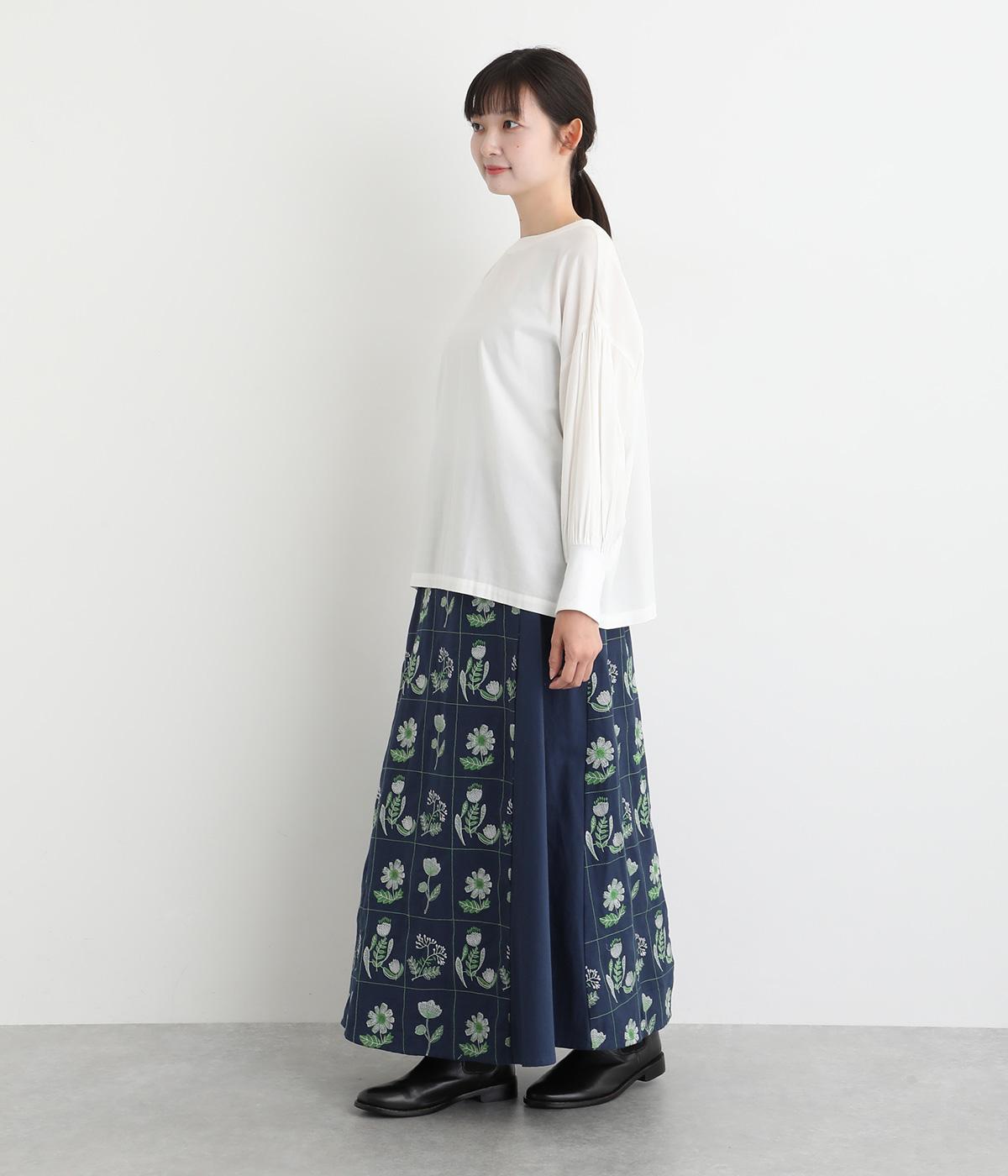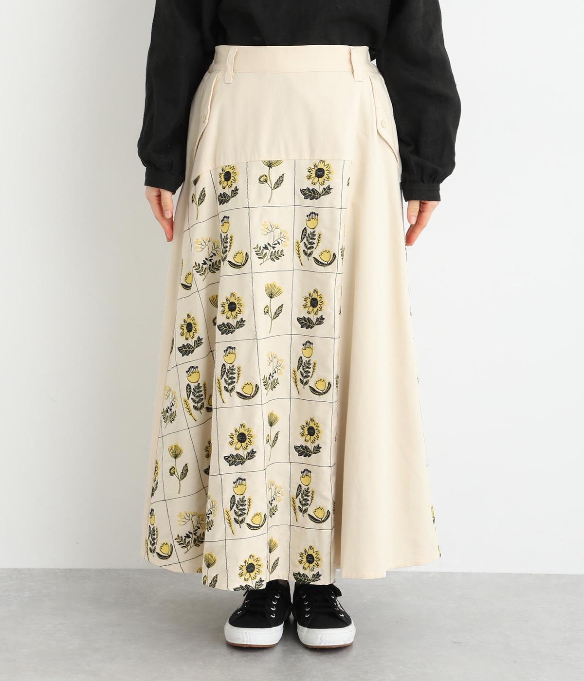 マス目のようなラインのなかにレトロな花柄刺しゅうをほどこしました。おなかまわりやサイドに残した無地部分が品を添えてすっきり見せてくれます。ポケットのフラップもさりげないアクセントに。ウエストはゴム仕様で、ベルトループ付きになっています。