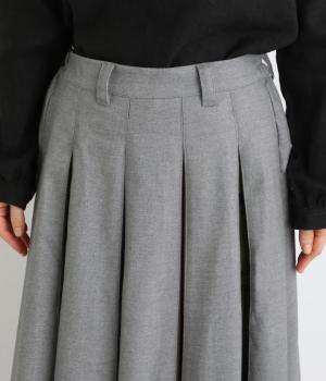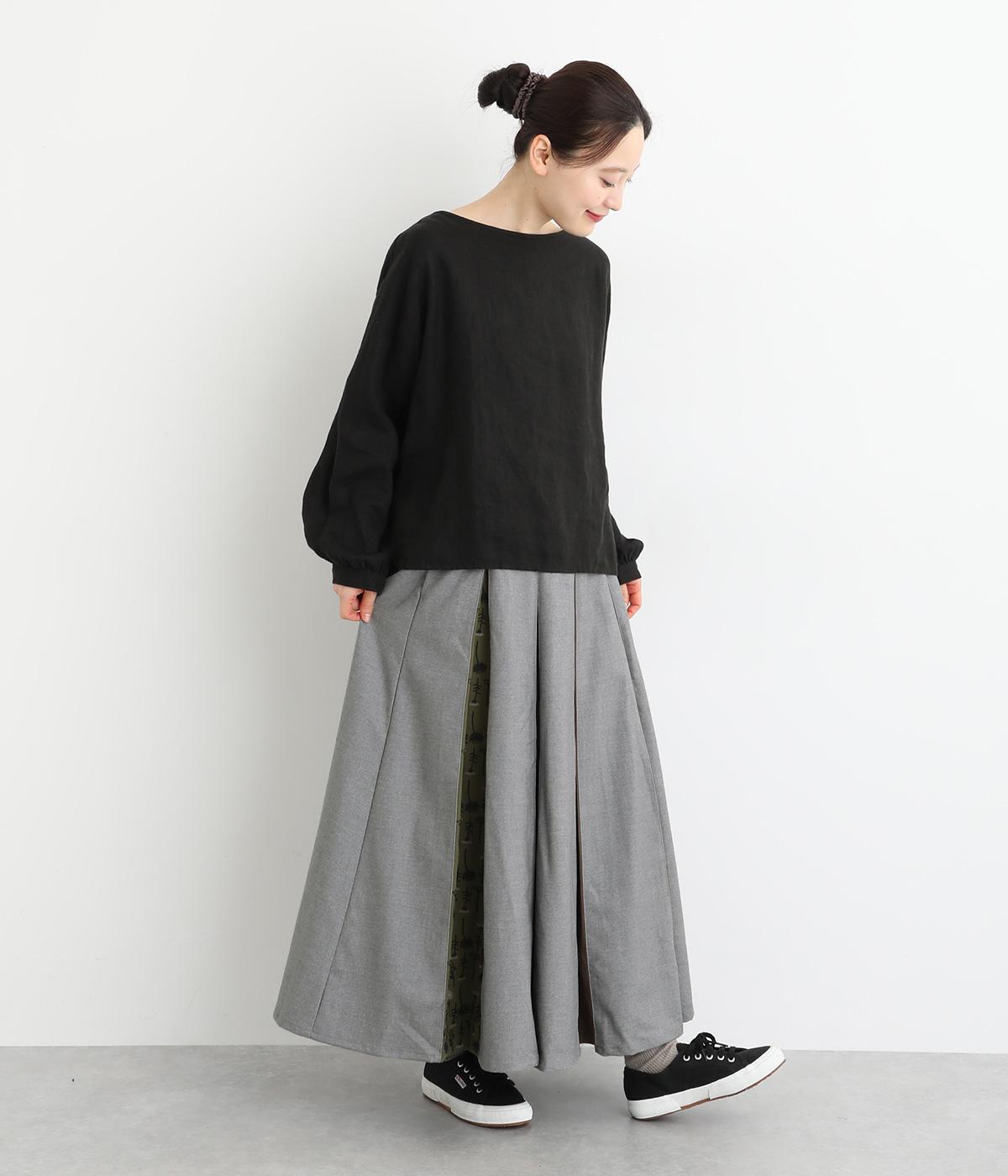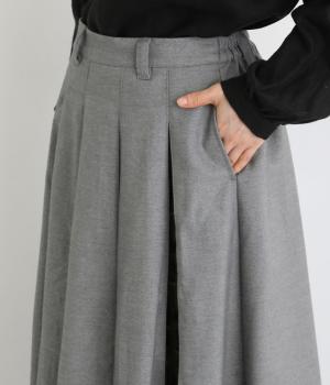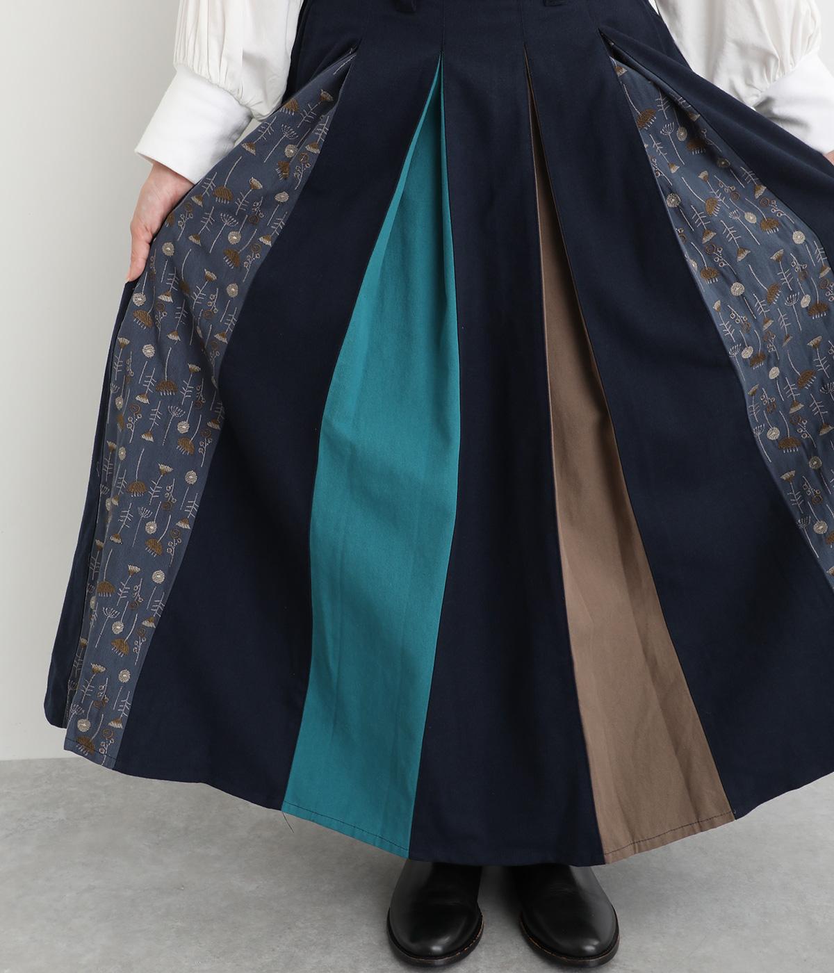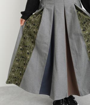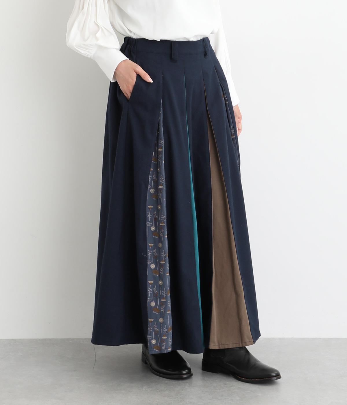 前面にプリーツをほどこし、ひだの内側に花柄刺しゅうや別布を合わせました。動きに合わせてふわりと広がり、さまざまな色をのぞかせて華やかさを添えます。ウエストはゴム仕様でベルトループ付きになっています。
