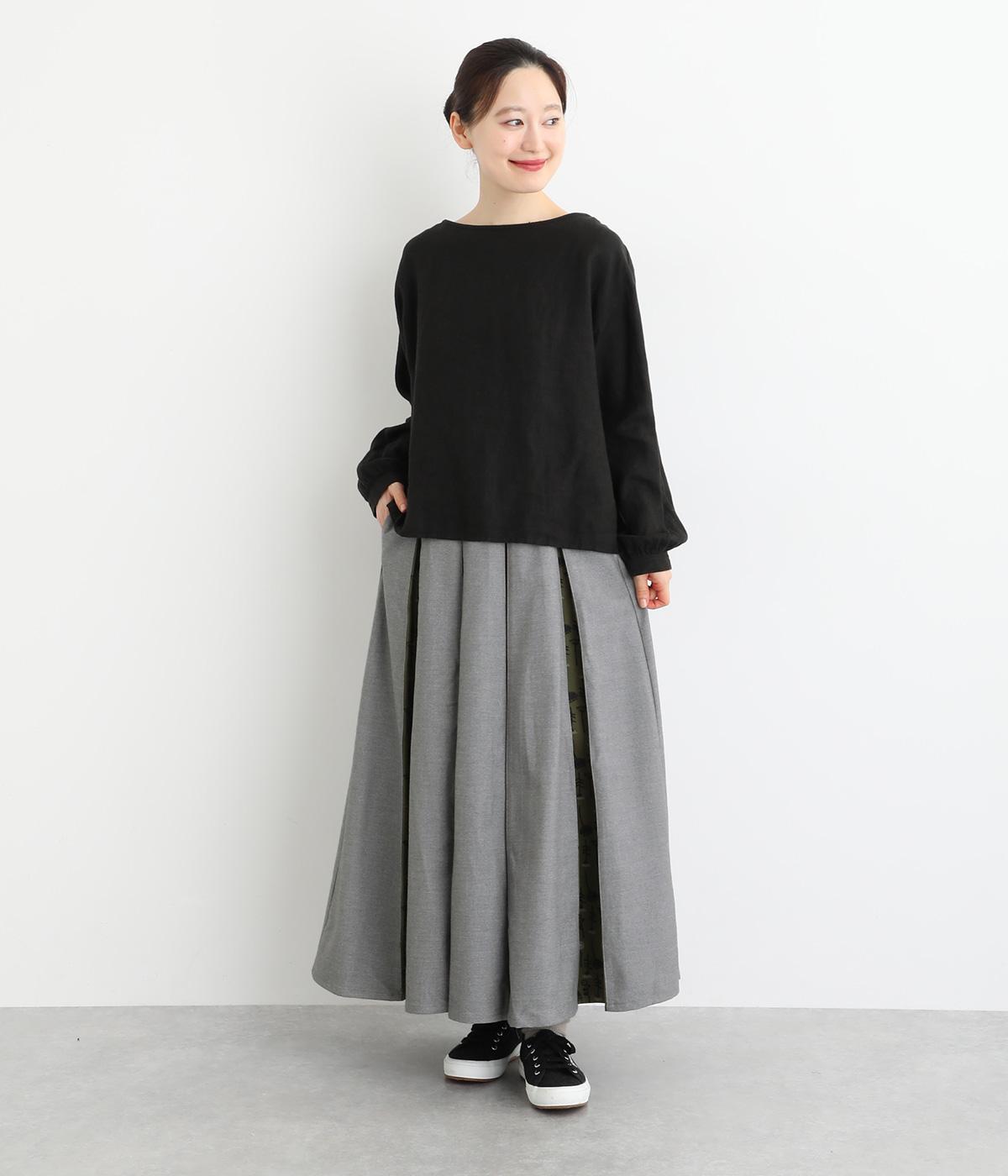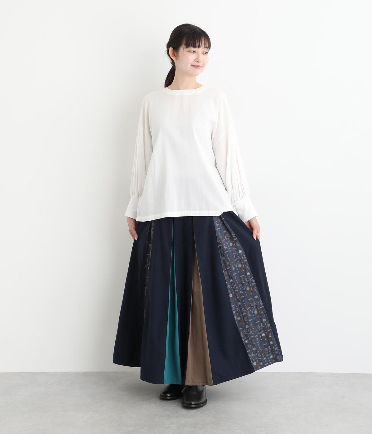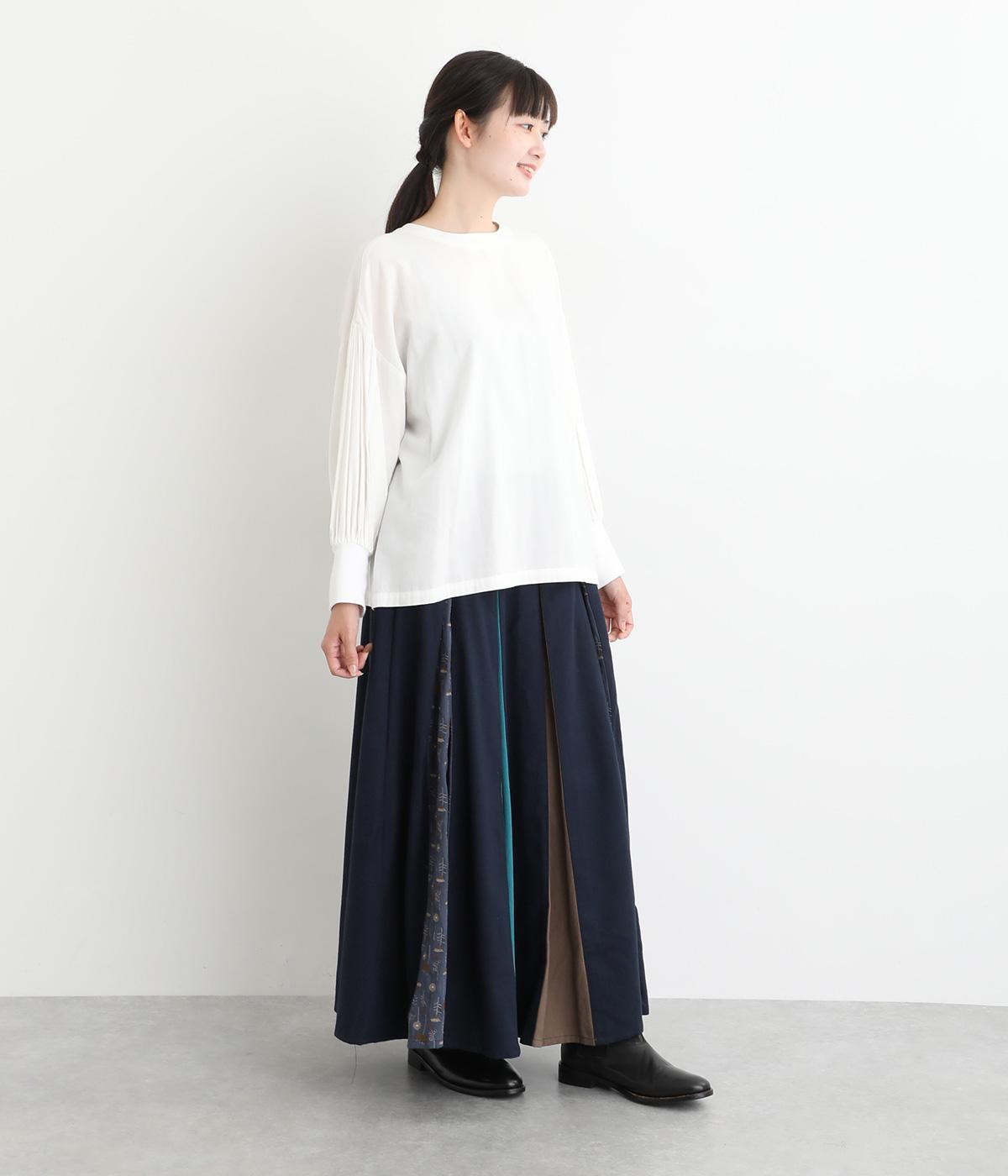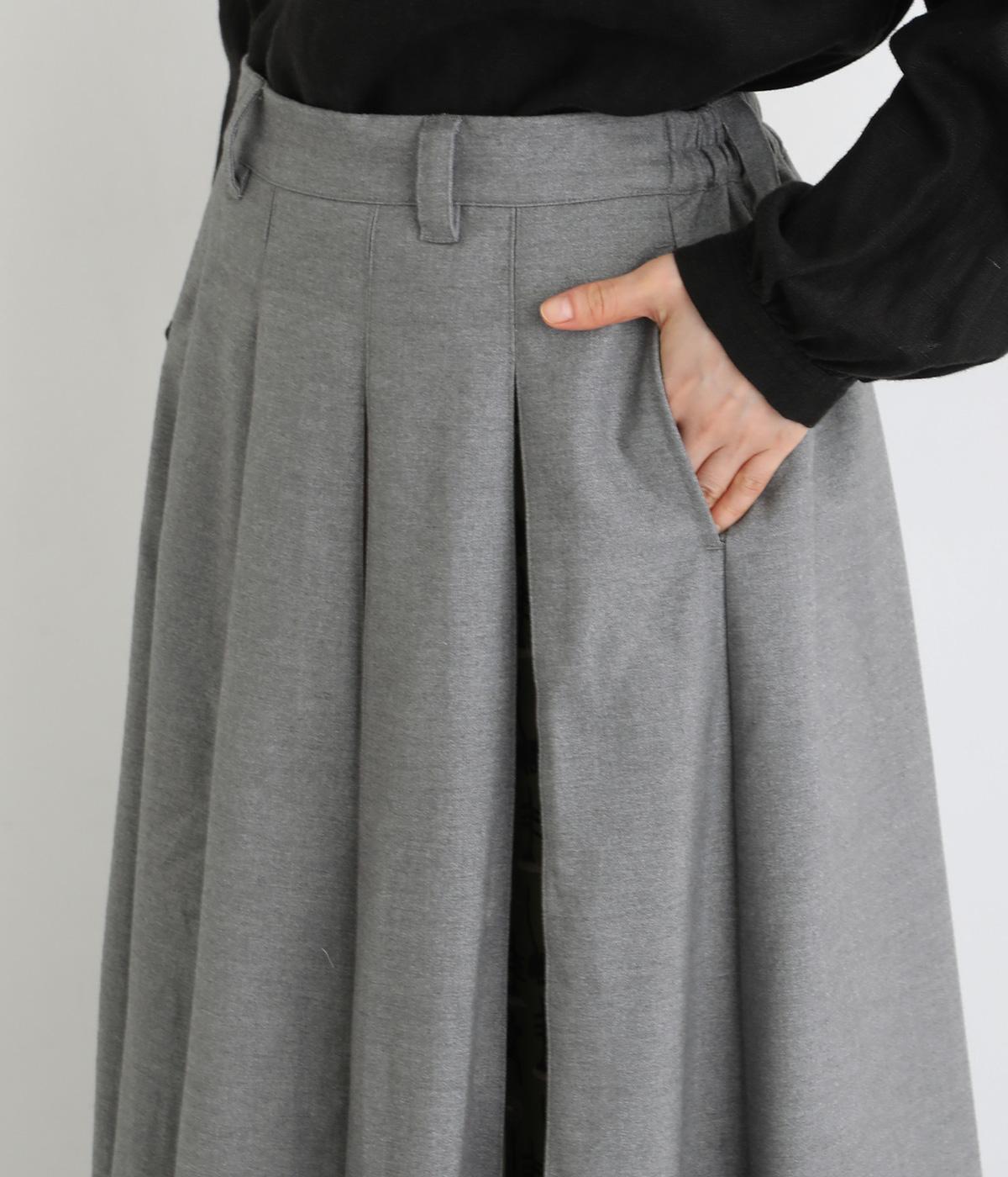 前面にプリーツをほどこし、ひだの内側に花柄刺しゅうや別布を合わせました。動きに合わせてふわりと広がり、さまざまな色をのぞかせて華やかさを添えます。ウエストはゴム仕様でベルトループ付きになっています。