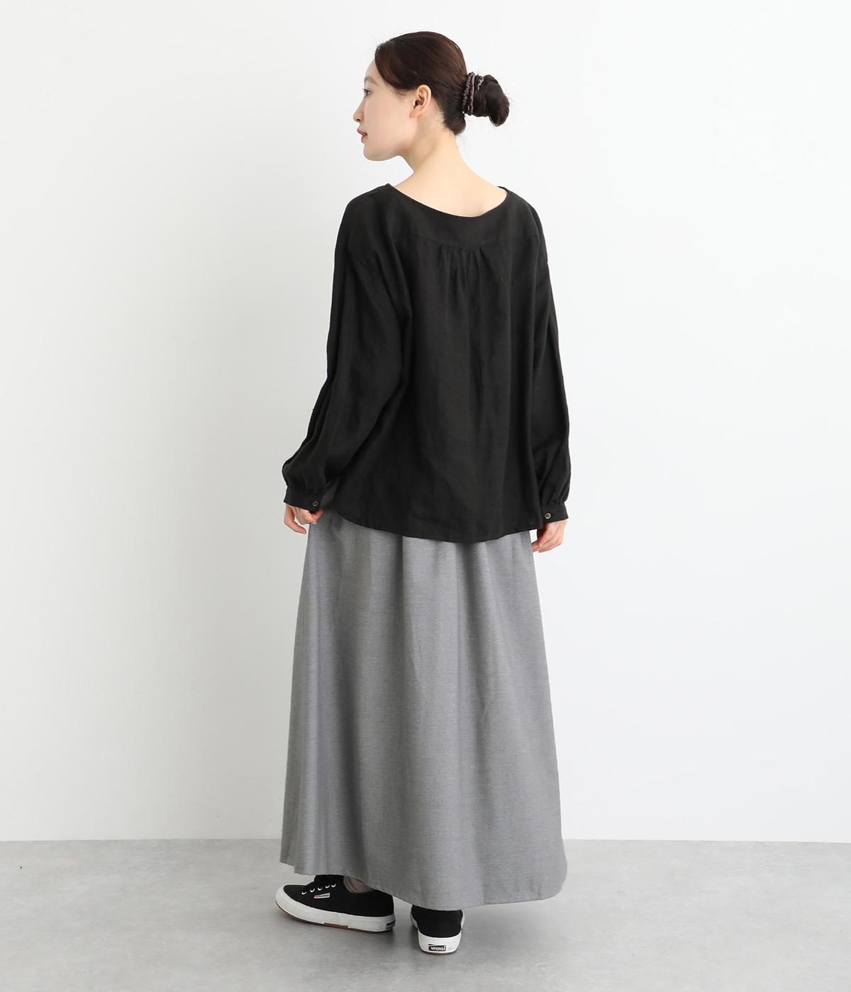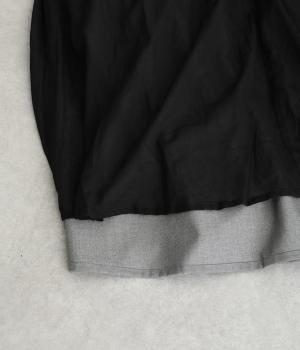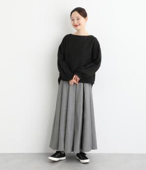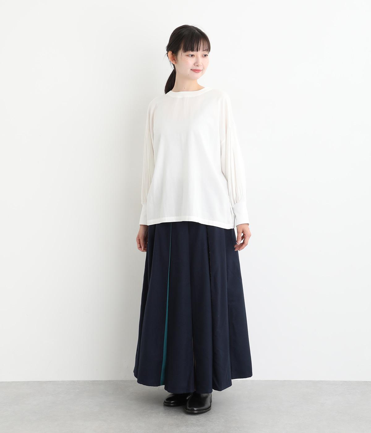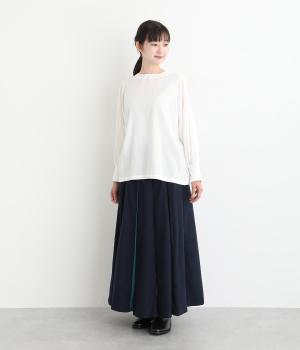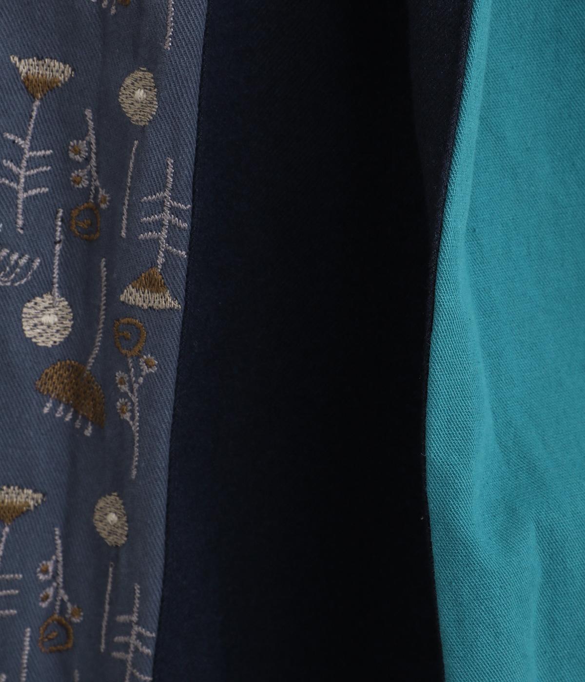 前面にプリーツをほどこし、ひだの内側に花柄刺しゅうや別布を合わせました。動きに合わせてふわりと広がり、さまざまな色をのぞかせて華やかさを添えます。ウエストはゴム仕様でベルトループ付きになっています。