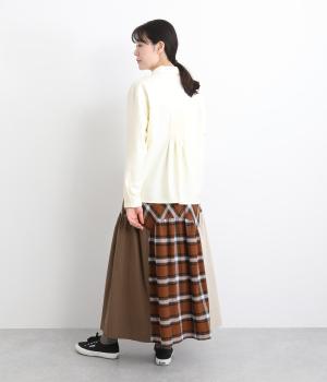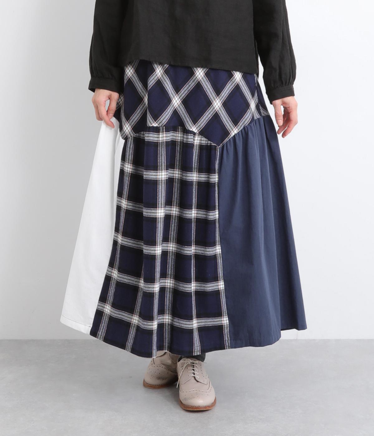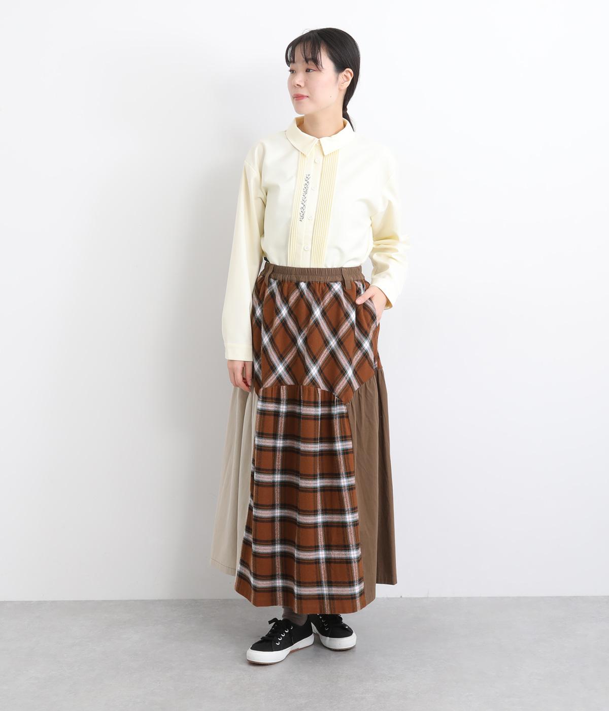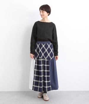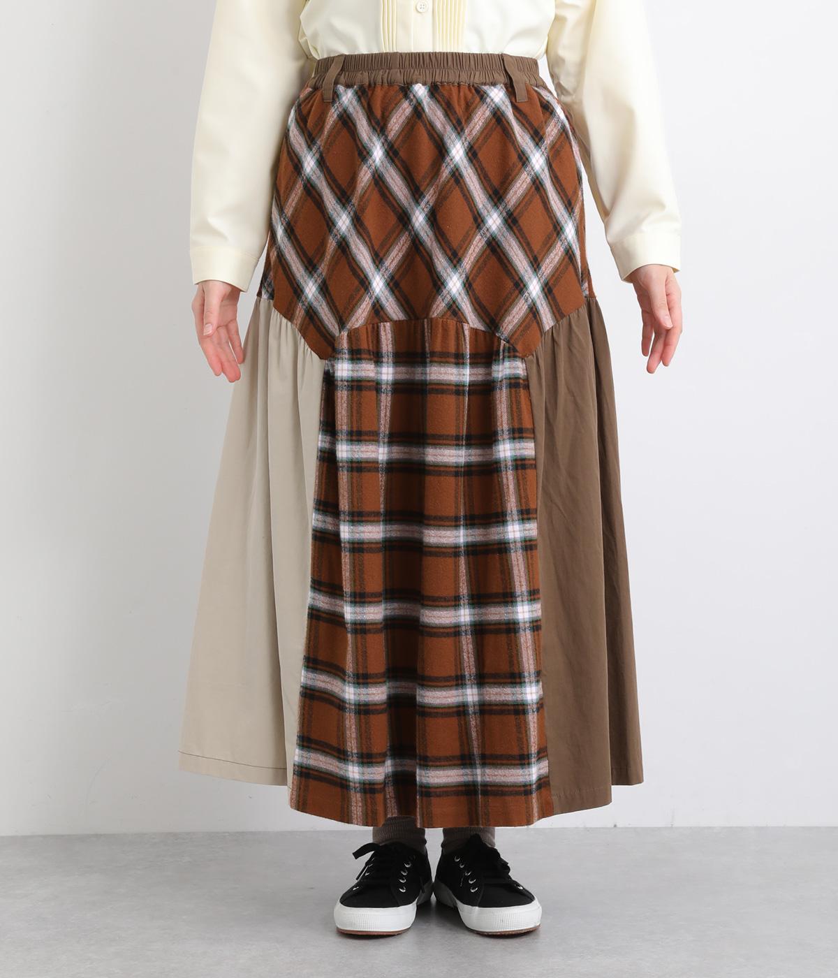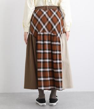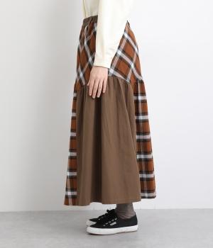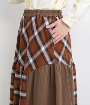 柄生地と無地の異素材を切り替えた、着こなしのポイントになるスカート。落ち着いた配色にロング丈で、大人のチェック柄アイテムに仕上がっています。ウエストは総ゴムでフィット感も良く、ループつきでベルトを合わせても◎。