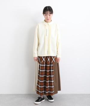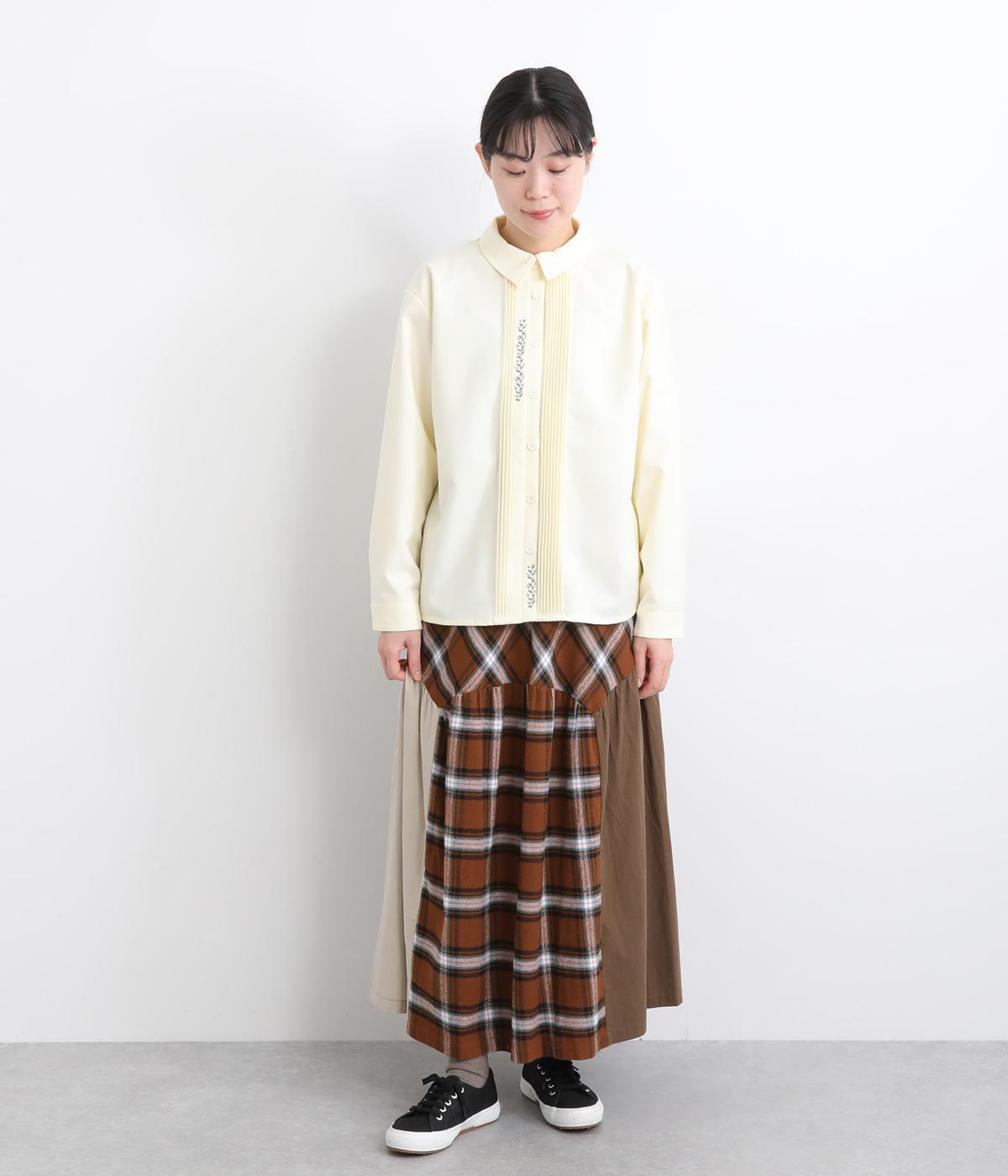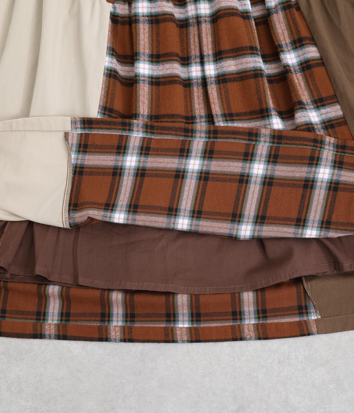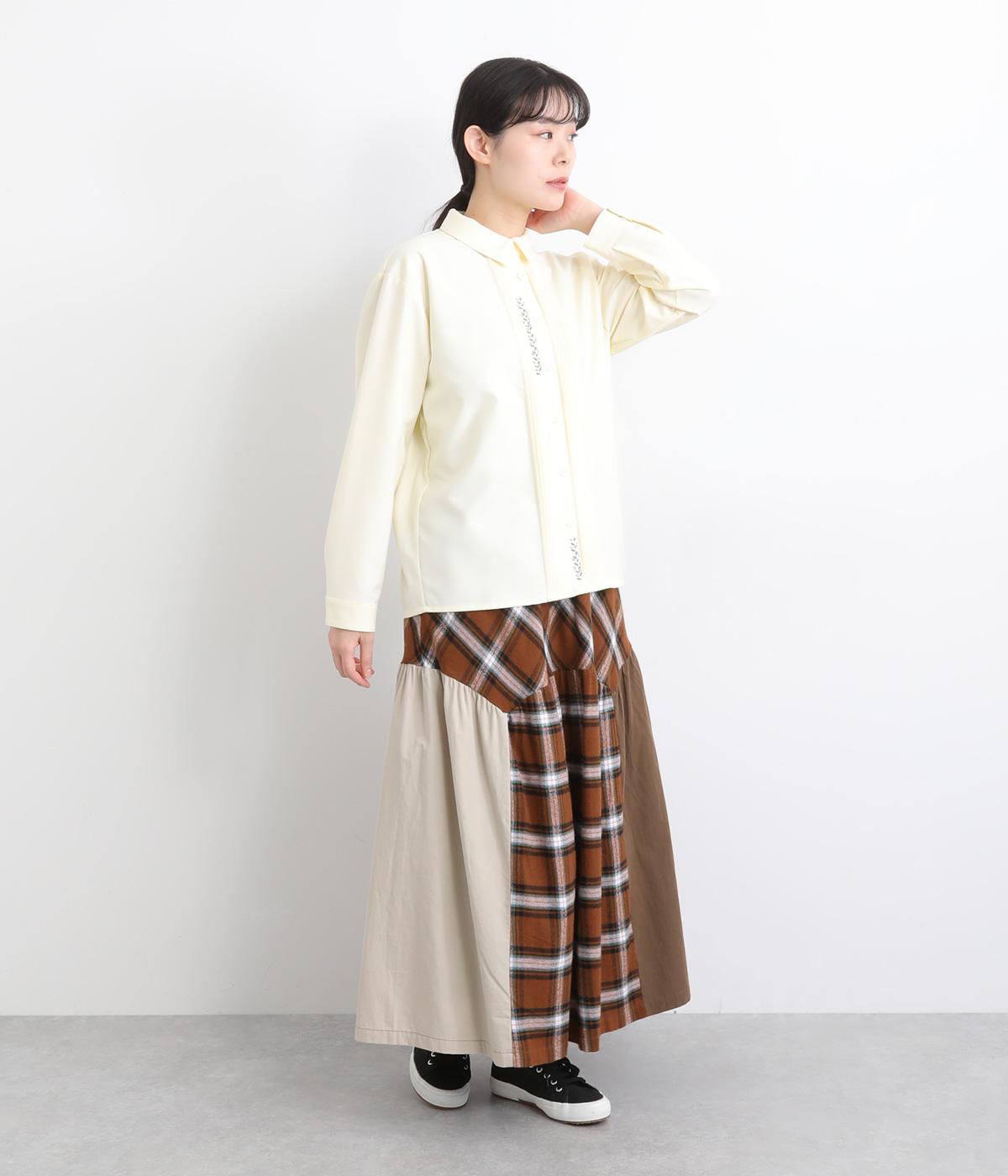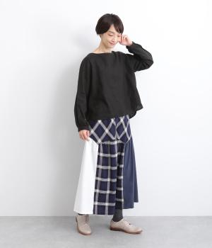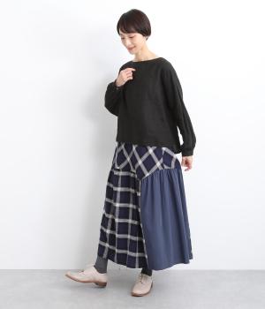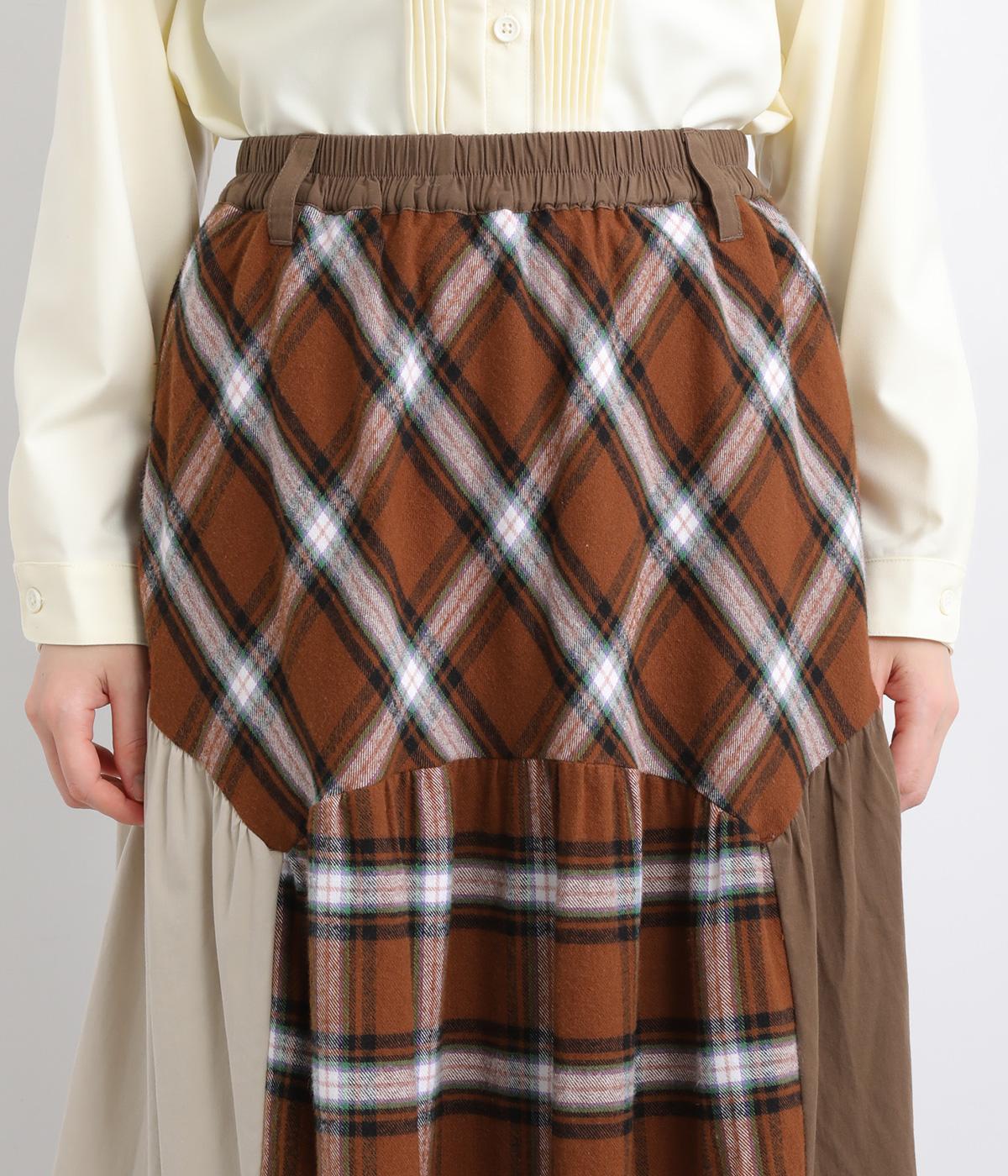 柄生地と無地の異素材を切り替えた、着こなしのポイントになるスカート。落ち着いた配色にロング丈で、大人のチェック柄アイテムに仕上がっています。ウエストは総ゴムでフィット感も良く、ループつきでベルトを合わせても◎。