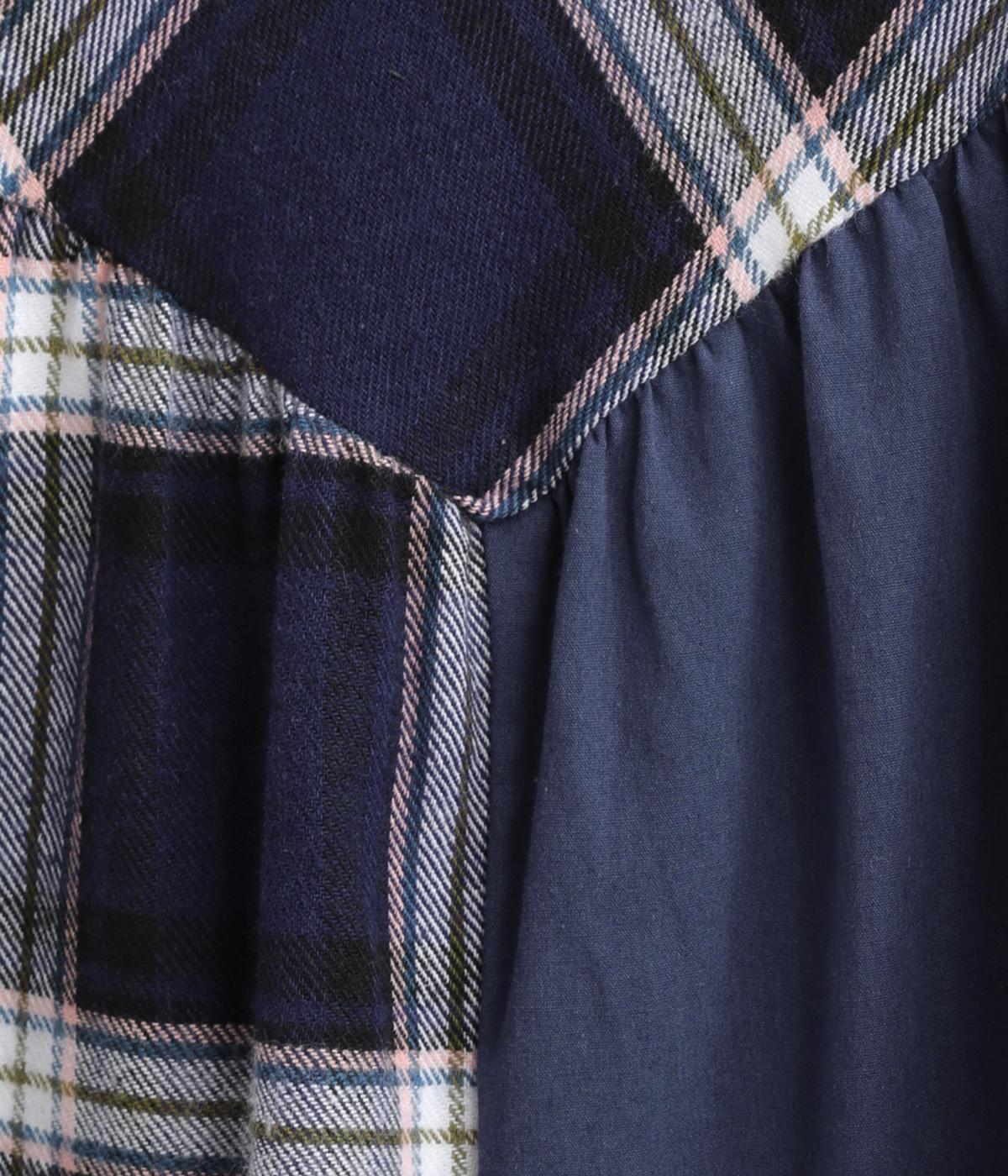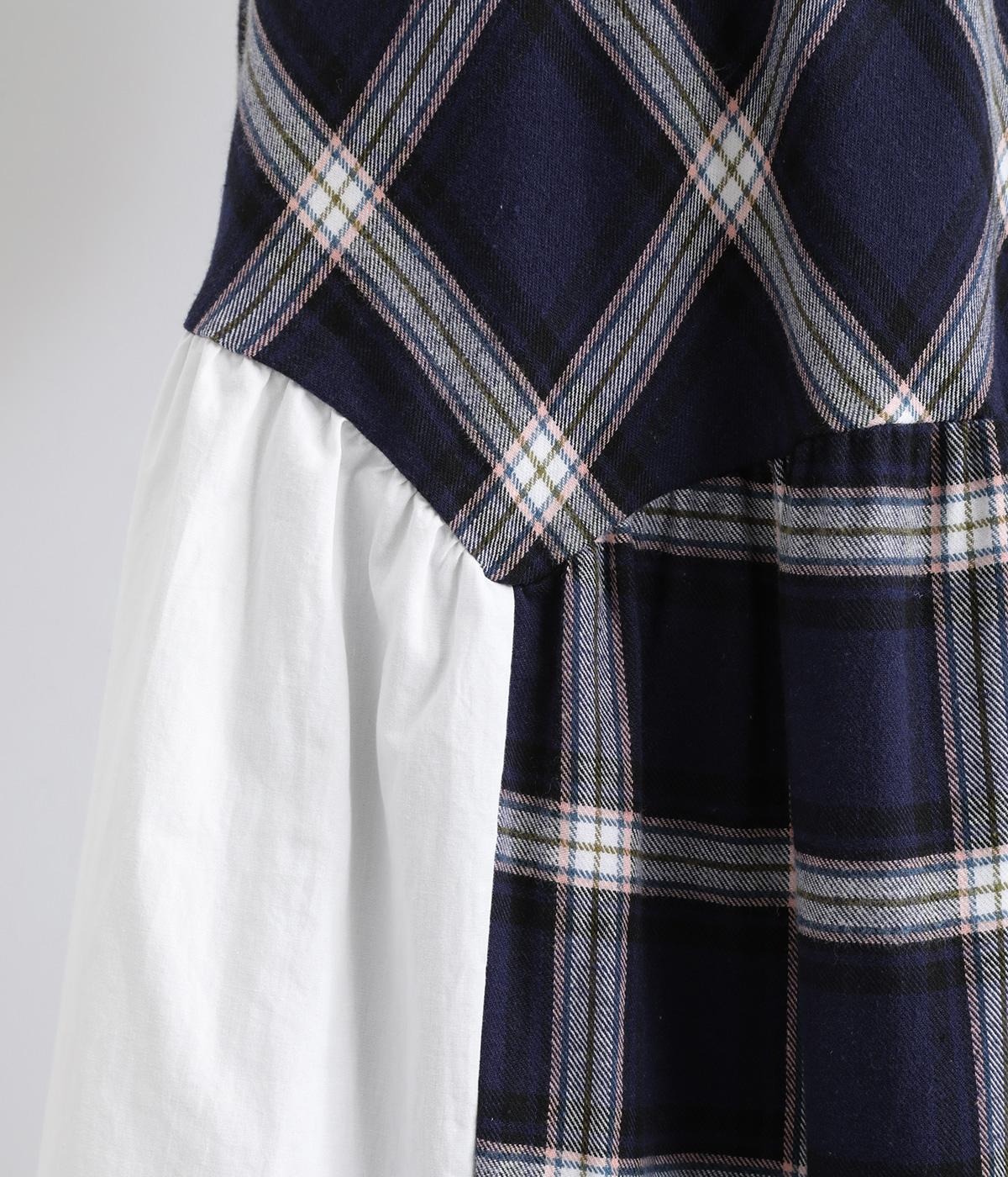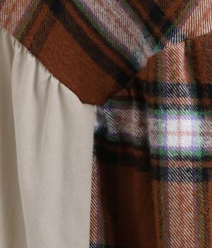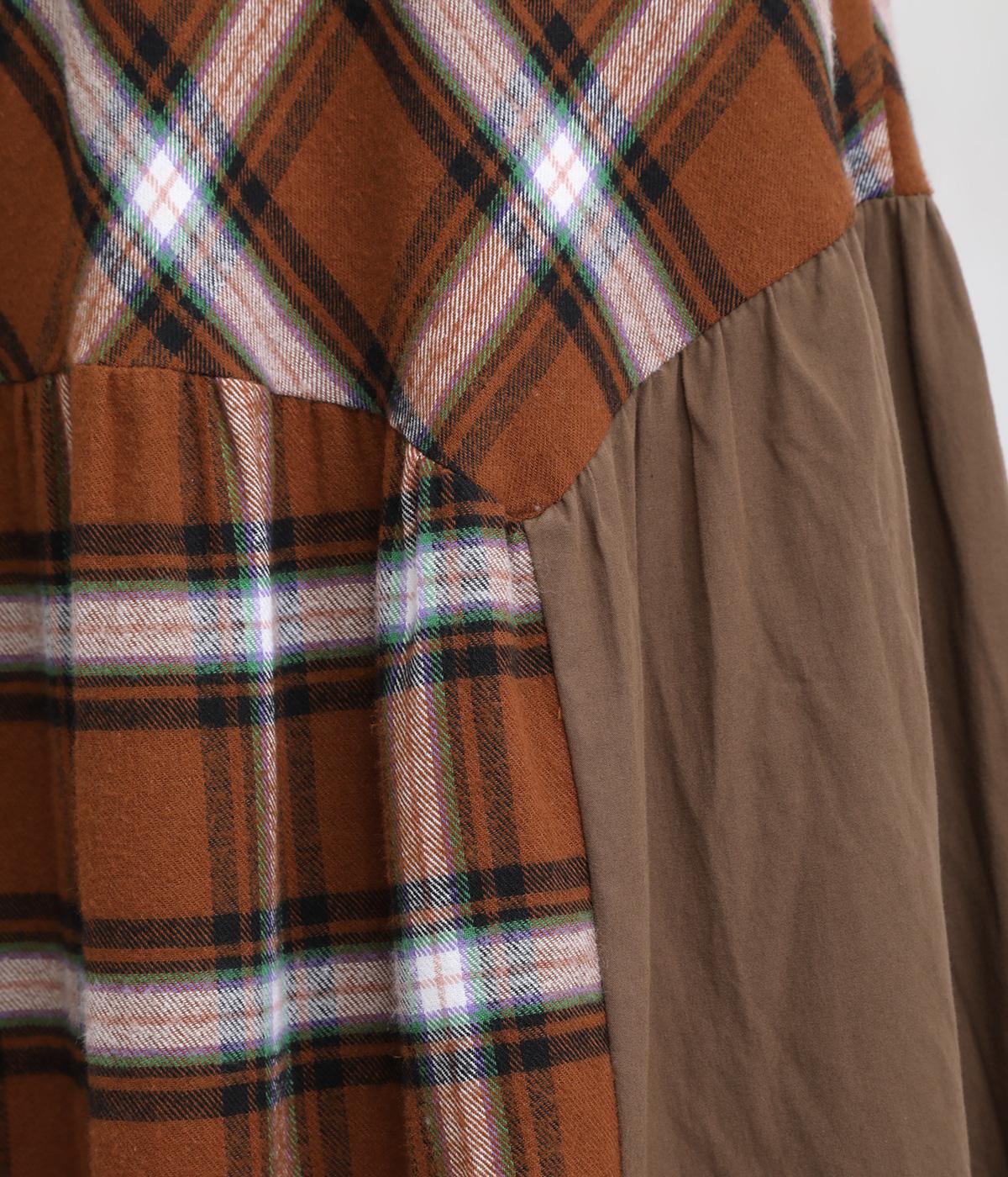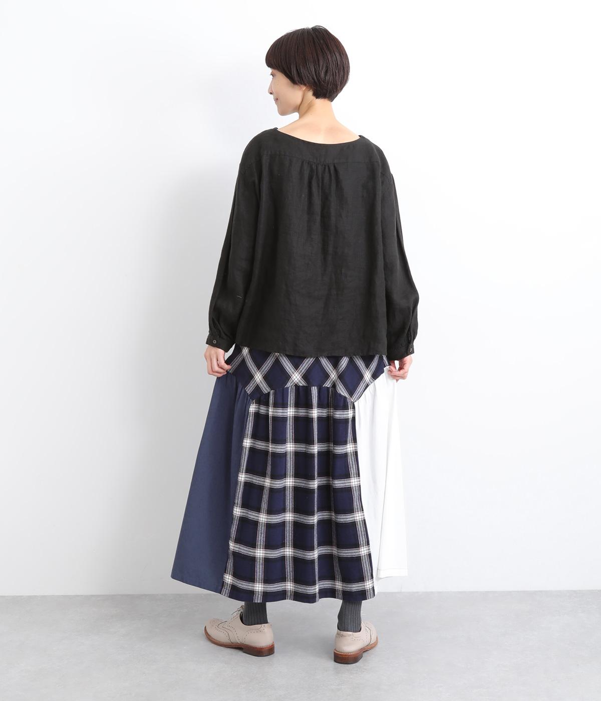 柄生地と無地の異素材を切り替えた、着こなしのポイントになるスカート。落ち着いた配色にロング丈で、大人のチェック柄アイテムに仕上がっています。ウエストは総ゴムでフィット感も良く、ループつきでベルトを合わせても◎。