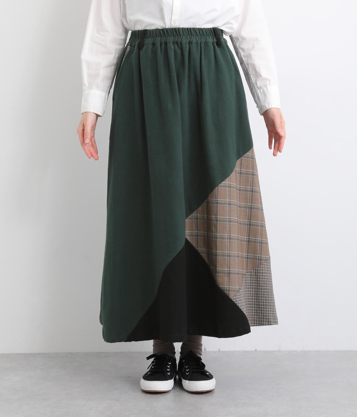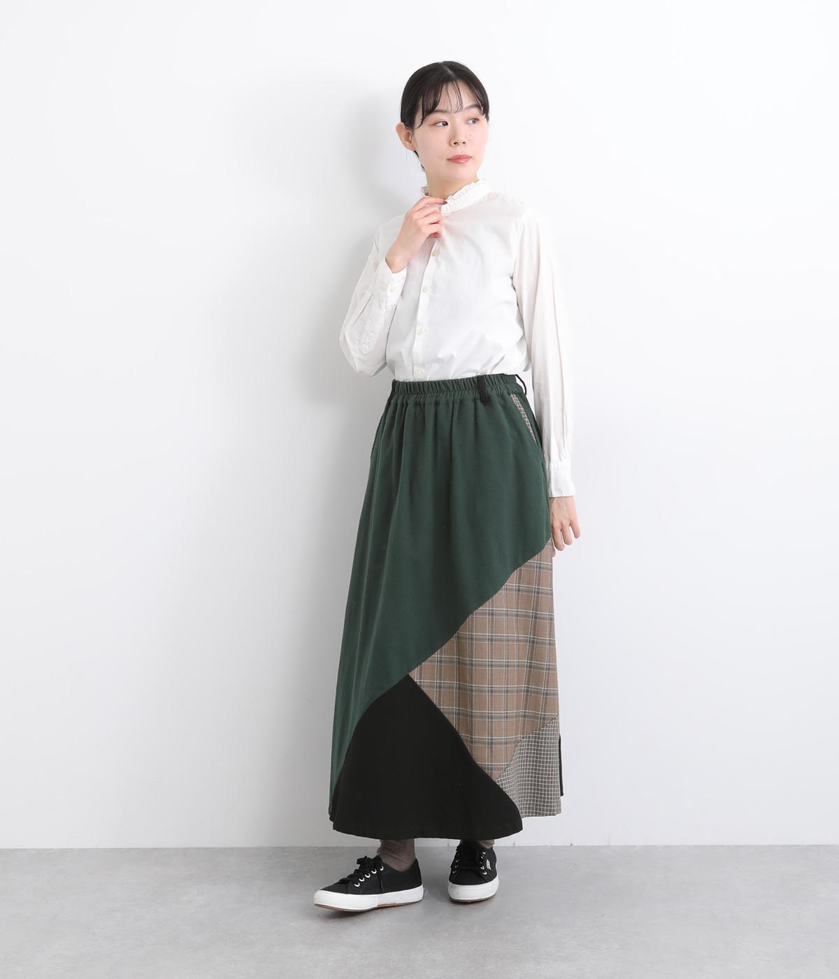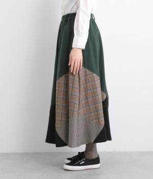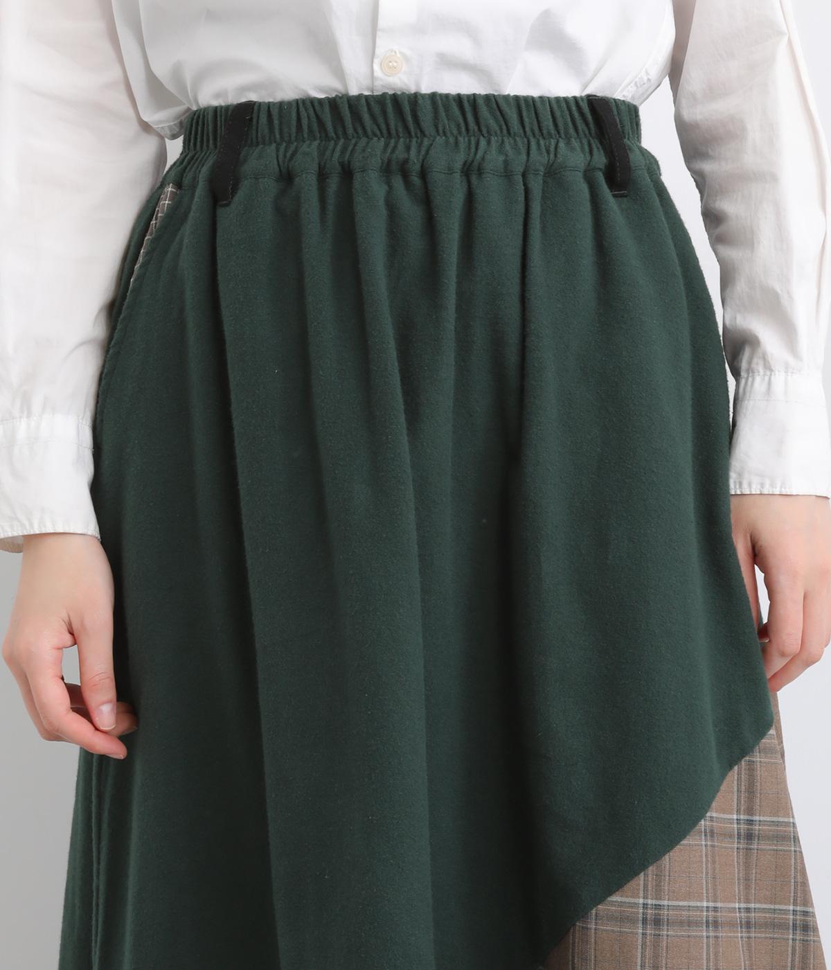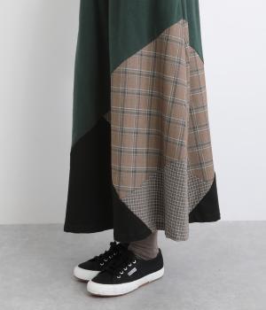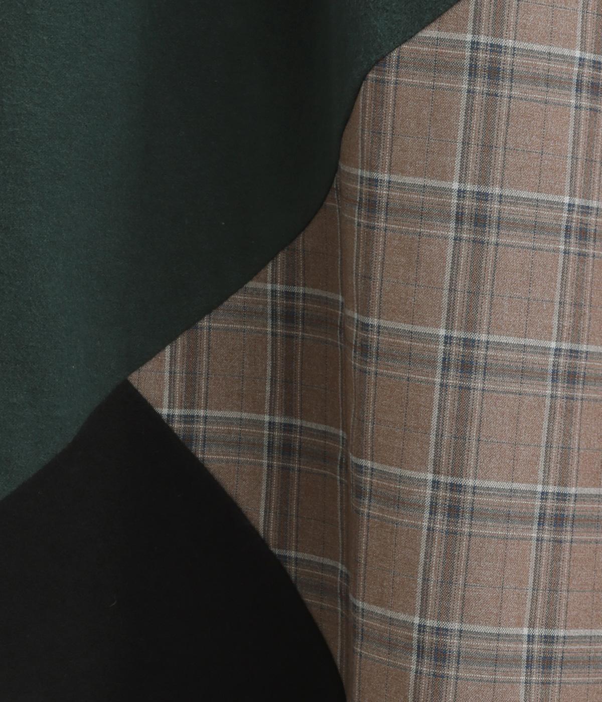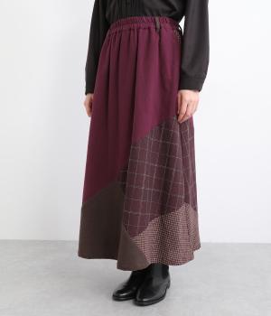 2種類のチェック柄や起毛生地を組み合わせた、アシンメトリーデザインが目を惹きます。わずかにドレープがきいた優雅なシルエットに深みのある配色が◎。ベルトループも配色仕様でこだわりが詰まった一枚。ウエスト総ゴム仕立てです。