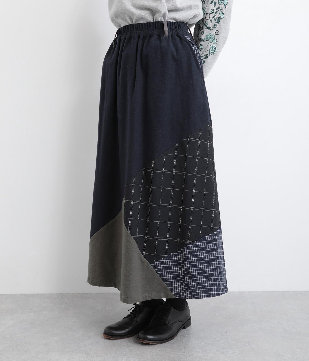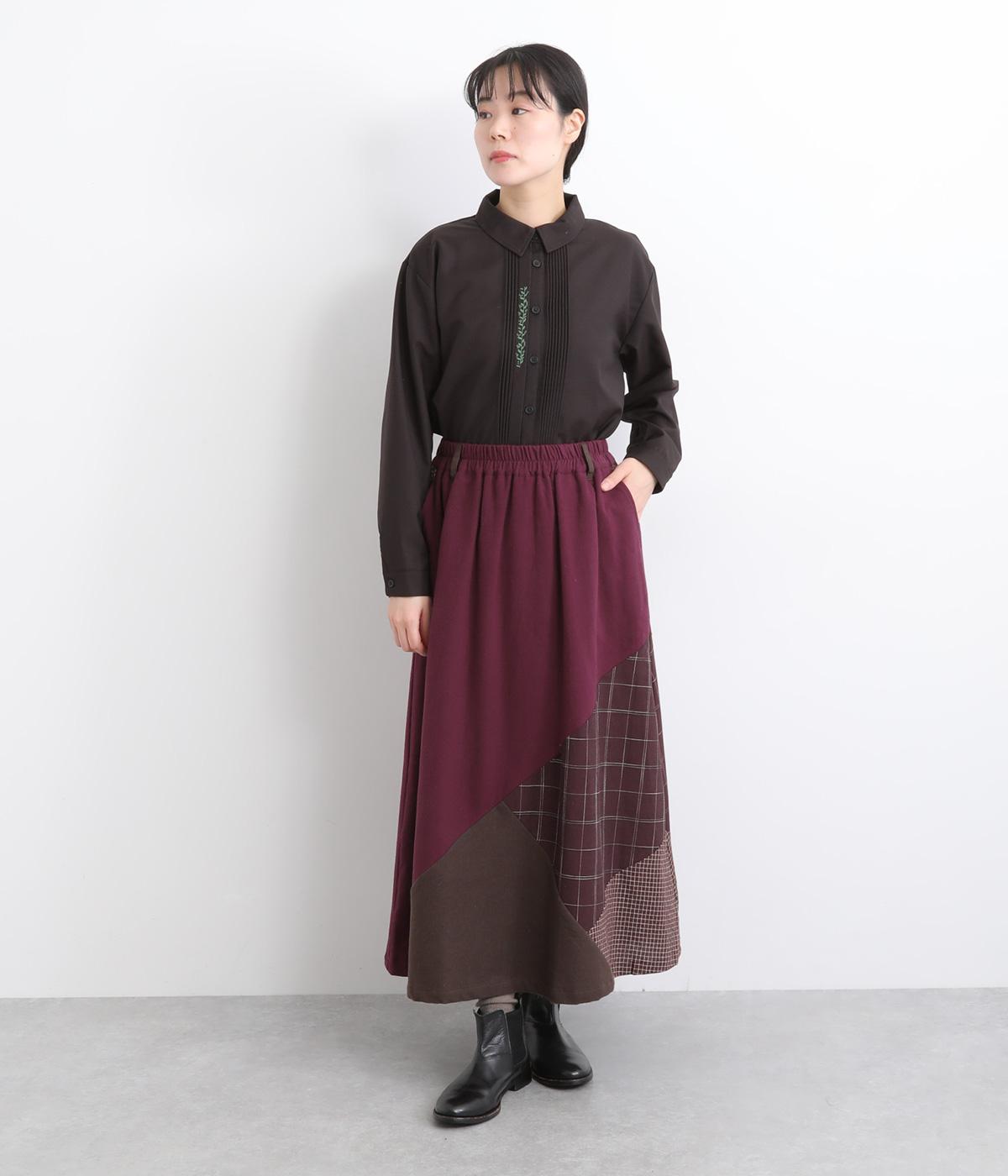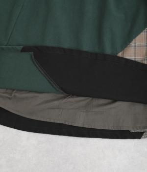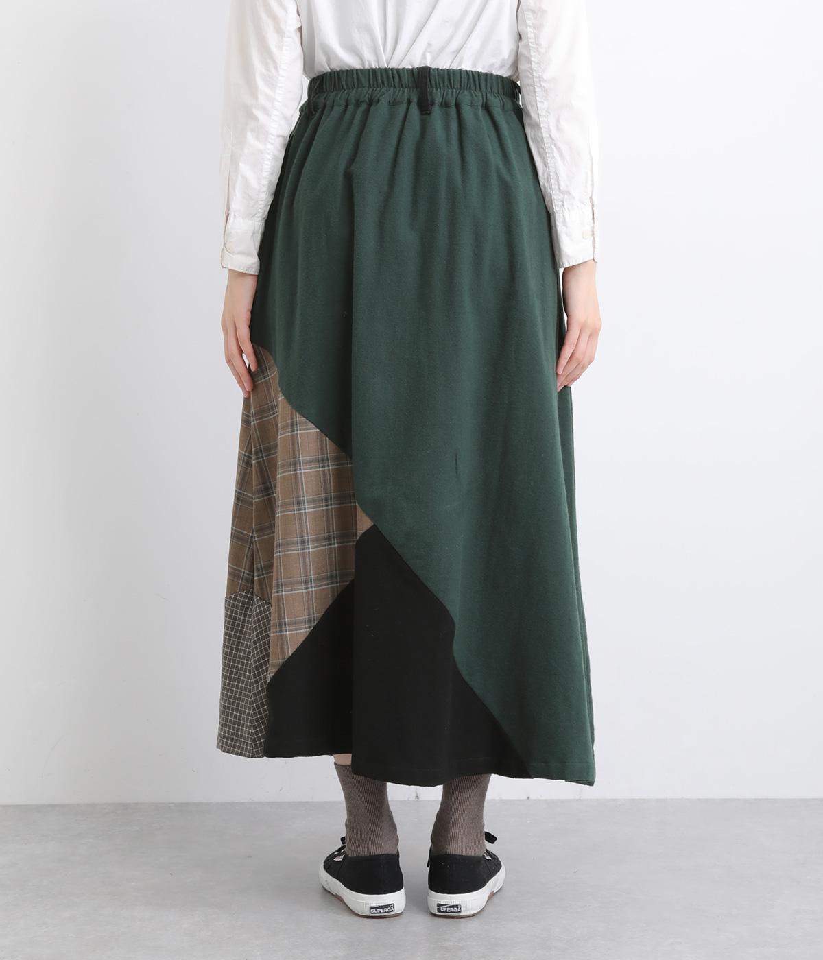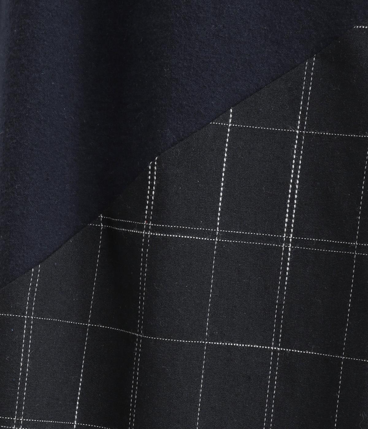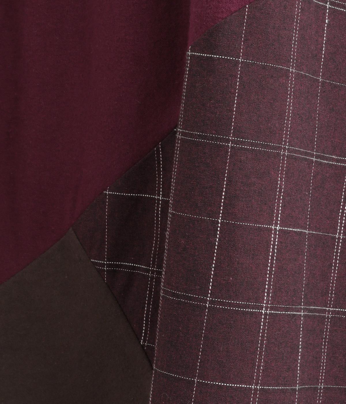 2種類のチェック柄や起毛生地を組み合わせた、アシンメトリーデザインが目を惹きます。わずかにドレープがきいた優雅なシルエットに深みのある配色が◎。ベルトループも配色仕様でこだわりが詰まった一枚。ウエスト総ゴム仕立てです。