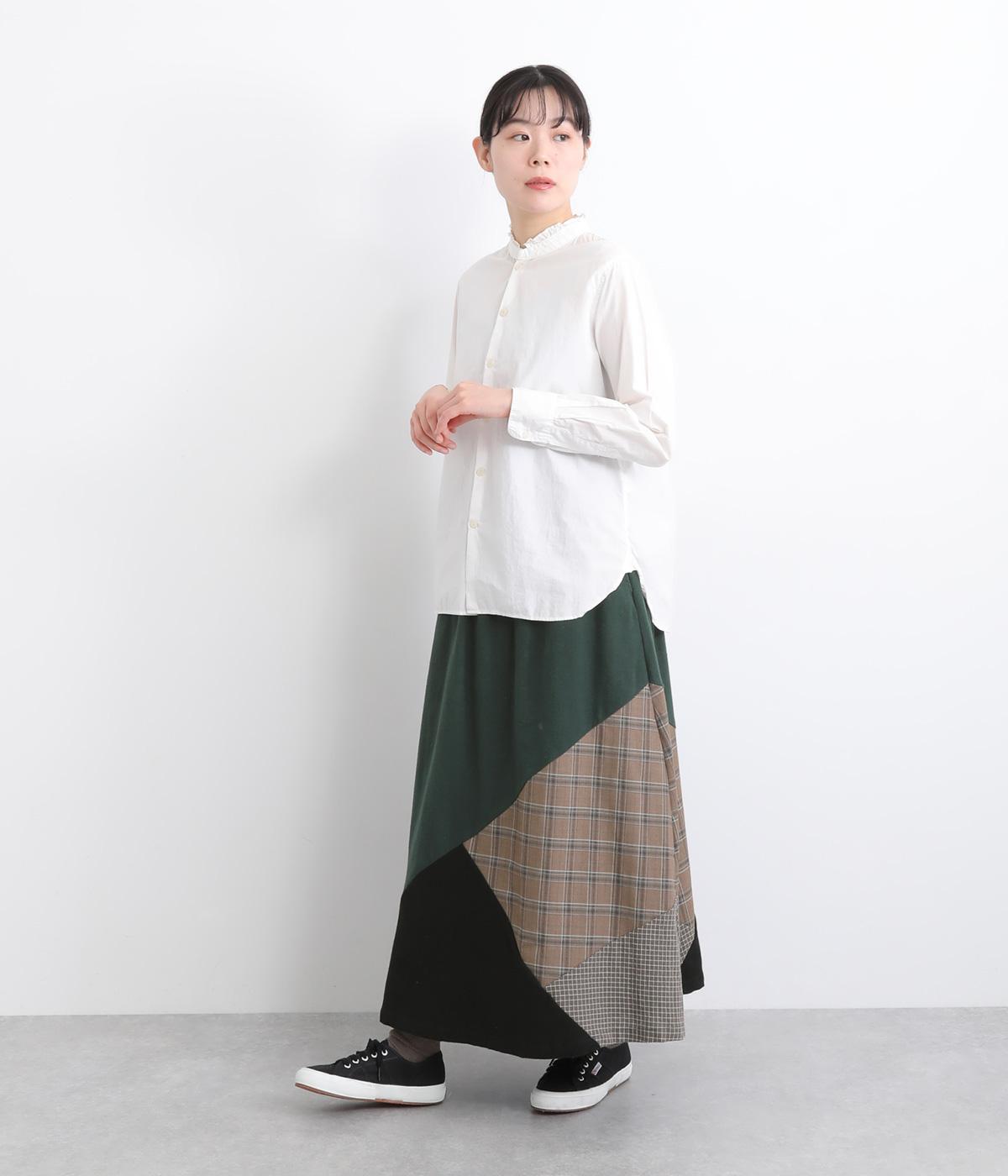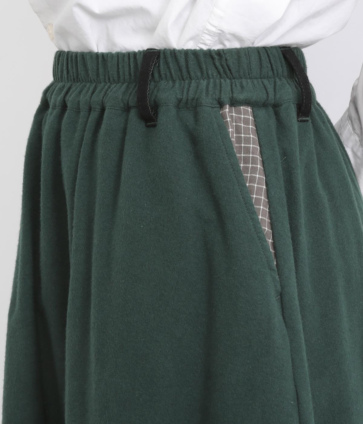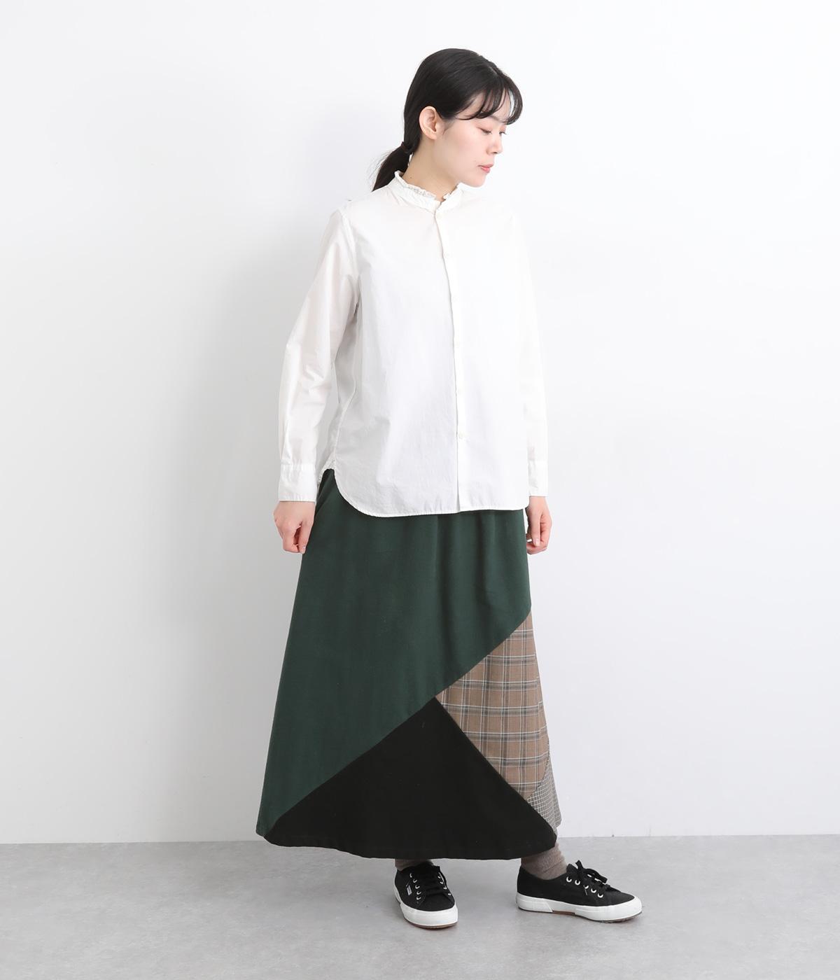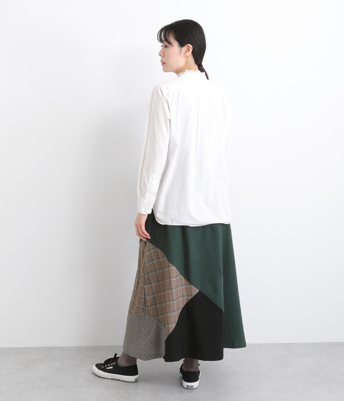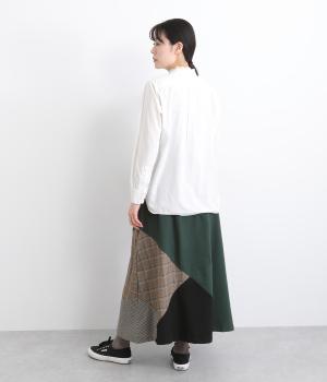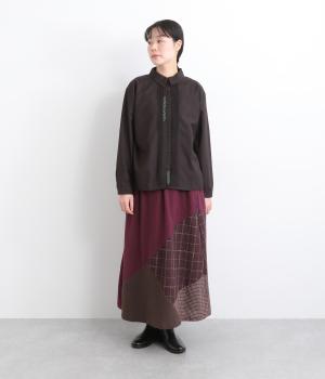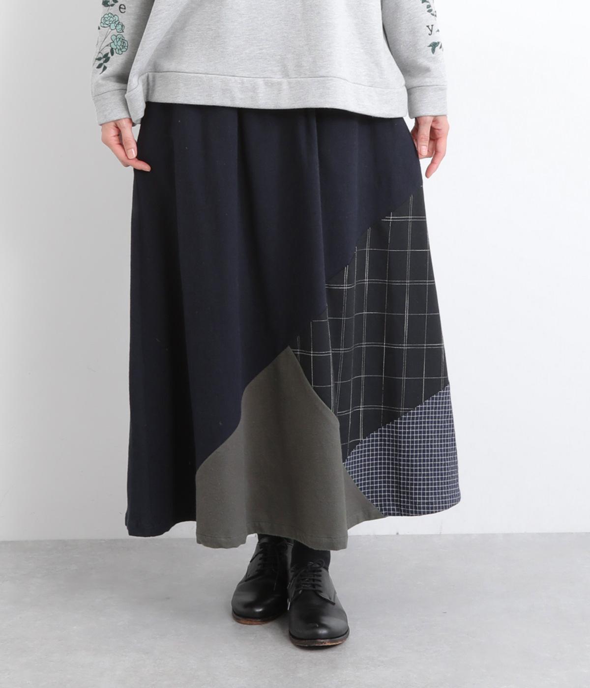 2種類のチェック柄や起毛生地を組み合わせた、アシンメトリーデザインが目を惹きます。わずかにドレープがきいた優雅なシルエットに深みのある配色が◎。ベルトループも配色仕様でこだわりが詰まった一枚。ウエスト総ゴム仕立てです。
