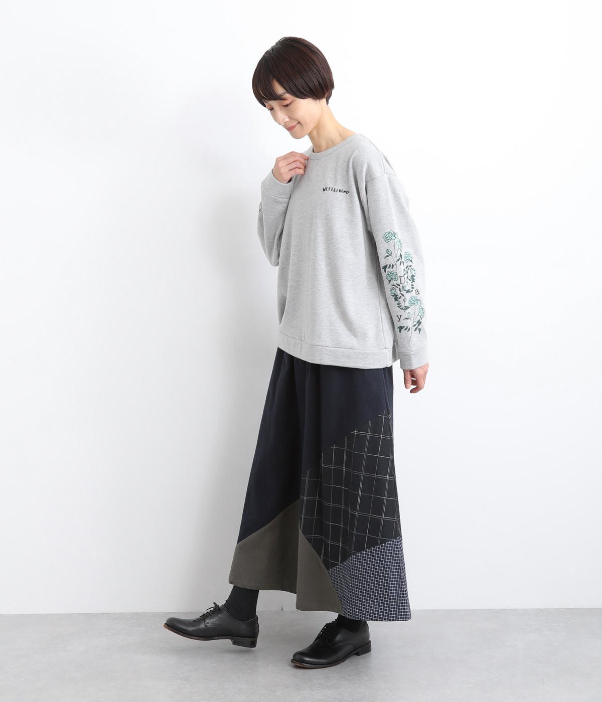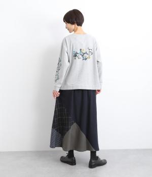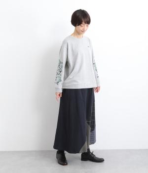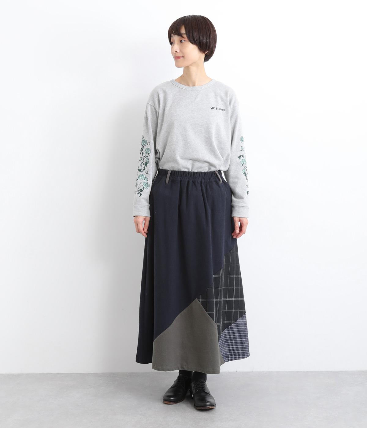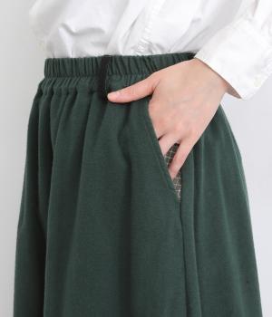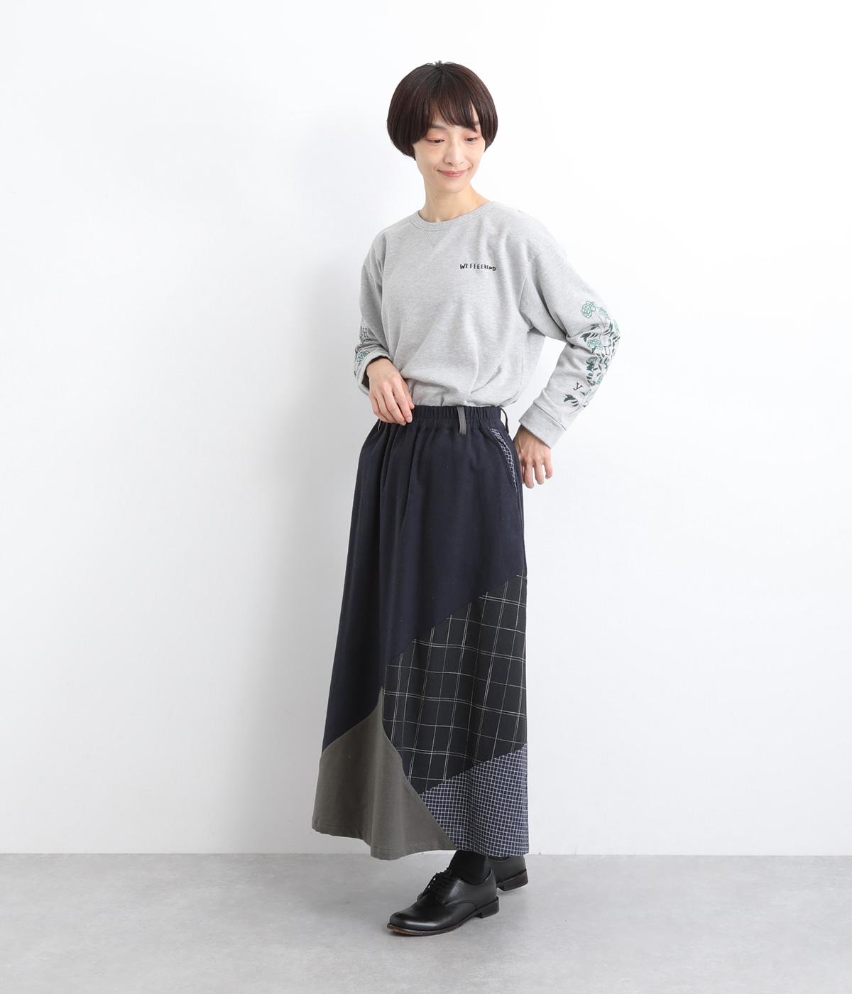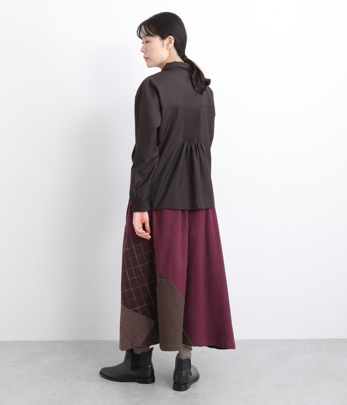 2種類のチェック柄や起毛生地を組み合わせた、アシンメトリーデザインが目を惹きます。わずかにドレープがきいた優雅なシルエットに深みのある配色が◎。ベルトループも配色仕様でこだわりが詰まった一枚。ウエスト総ゴム仕立てです。