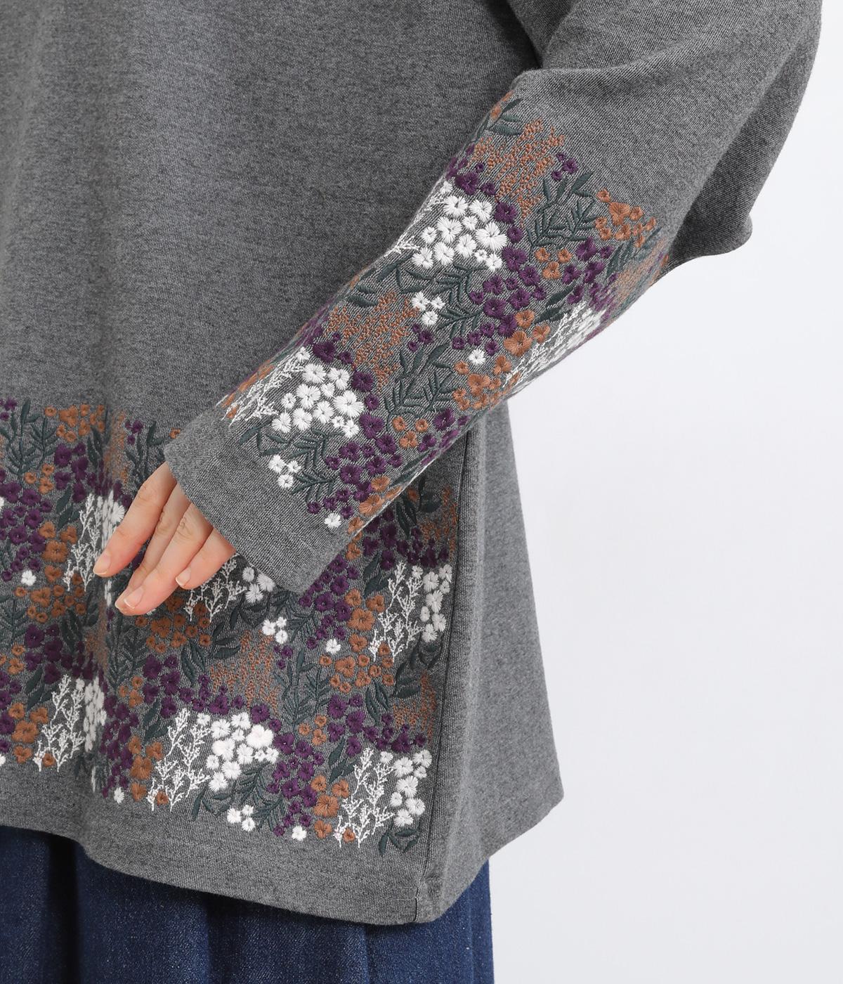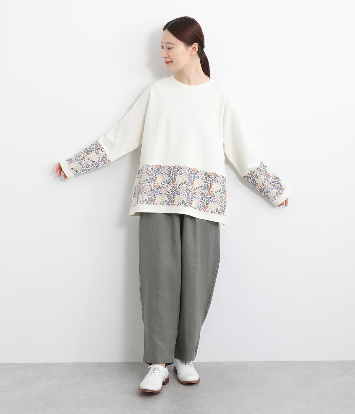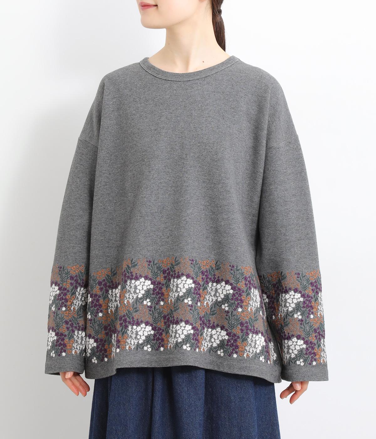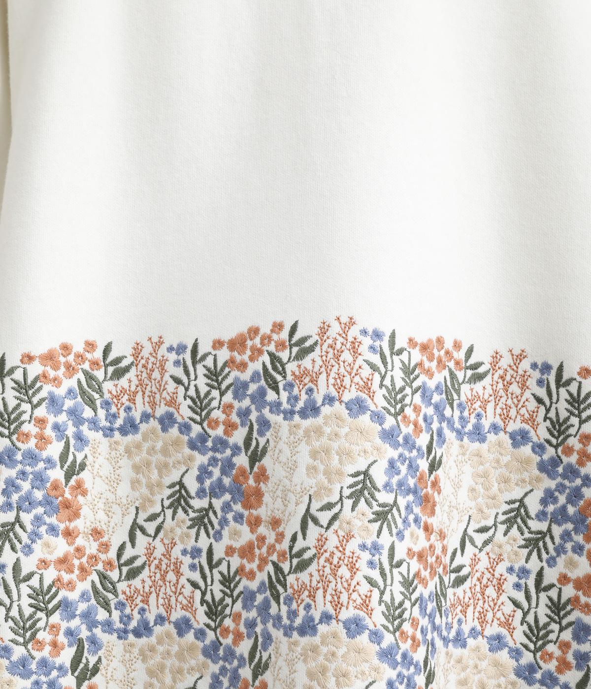 前身頃の裾と袖に、花畑のような繊細な刺しゅうをあしらったプルオーバー。アクセントになりつつも派手すぎないカラーリングで、着こなしを大人かわいく仕上げてくれます。ゆったりとした身幅と長めの着丈も、メリハリのある刺しゅうで間延びせずにすっきり見えするのが◎です。