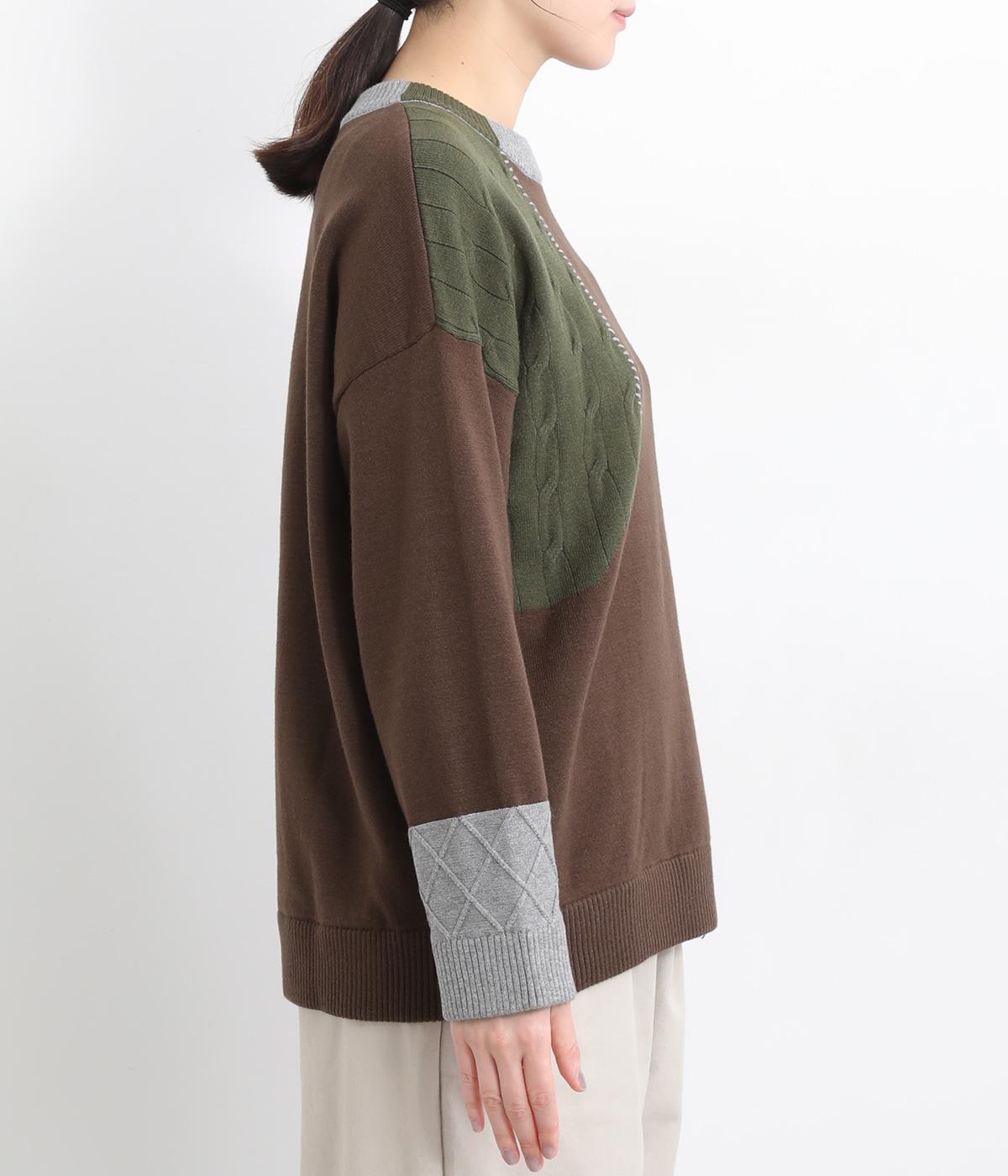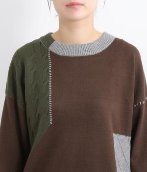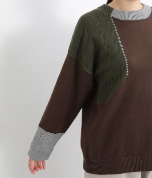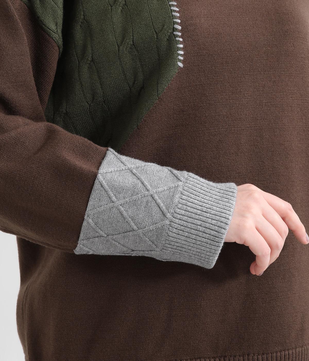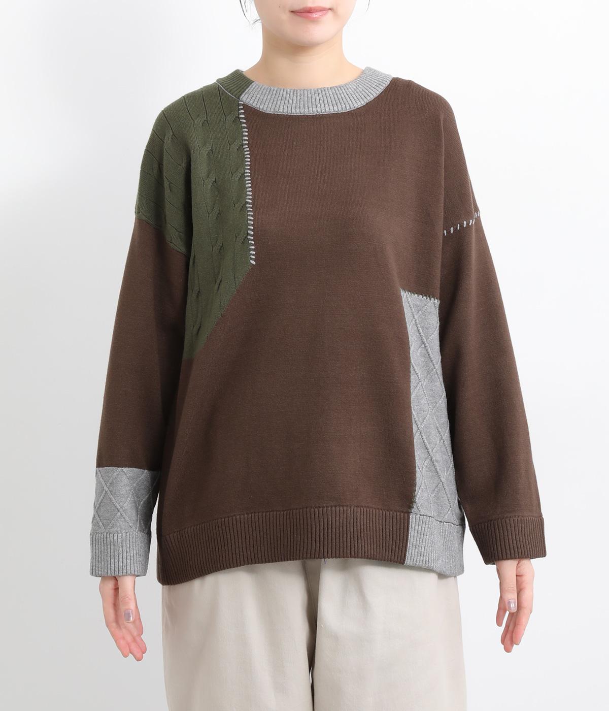 パッチワークのような配色デザインが目を引くプルオーバー。どこかあたたかみを感じるケーブル編みや格子柄、ステッチをあしらっています。体のラインを拾いにくいゆったりとしたサイズ感も◎。一枚で着映えが叶う、頼れるアイテムです。