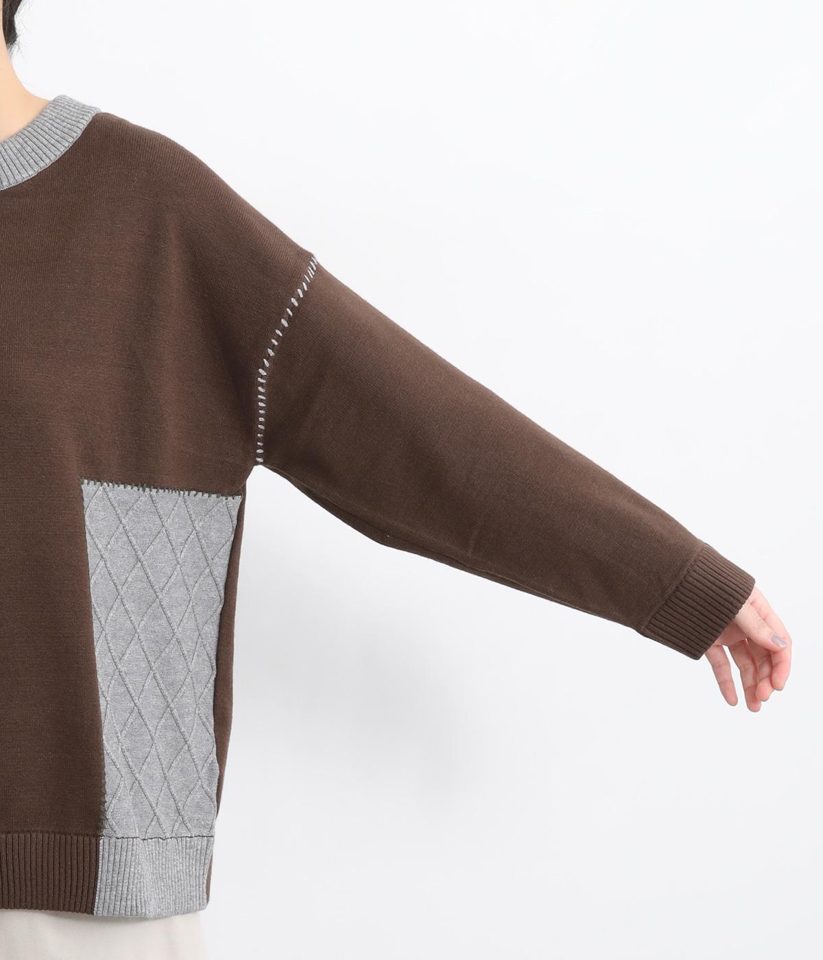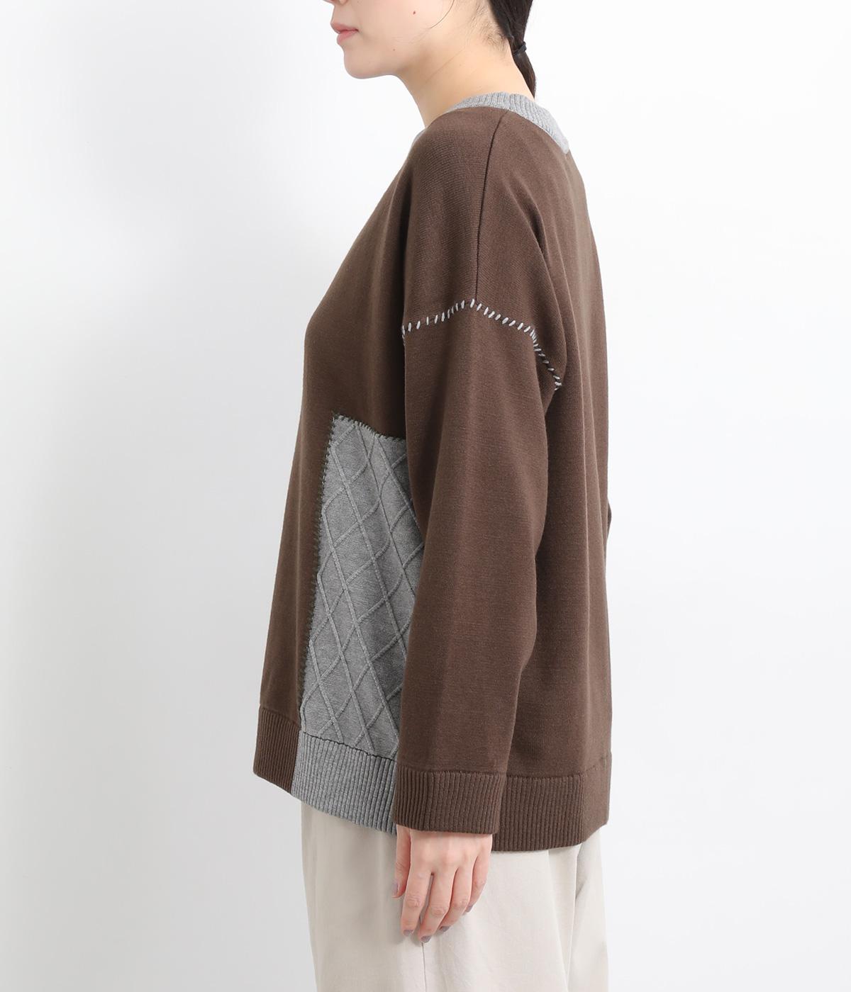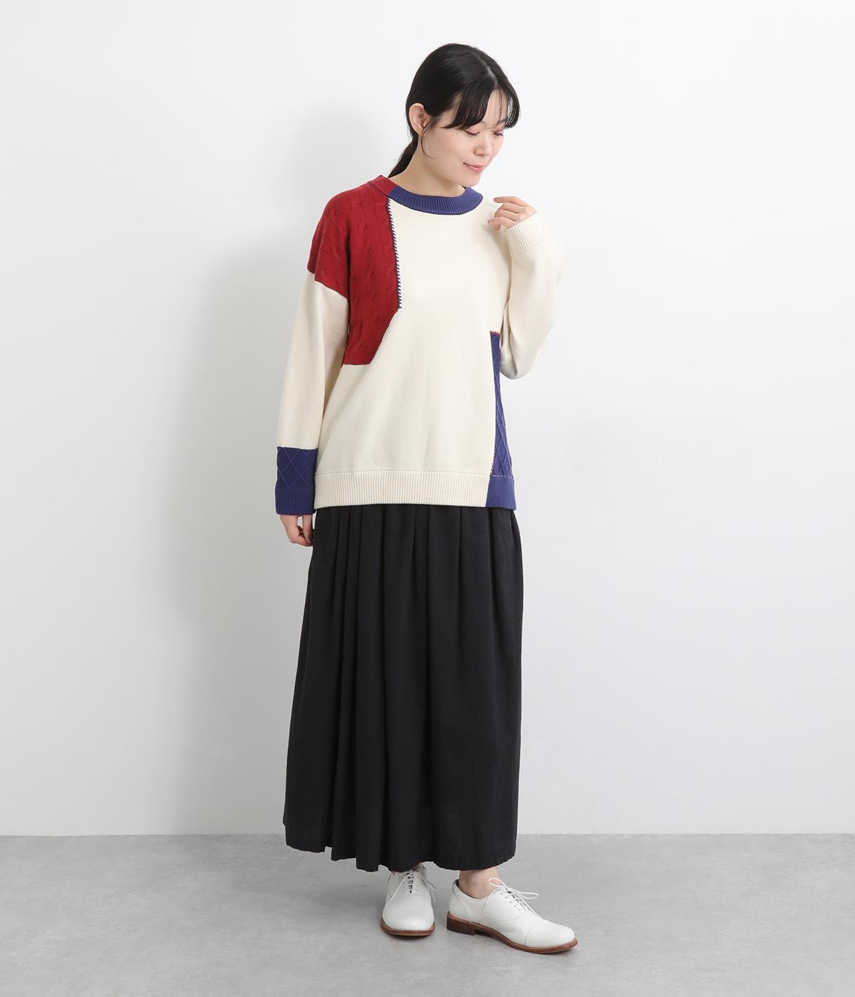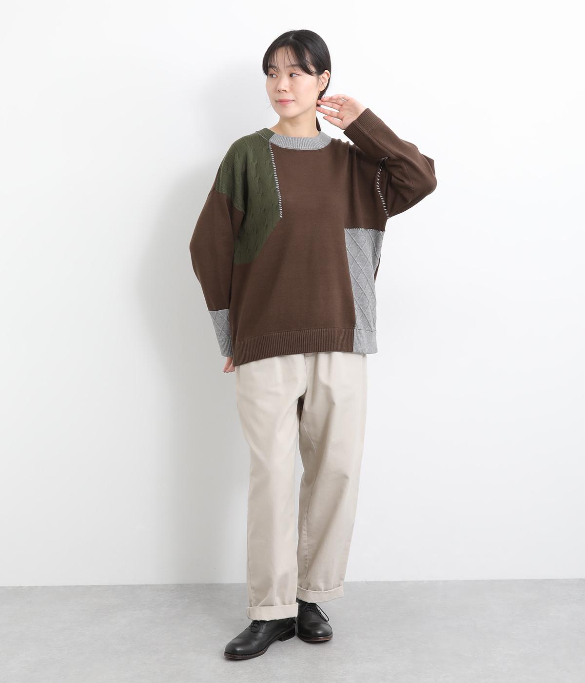 パッチワークのような配色デザインが目を引くプルオーバー。どこかあたたかみを感じるケーブル編みや格子柄、ステッチをあしらっています。体のラインを拾いにくいゆったりとしたサイズ感も◎。一枚で着映えが叶う、頼れるアイテムです。