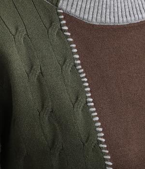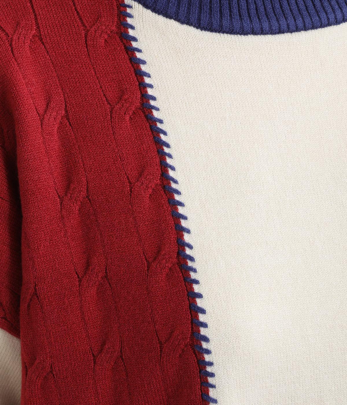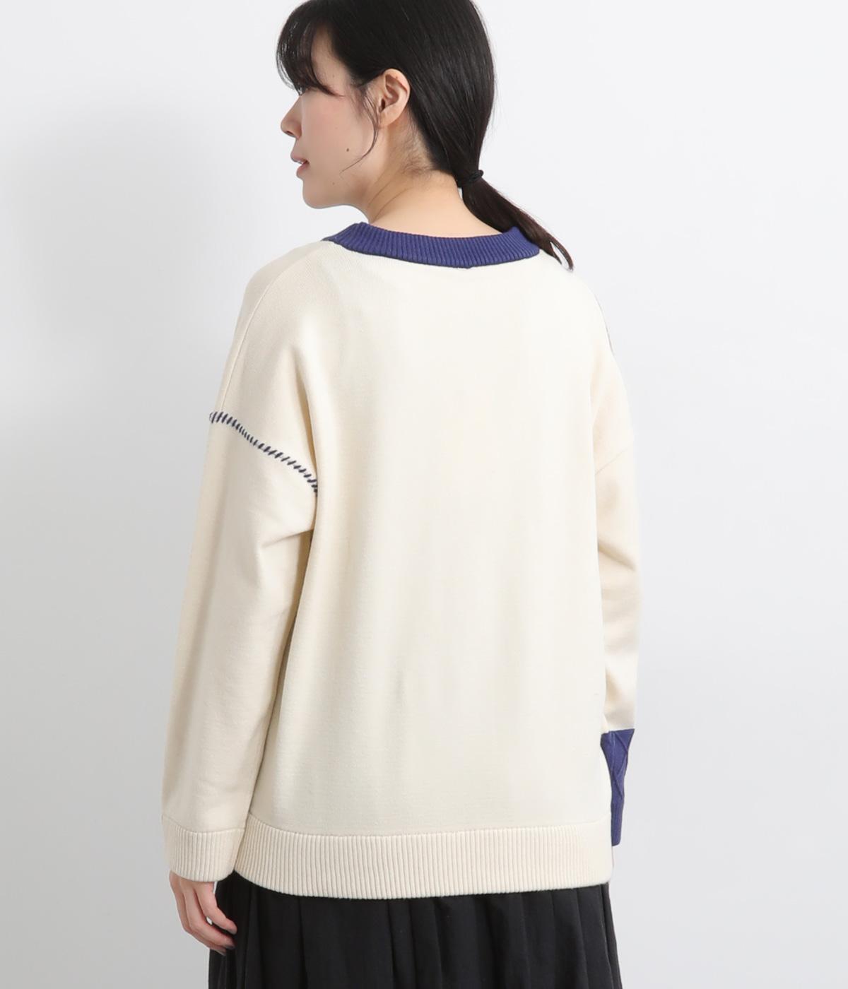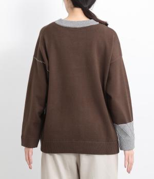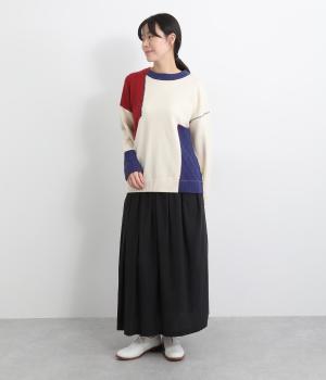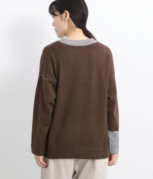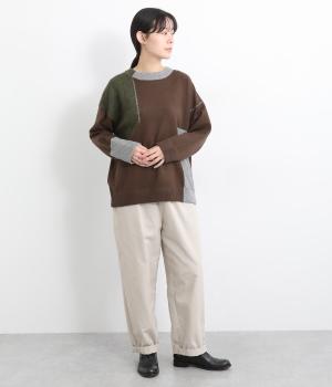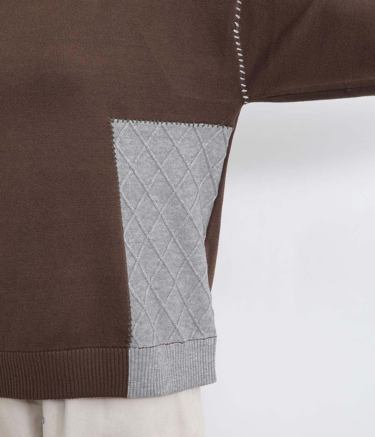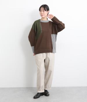 パッチワークのような配色デザインが目を引くプルオーバー。どこかあたたかみを感じるケーブル編みや格子柄、ステッチをあしらっています。体のラインを拾いにくいゆったりとしたサイズ感も◎。一枚で着映えが叶う、頼れるアイテムです。