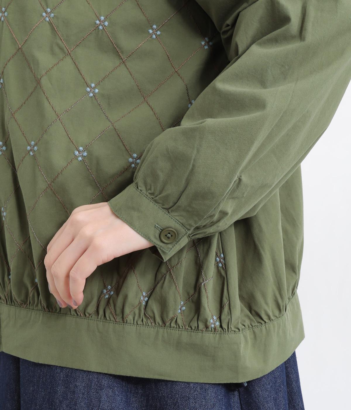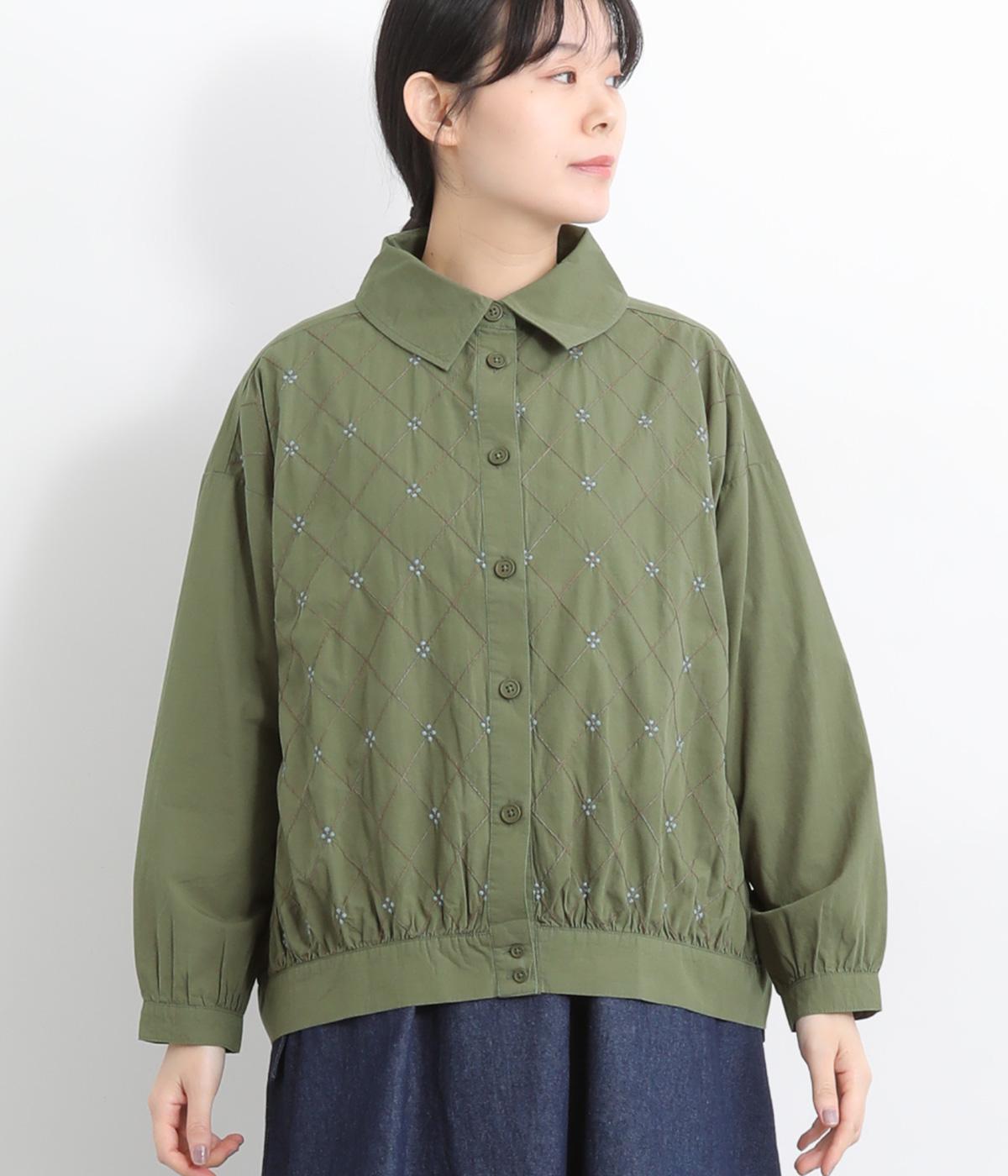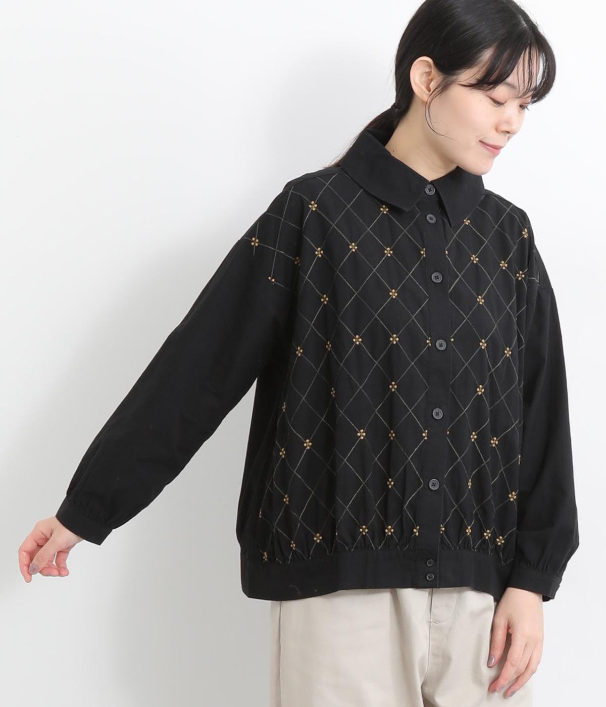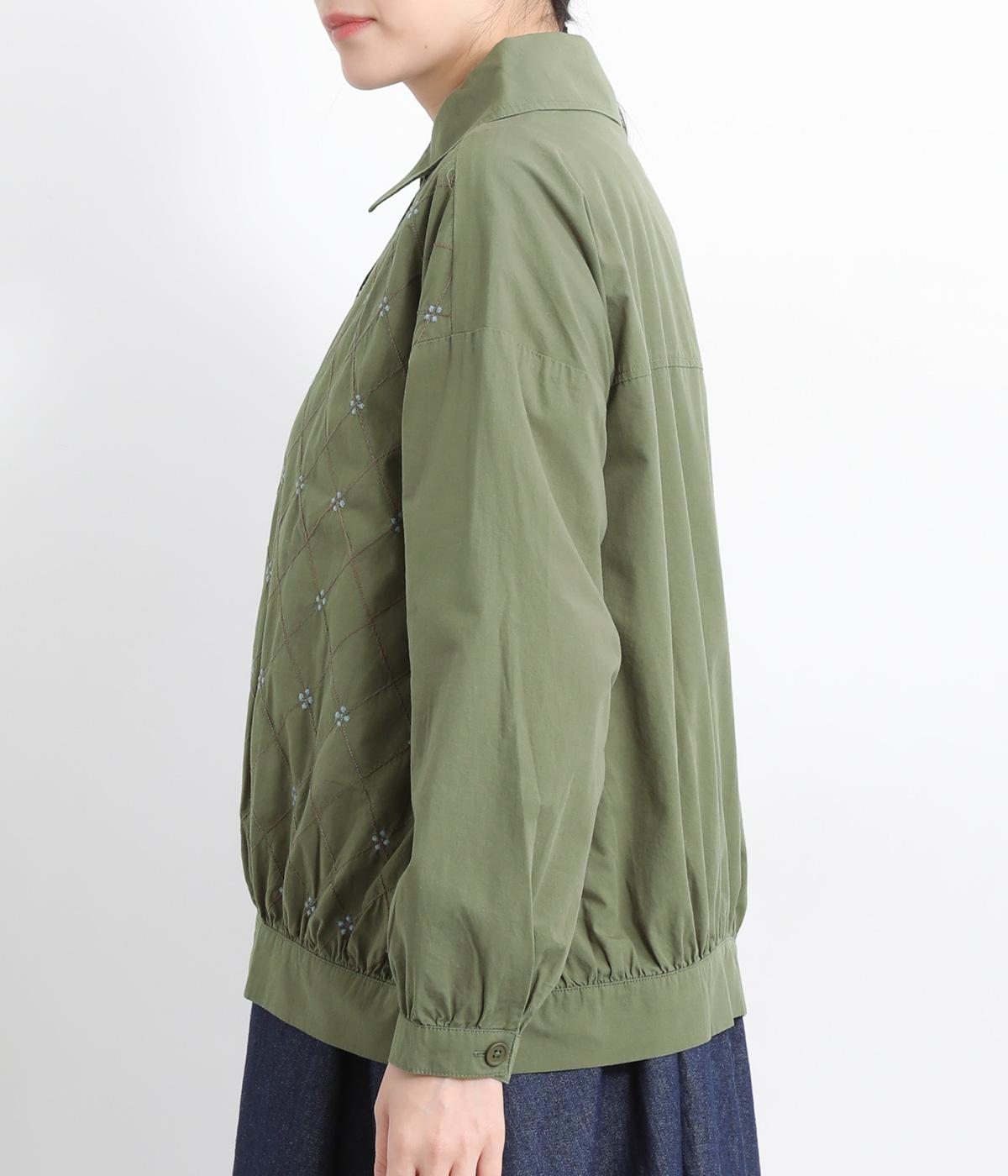 ややハリのあるやわらかなコットン布帛生地で仕立てています。とても軽くさらっと羽織れるので、まだ暑さの残る季節の変わり目にも◎。格子柄にお花を組み合わせた刺しゅうをあしらっています。