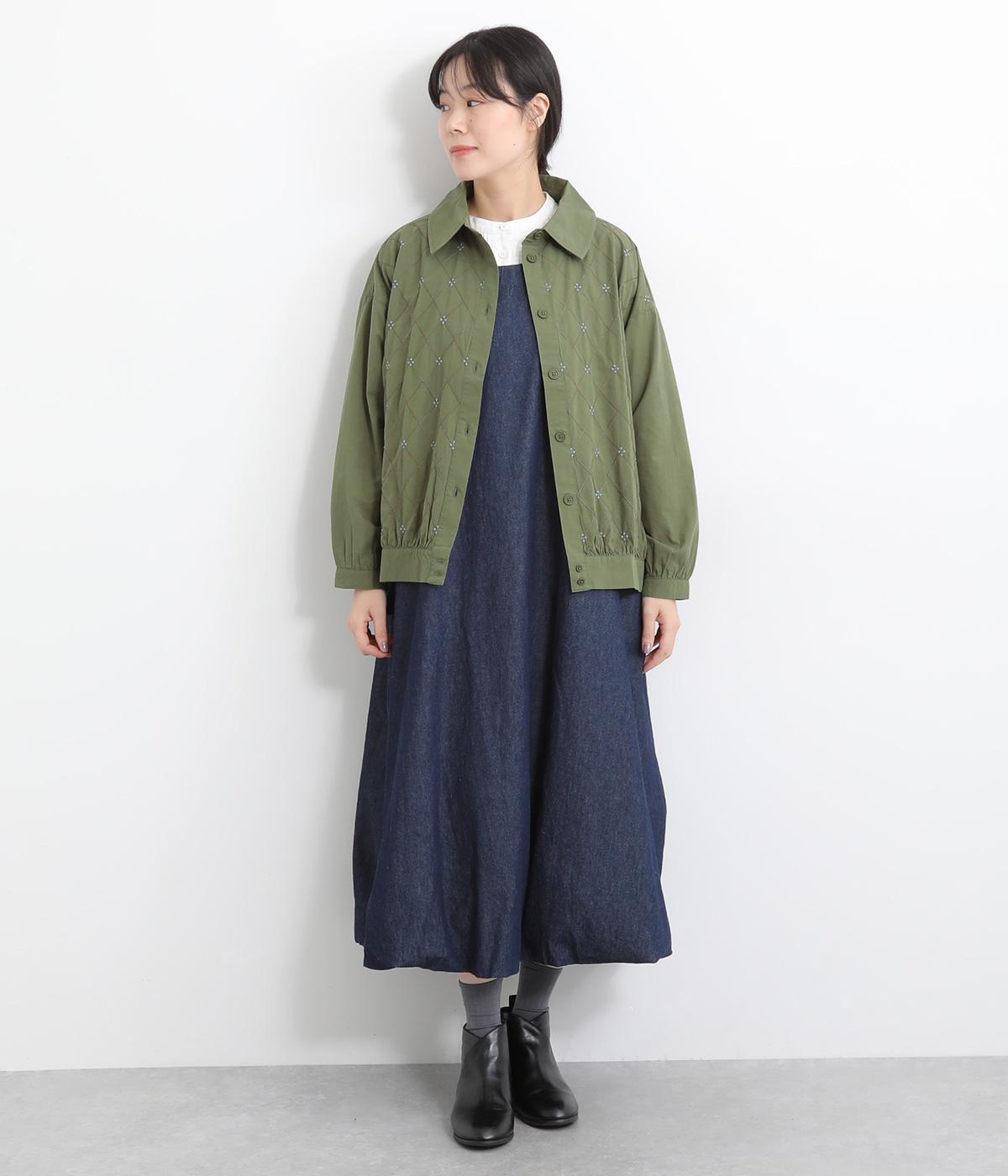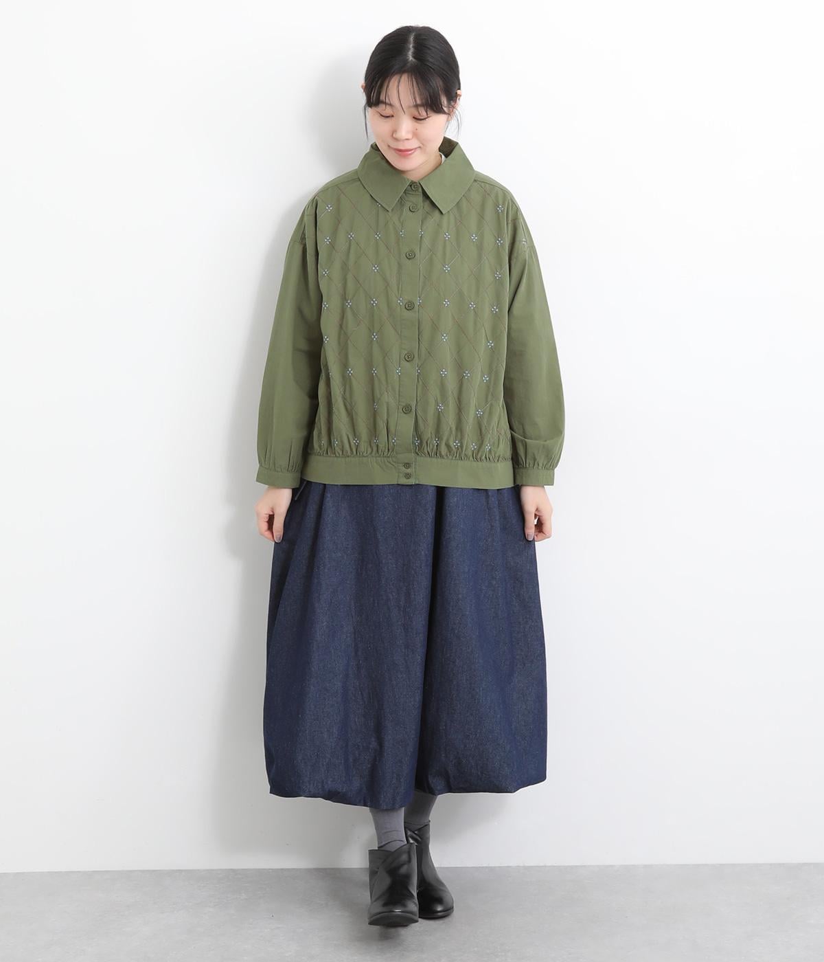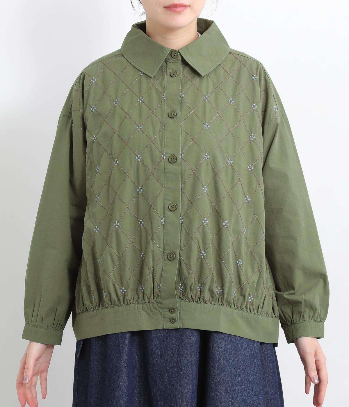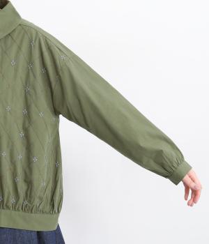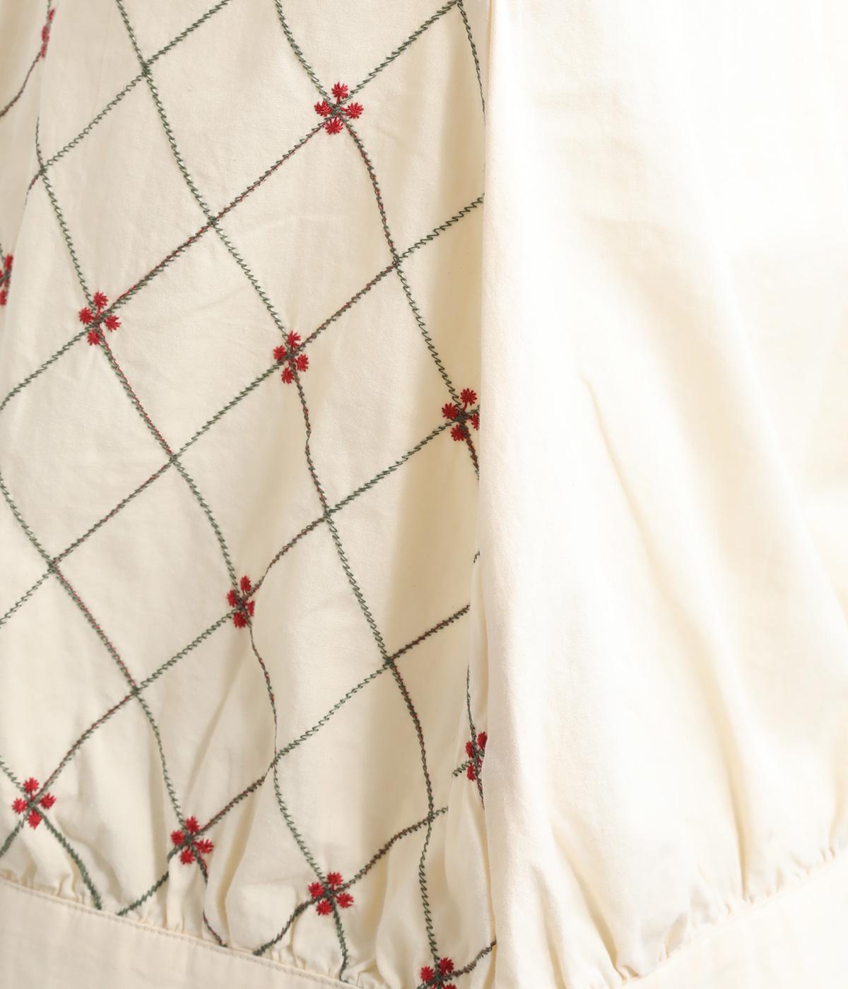 ややハリのあるやわらかなコットン布帛生地で仕立てています。とても軽くさらっと羽織れるので、まだ暑さの残る季節の変わり目にも◎。格子柄にお花を組み合わせた刺しゅうをあしらっています。