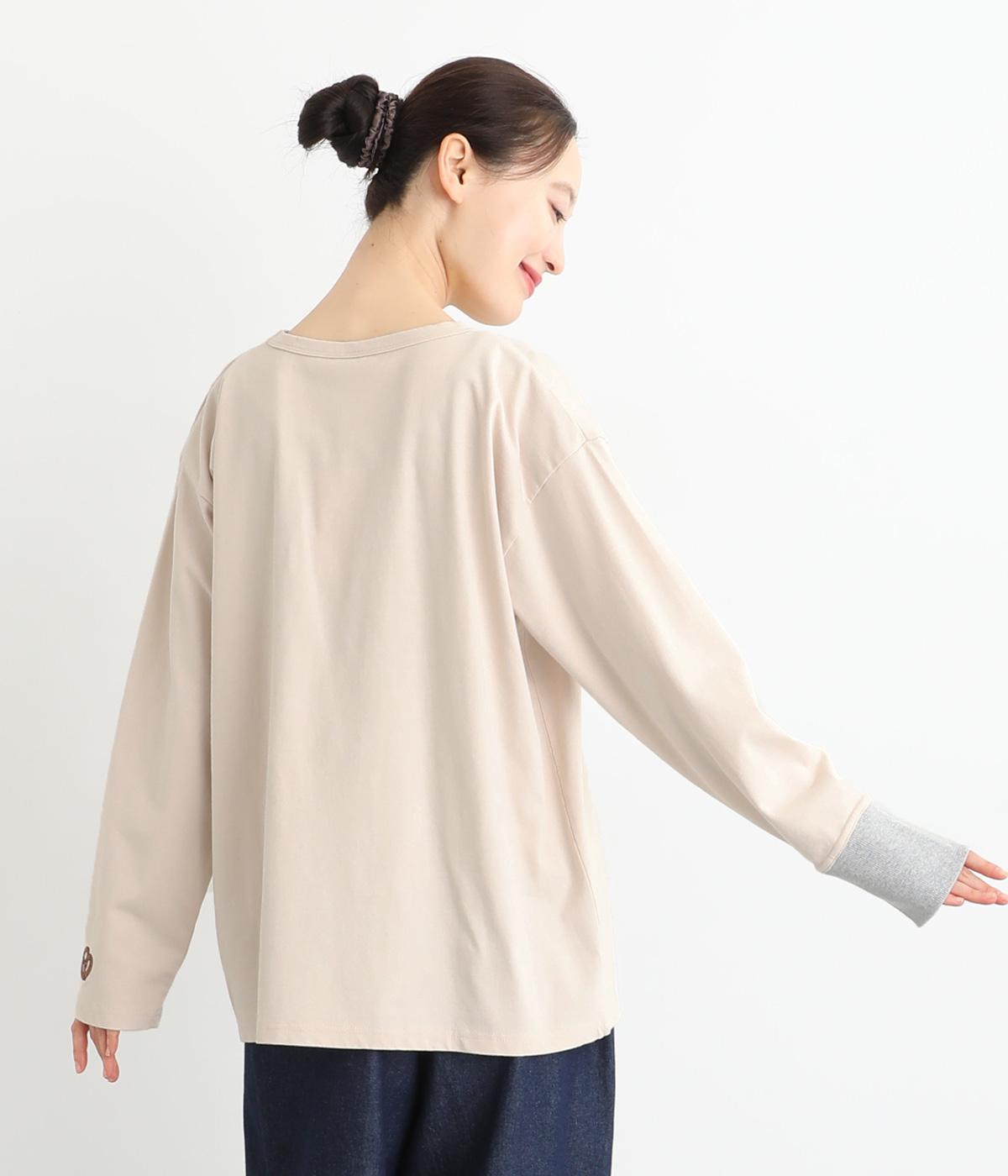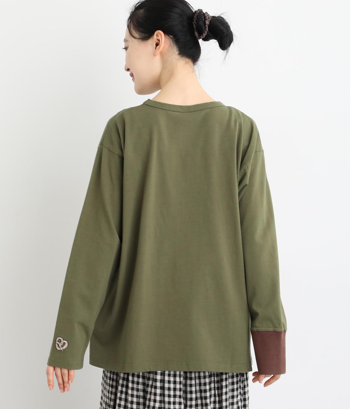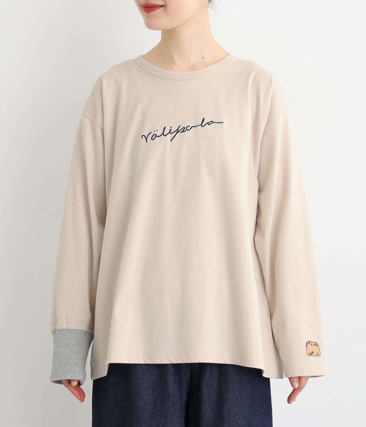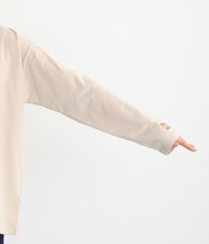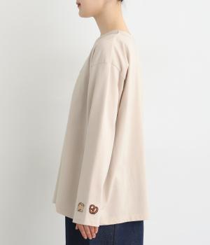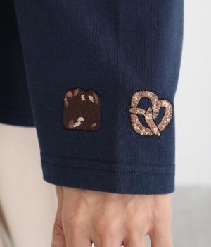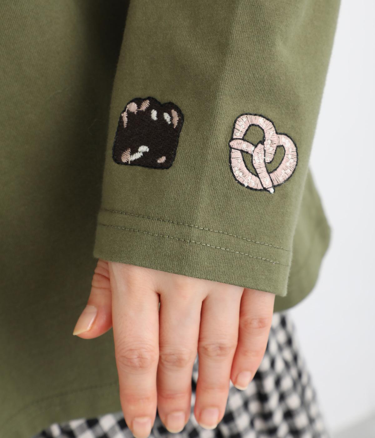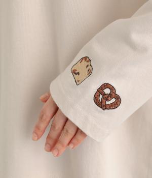片方だけ太いリブ仕様の袖口が目をひくデザイン。もう片方には、ほんわかした雰囲気のおやつ模様の刺しゅうをほどこしました。胸にもロゴ刺しゅうを入れ、シンプルなシルエットに個性が散りばめられた一枚です。