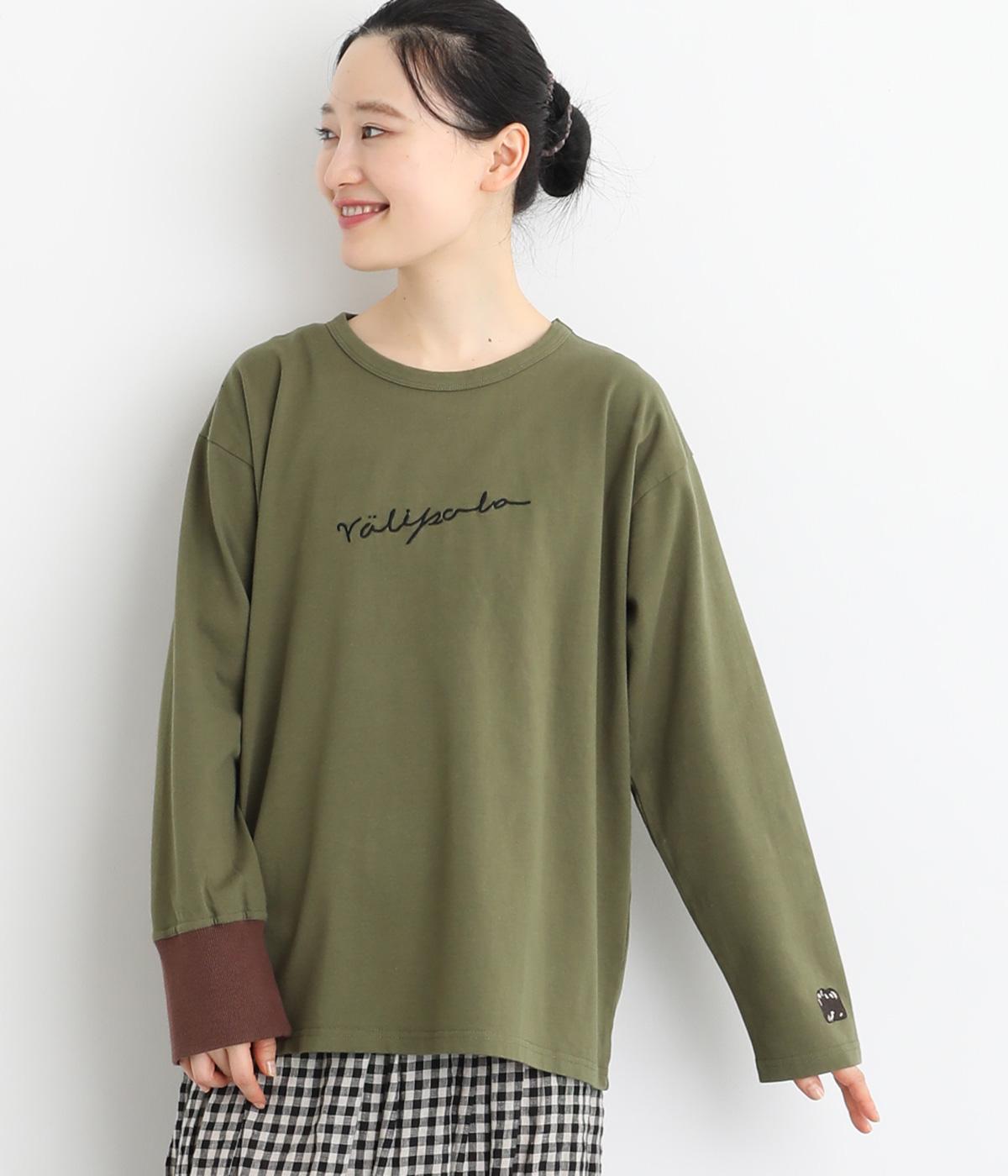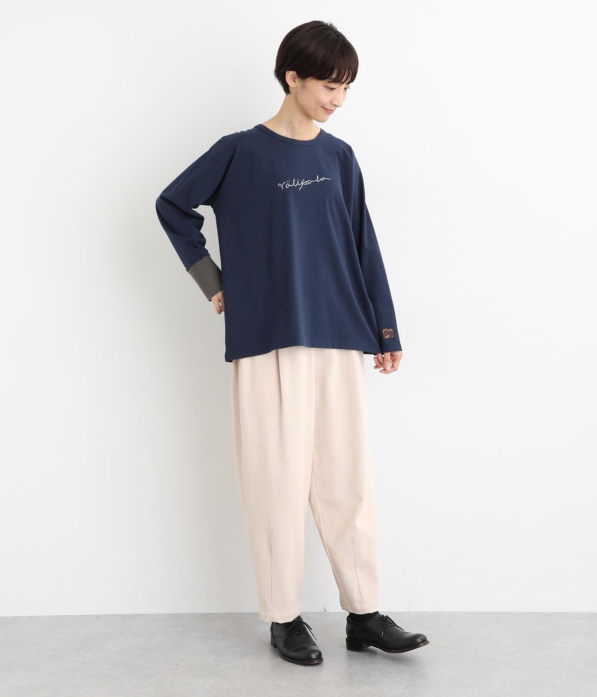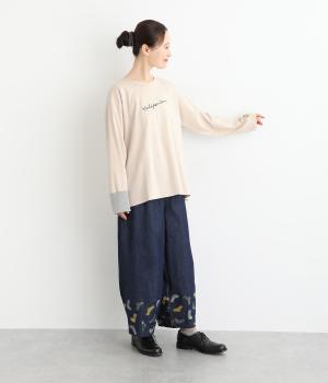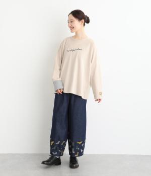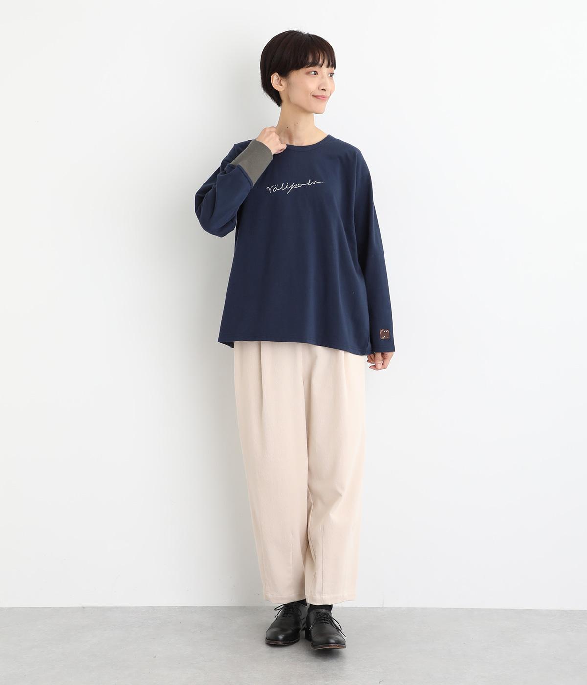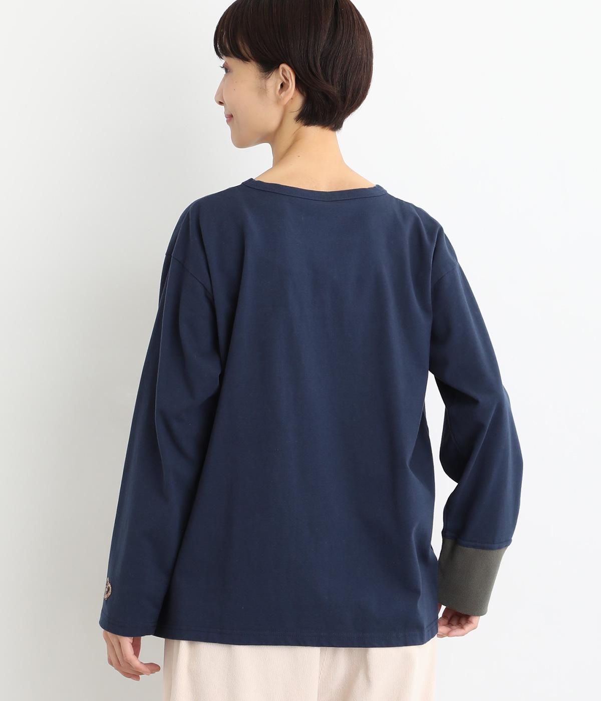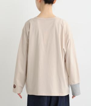片方だけ太いリブ仕様の袖口が目をひくデザイン。もう片方には、ほんわかした雰囲気のおやつ模様の刺しゅうをほどこしました。胸にもロゴ刺しゅうを入れ、シンプルなシルエットに個性が散りばめられた一枚です。