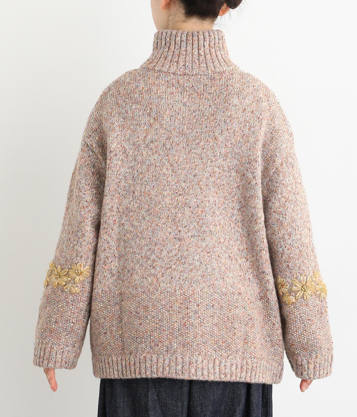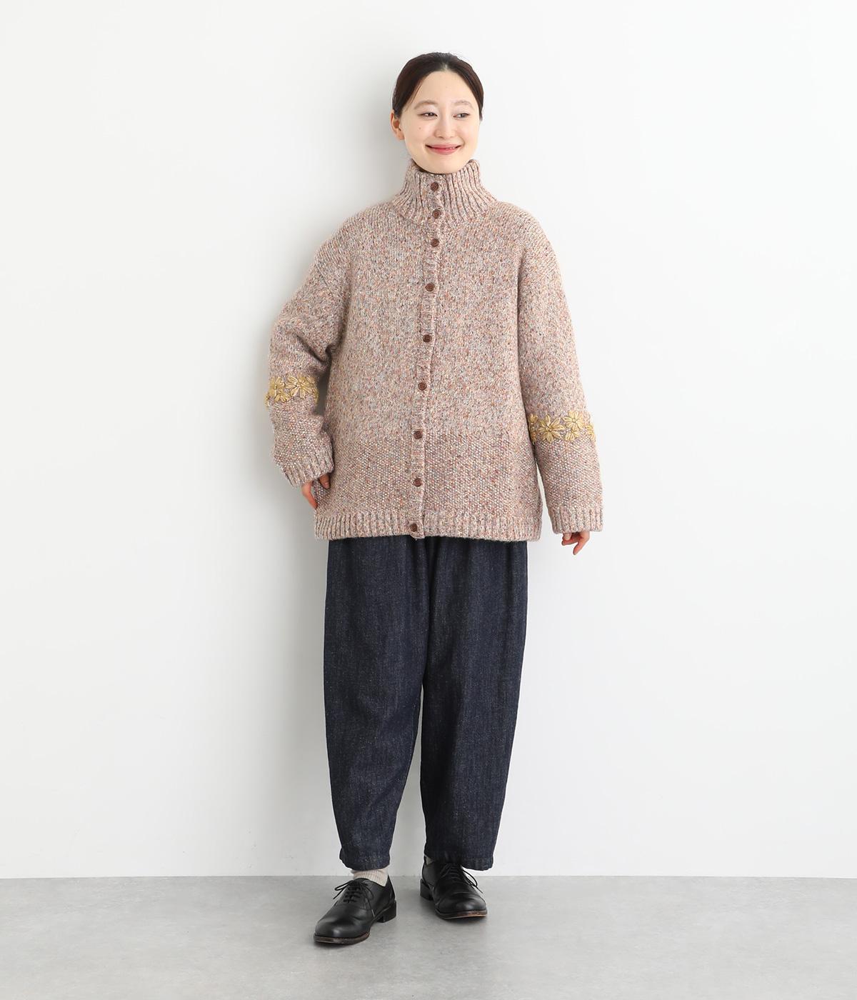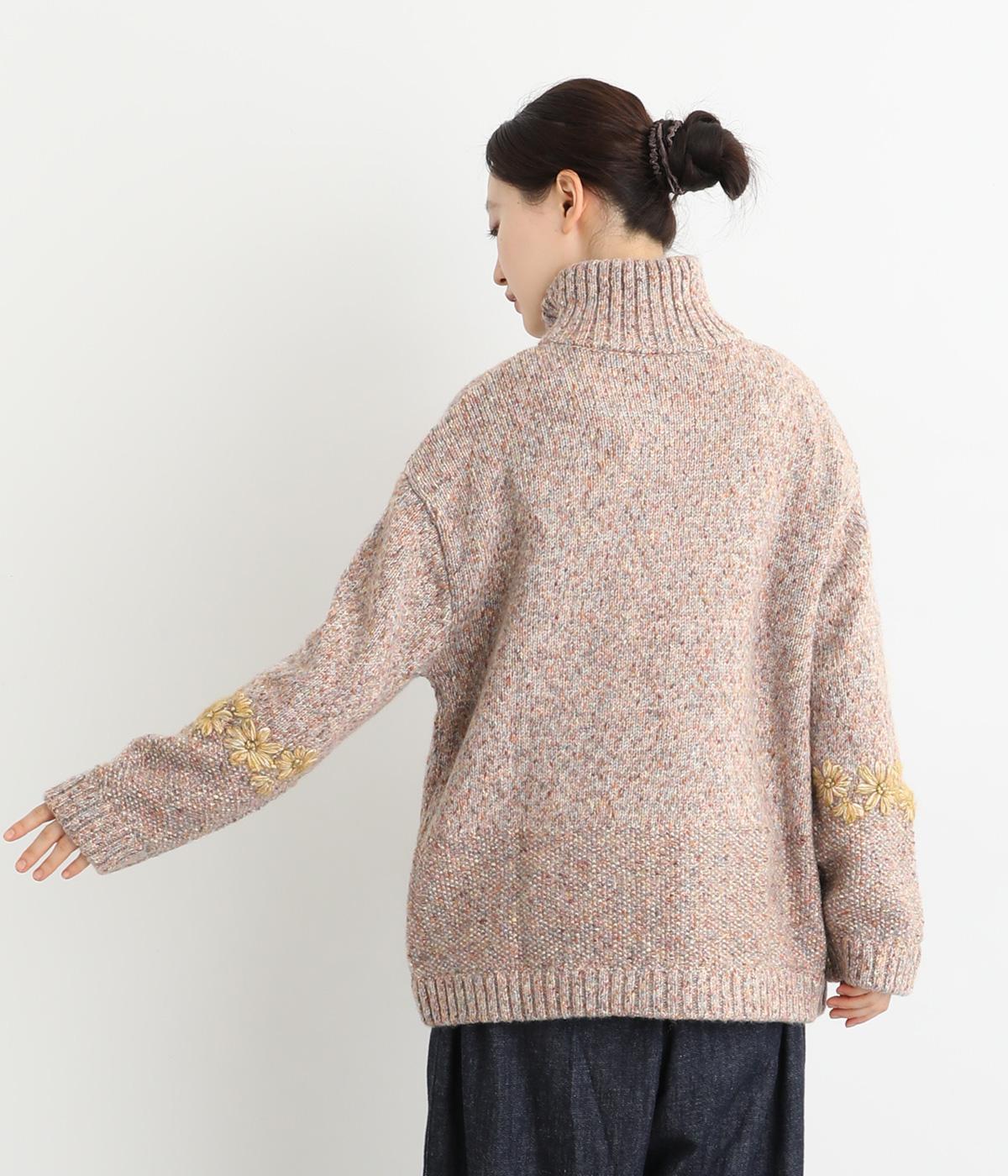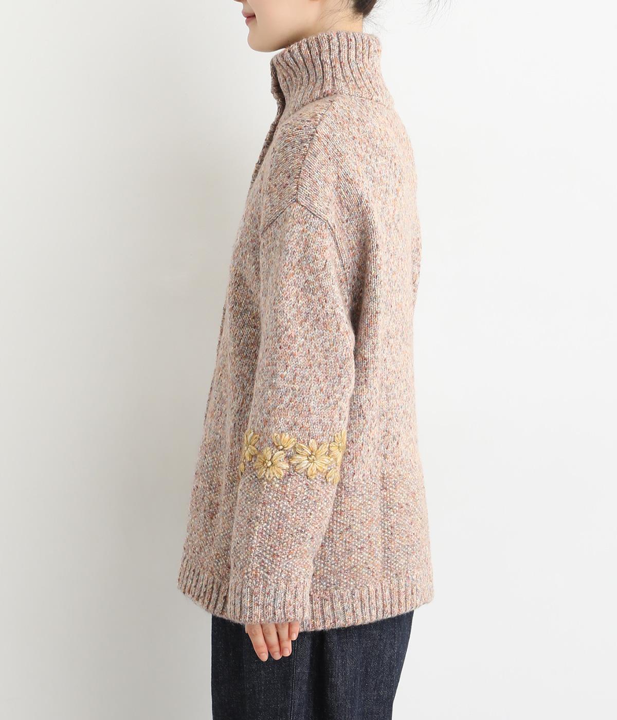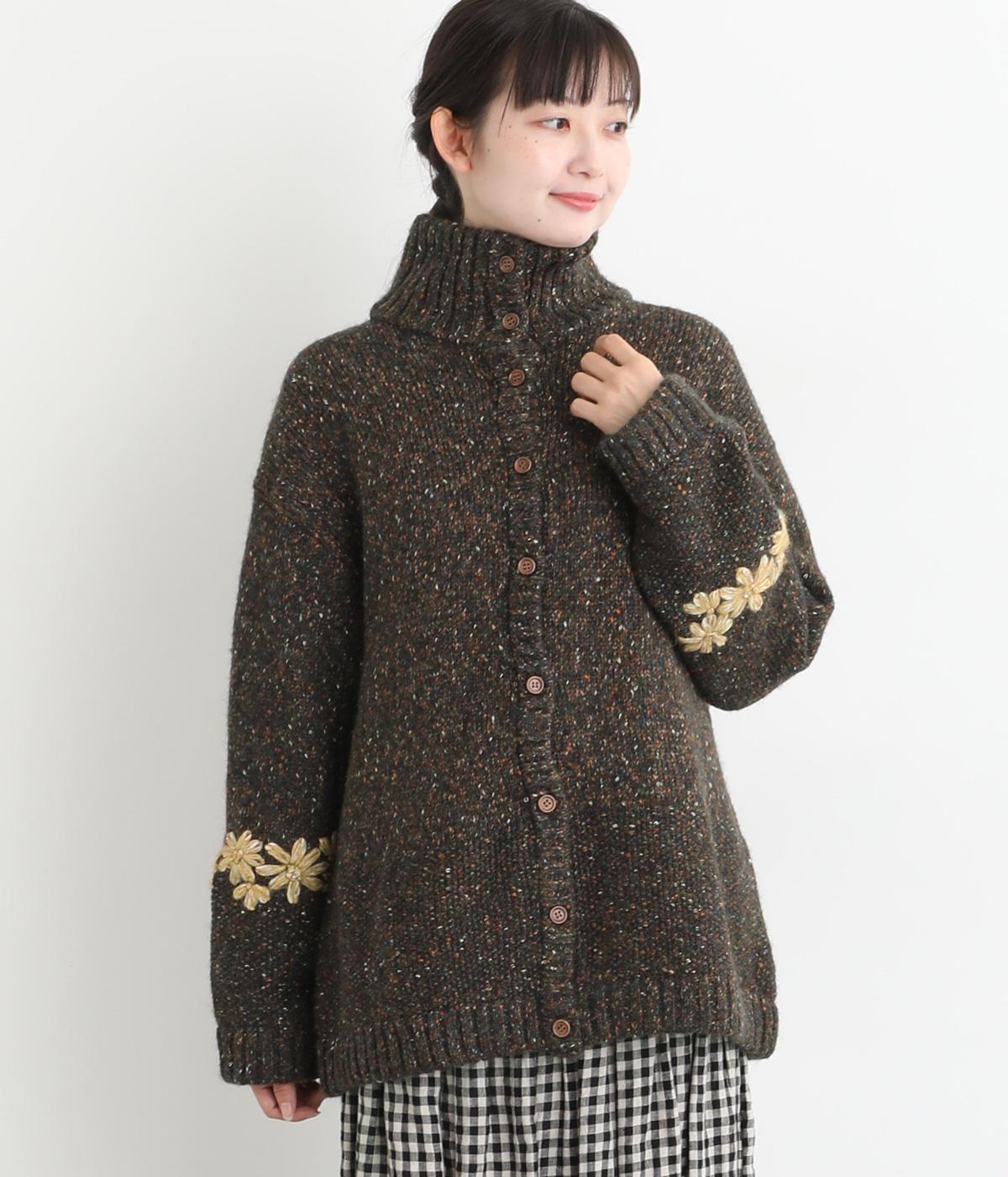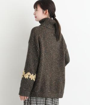 袖にぐるりと入れた花柄刺しゅうがデザインのポイントになっています。ハイネックがあたたかさをキープしながら、顔まわりをすっきり見せてくれます。サラッと羽織るだけでサマになる一枚です。