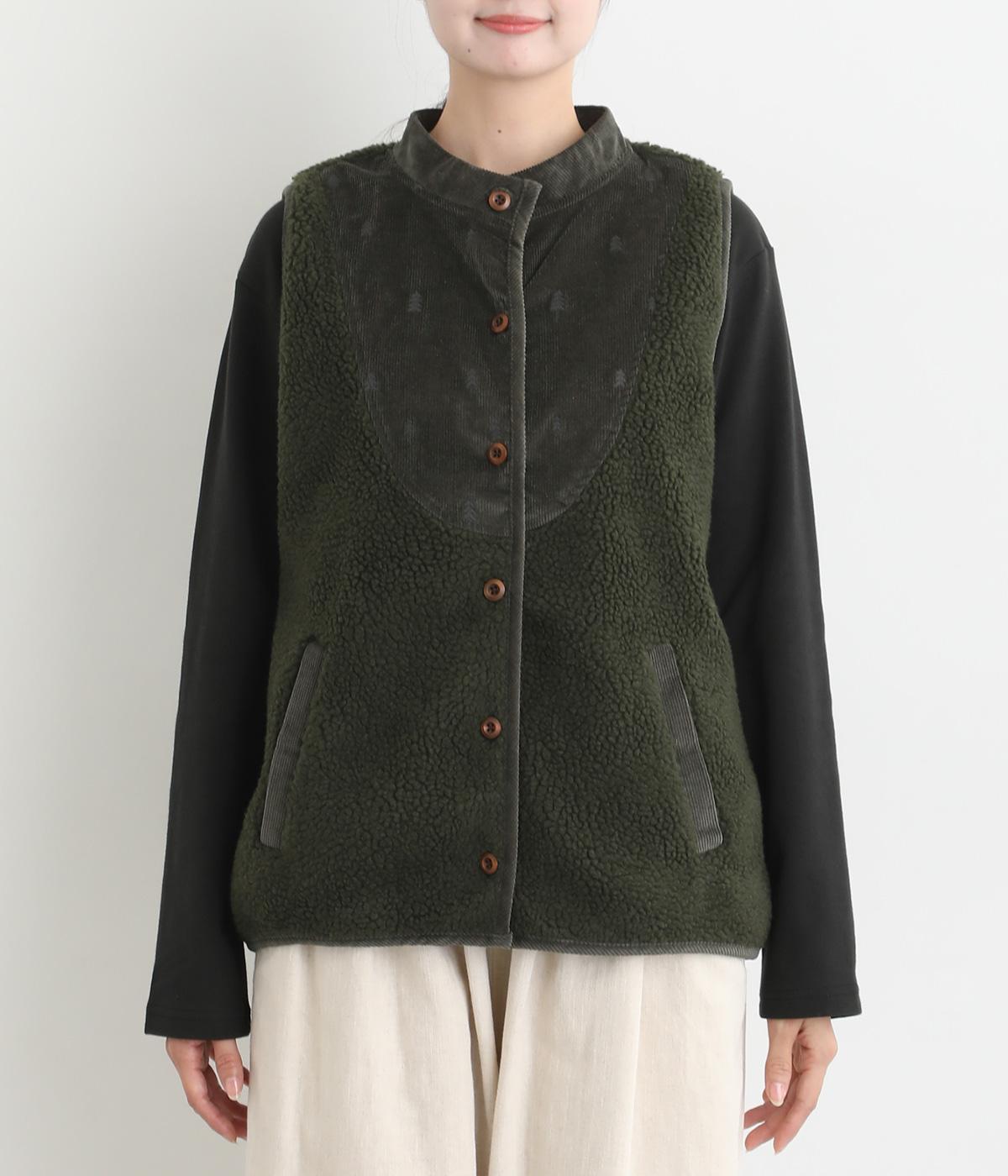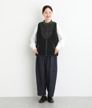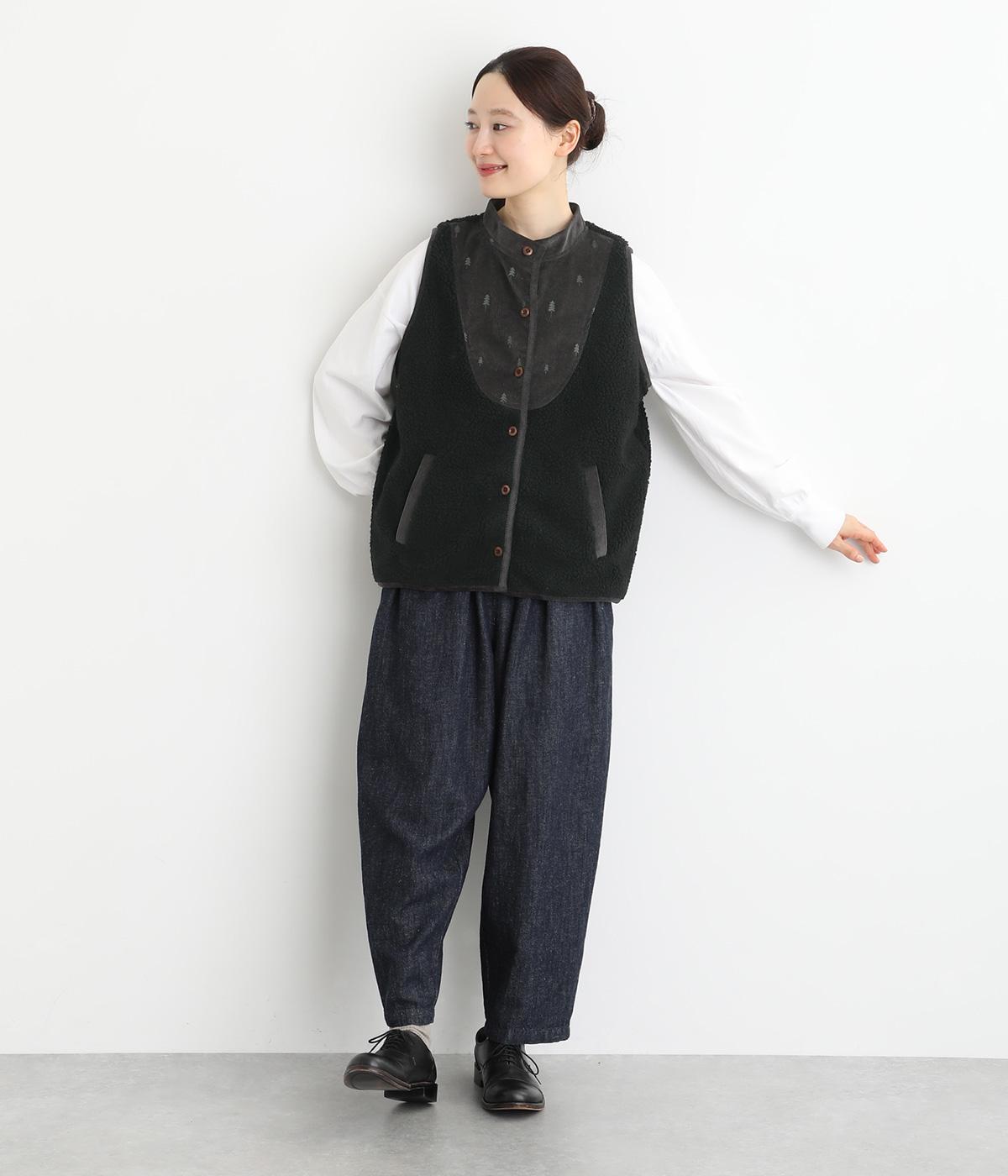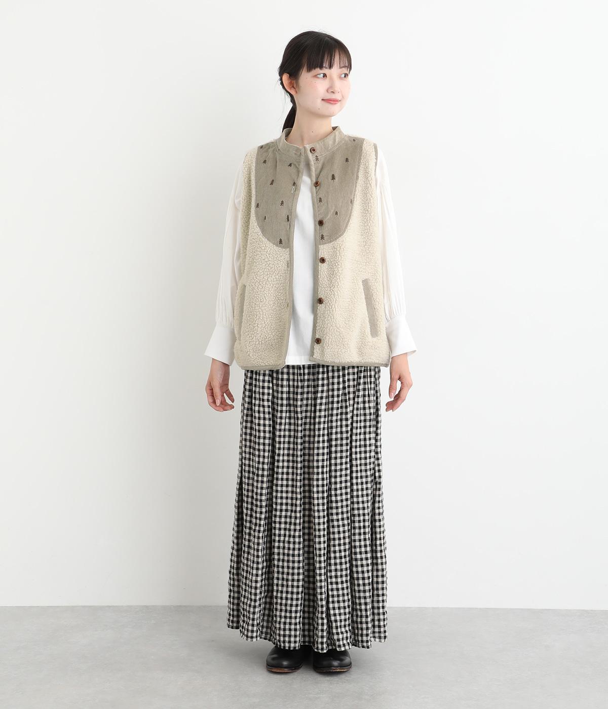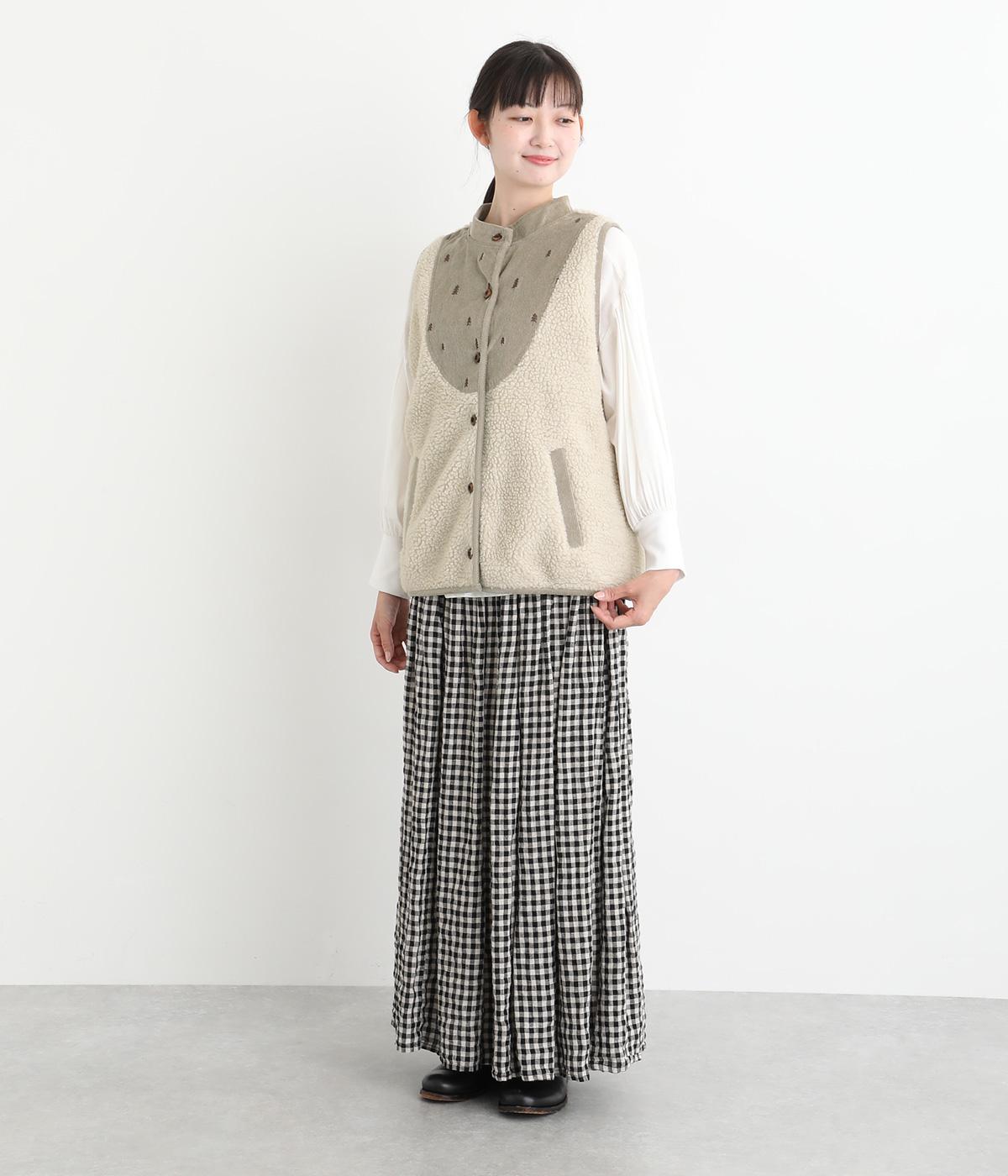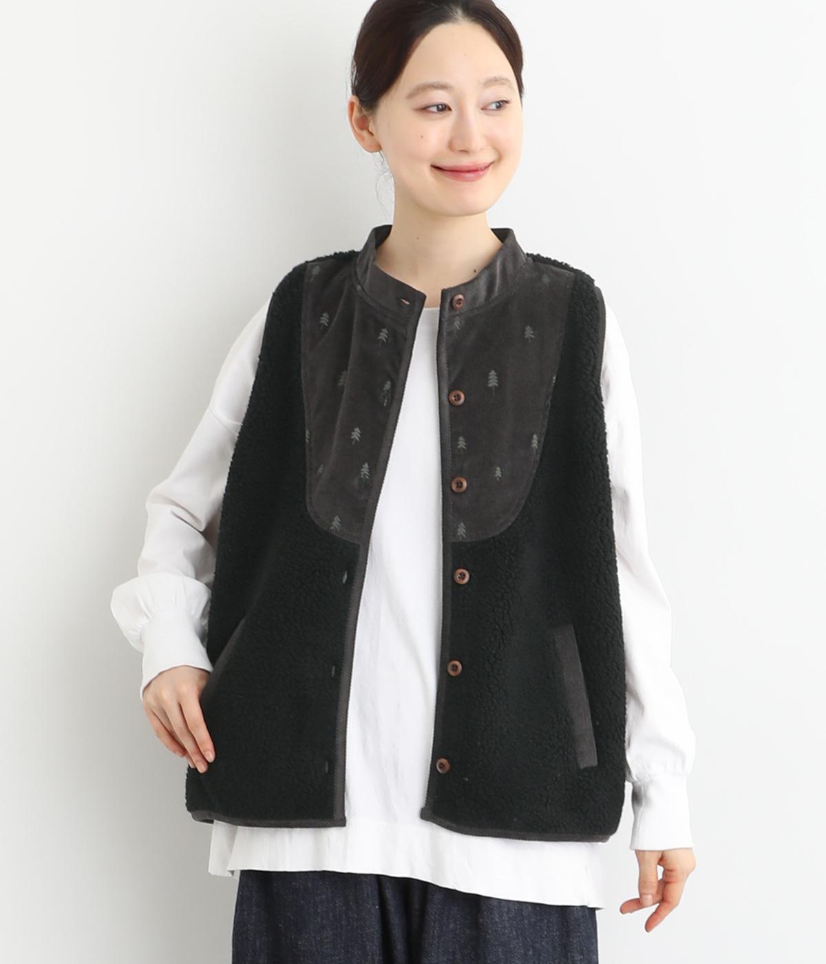 ブザム風の切り替え仕立てが個性的なボアベストです。素朴な木の柄の刺しゅうも自然な風合いを演出しています。カジュアルなボアベストにかわいらしさを添えた一枚です。前を開けてさらりと羽織るだけでもサマになります。
