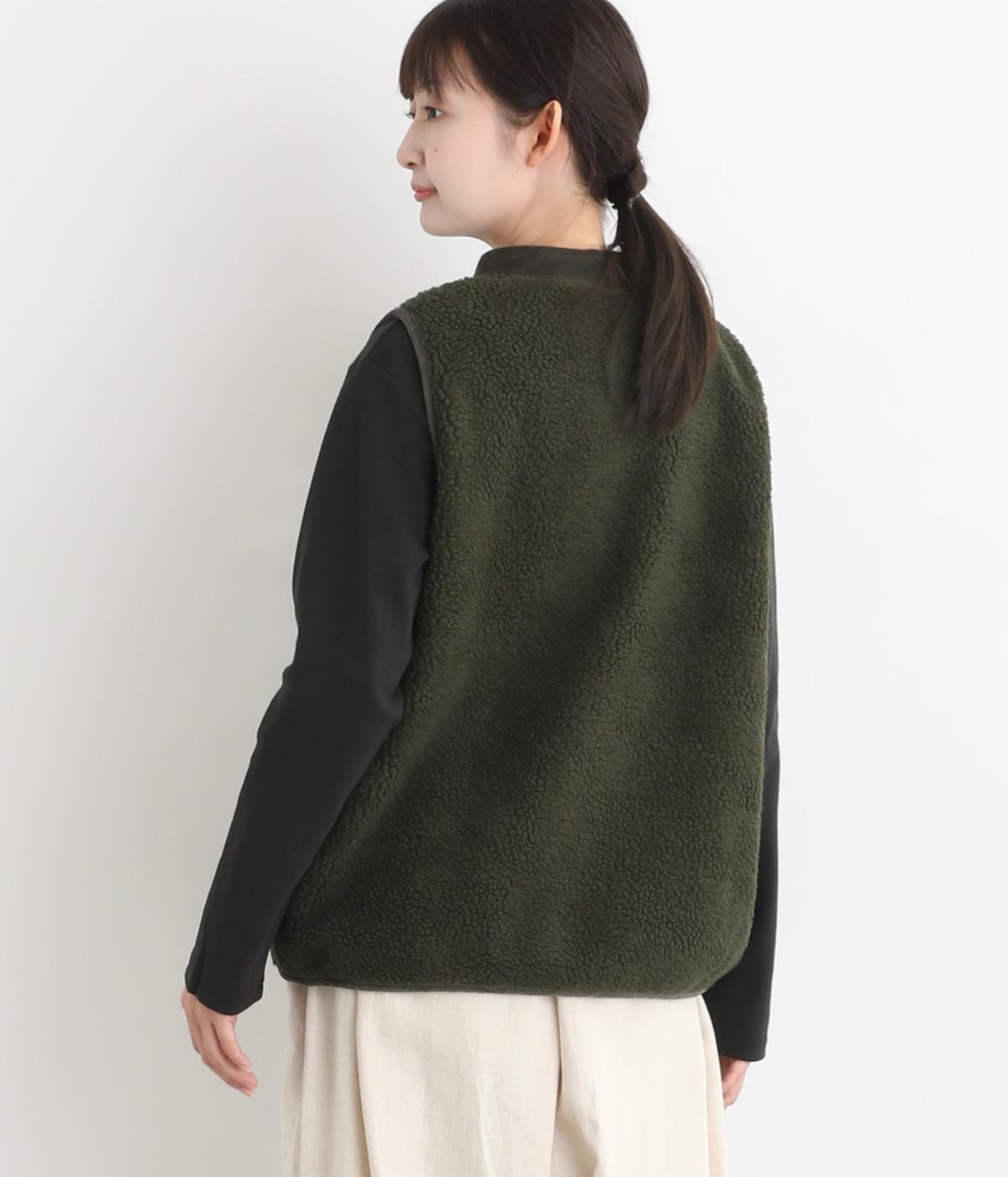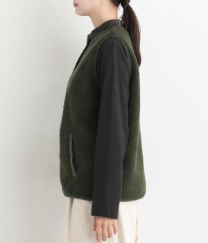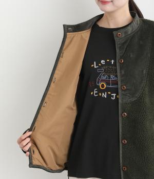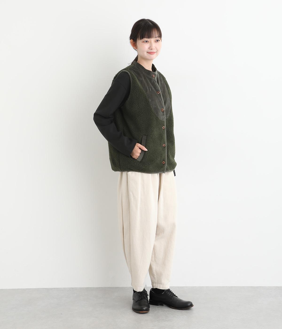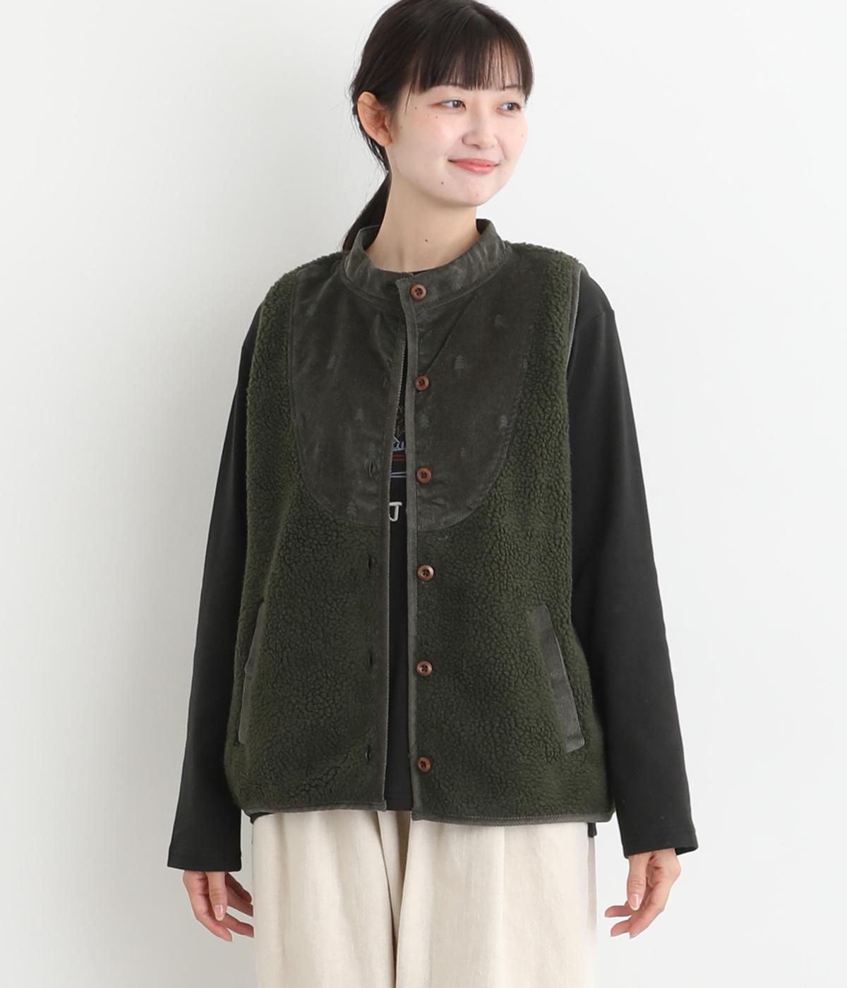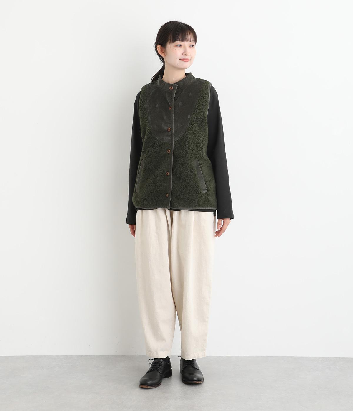 ブザム風の切り替え仕立てが個性的なボアベストです。素朴な木の柄の刺しゅうも自然な風合いを演出しています。カジュアルなボアベストにかわいらしさを添えた一枚です。前を開けてさらりと羽織るだけでもサマになります。