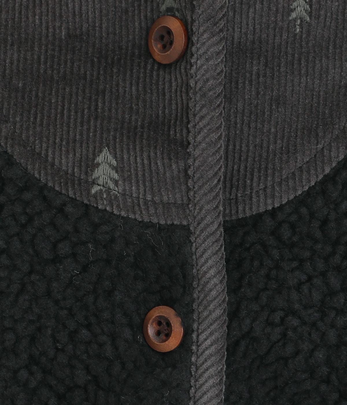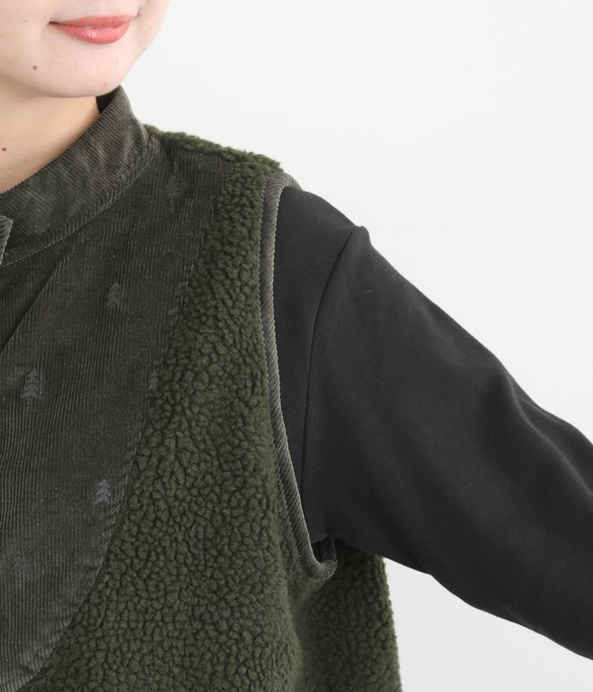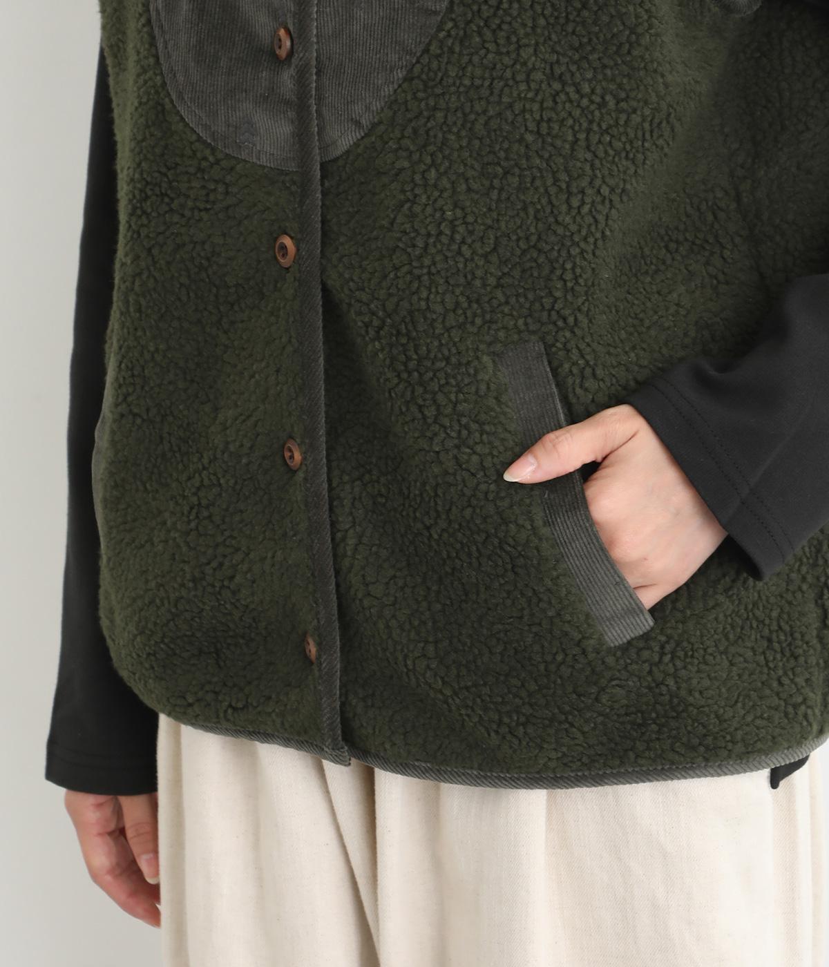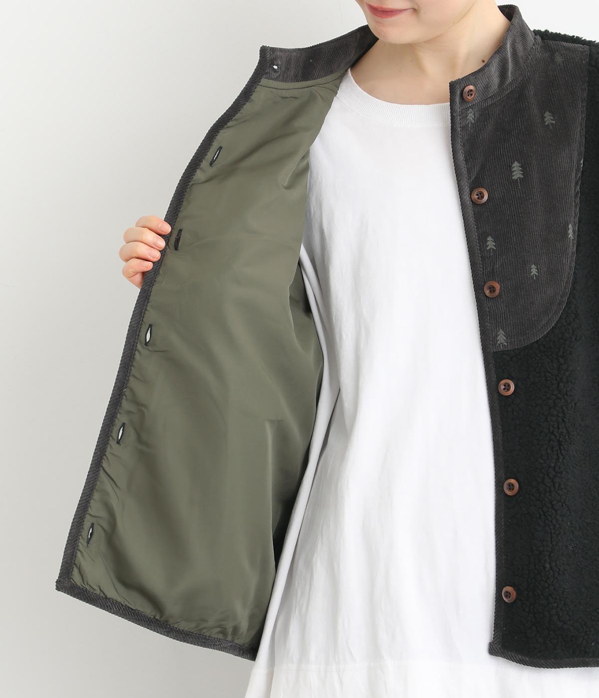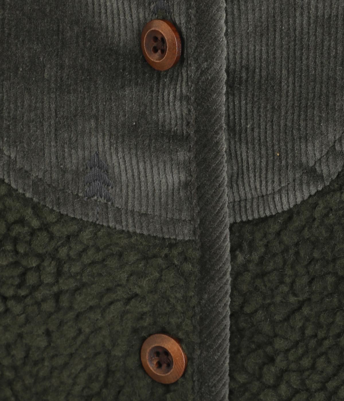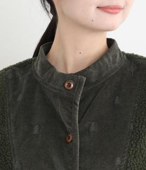 ぽこぽことした表情のボア生地にコーデュロイのブザム風の切り替えを合わせました。異素材があたたかみのある風合いにまとまっています。