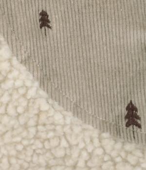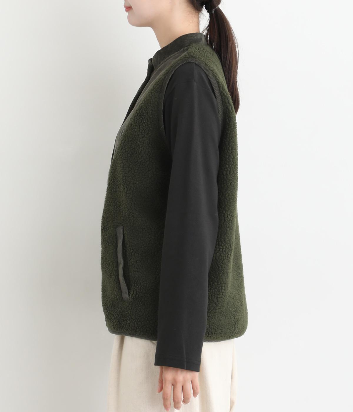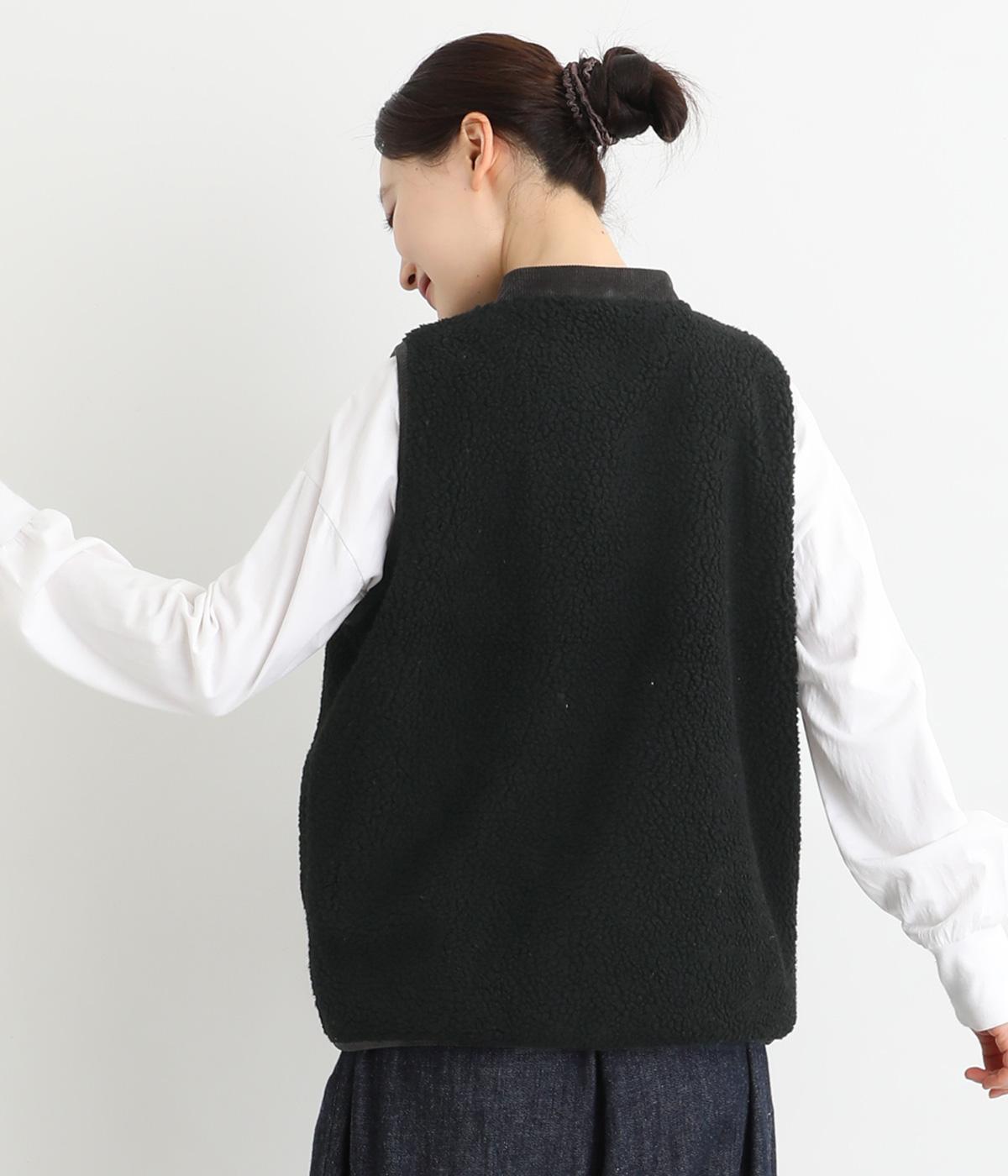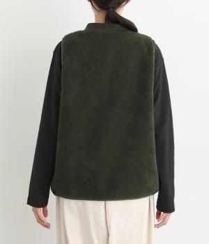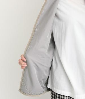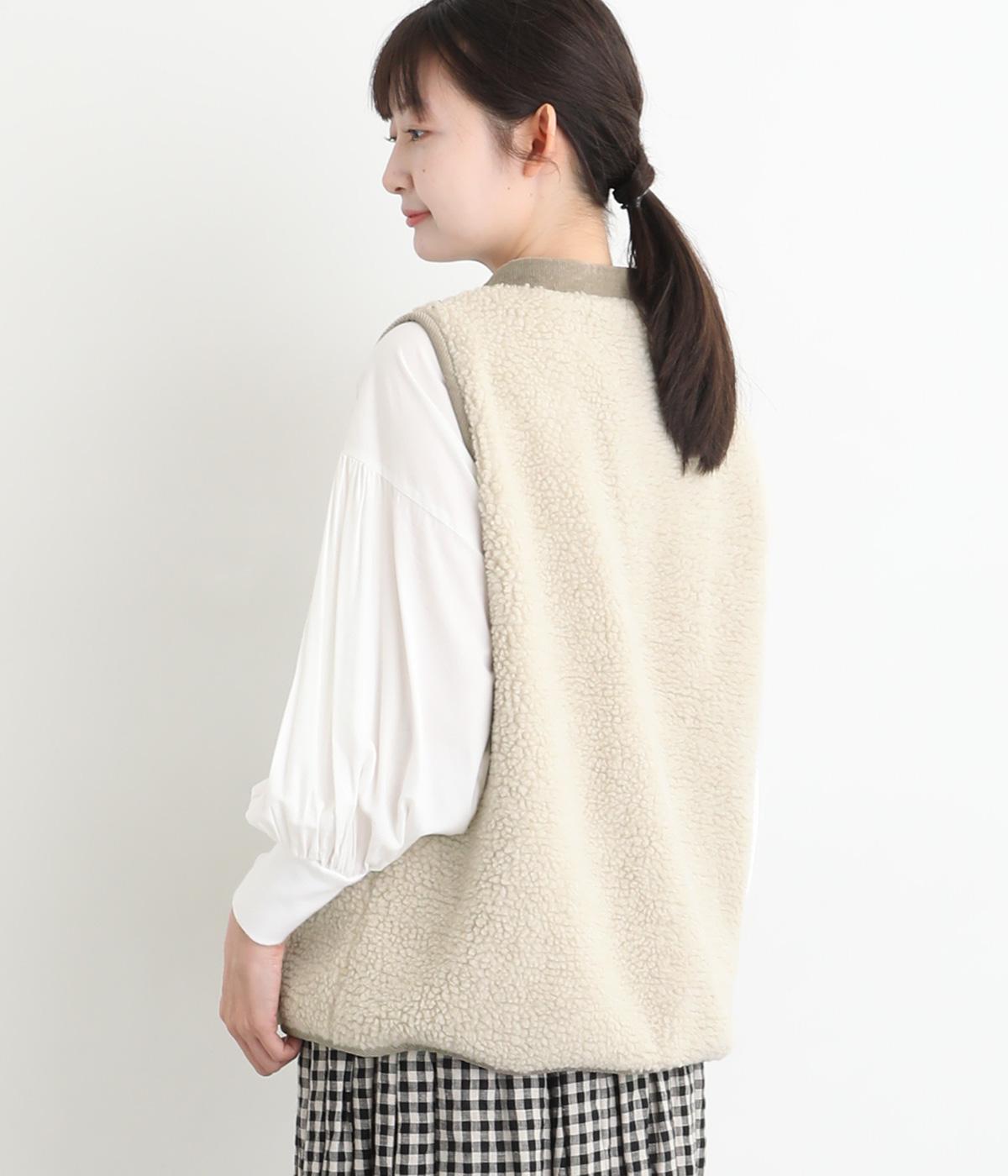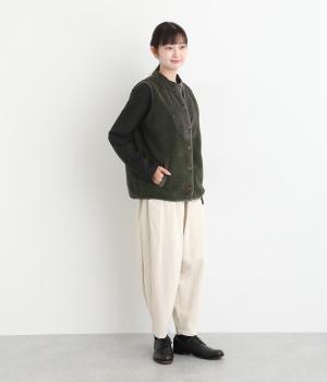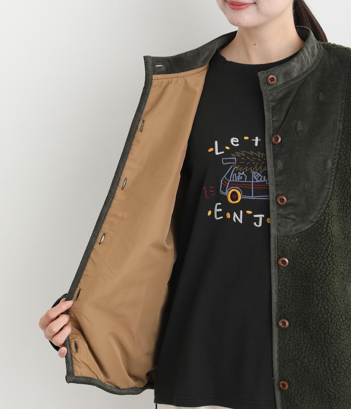 ぽこぽことした表情のボア生地にコーデュロイのブザム風の切り替えを合わせました。異素材があたたかみのある風合いにまとまっています。